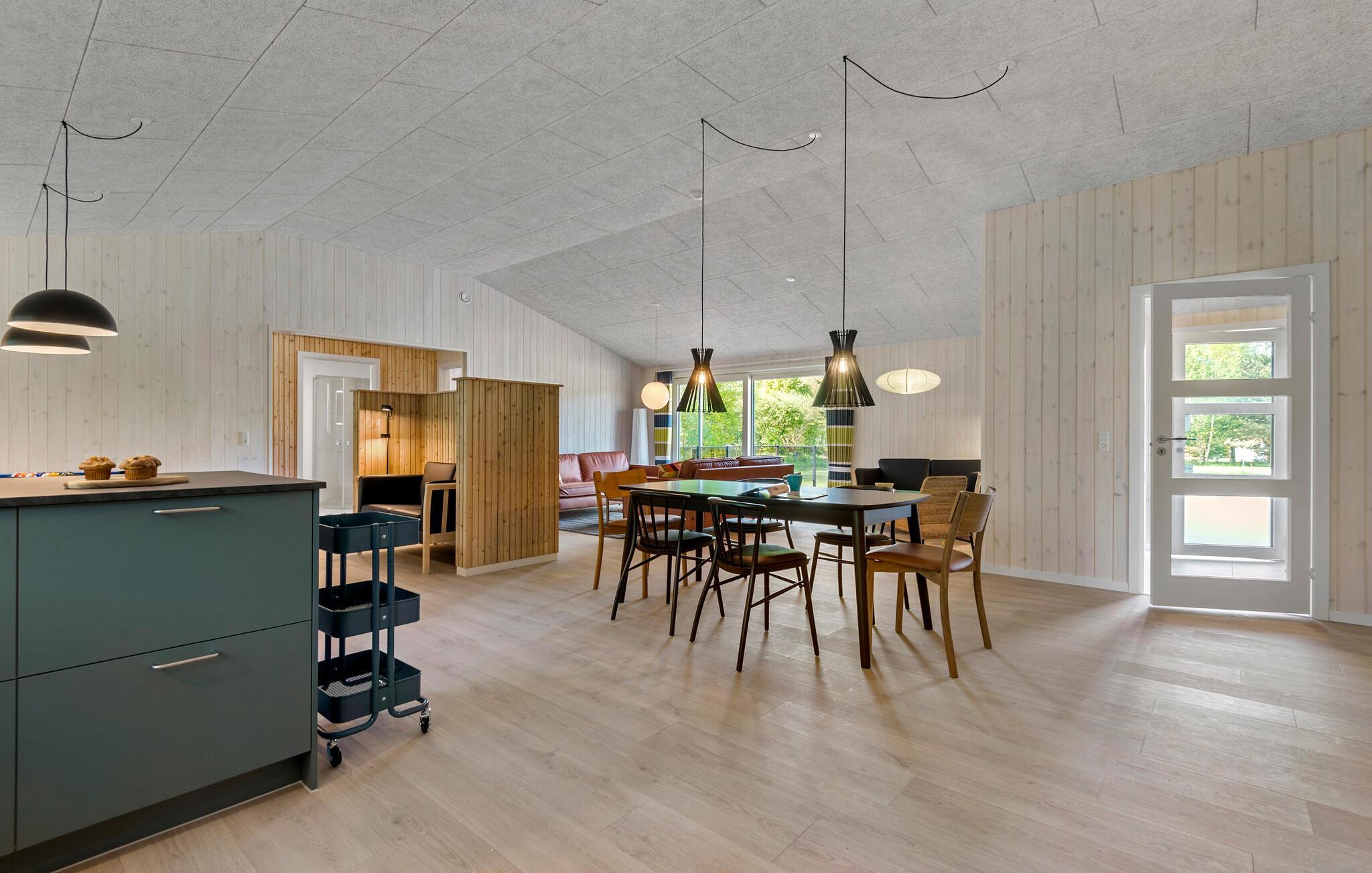 Forkæl jer selv med afslappende dage i jeres hyggelige feriehus, hvor en smuk kombination af fred, komfort og nærhed til naturen venter jer. Indenfor vil I blive mødt af en stilfuld atmosfære, der giver huset en behagelig atmosfære. Slap af i den rummelige opholdsstue, hvis store vinduesparti ikke kun lukker masser af lys ind, men også åbner op for udsigten til grønne områder. I det rummelige, åbne køkken har I alle muligheder for at fremtrylle kulinariske lækkerier sammen. Bagefter kan I nyde dem i den tilstødende spisestue, ideel til afslappende aftener med familien. Der er et poolbord og et bordfodboldbord til rådighed til underholdende timer.