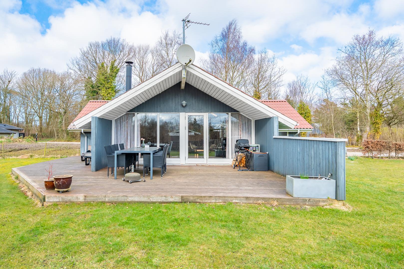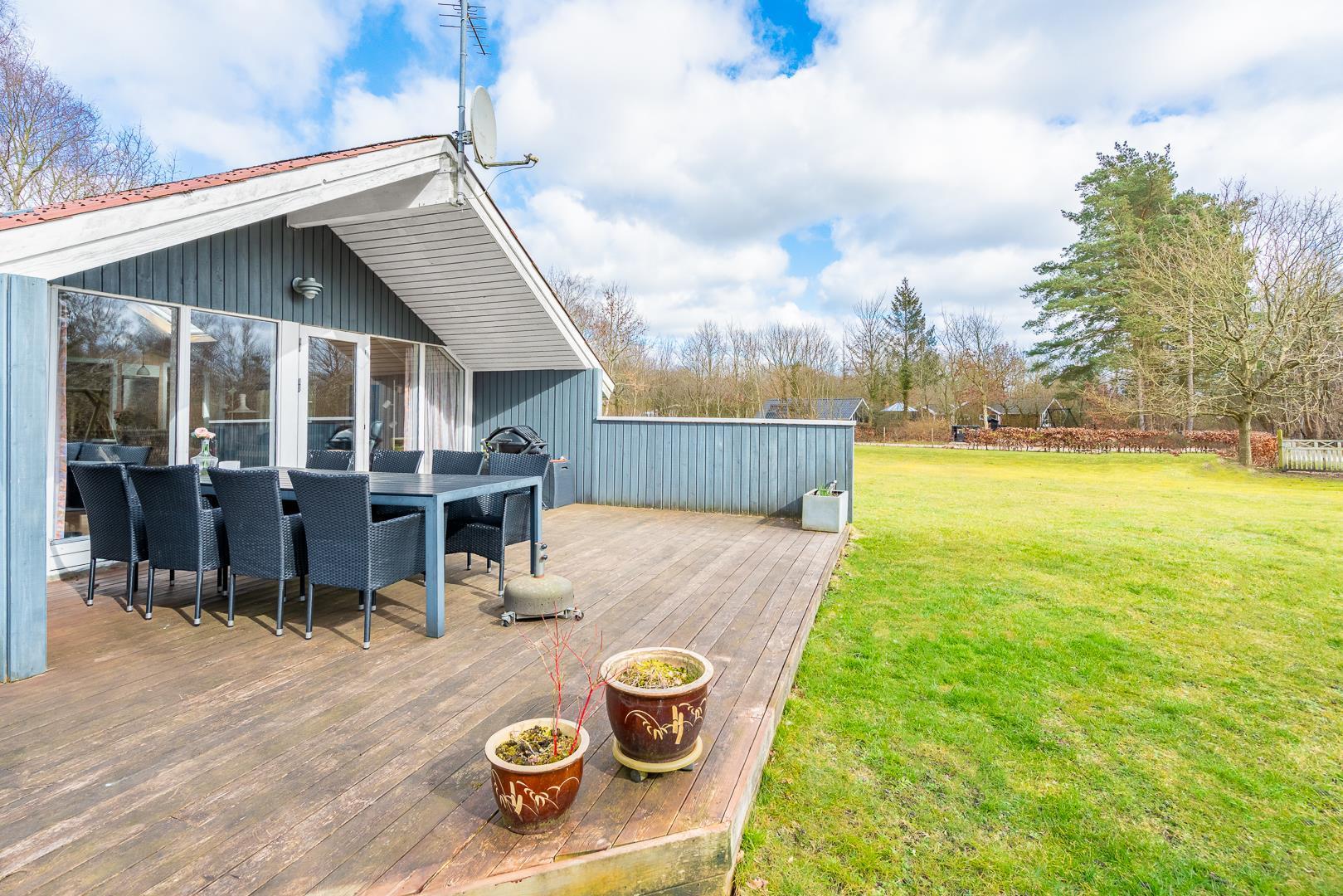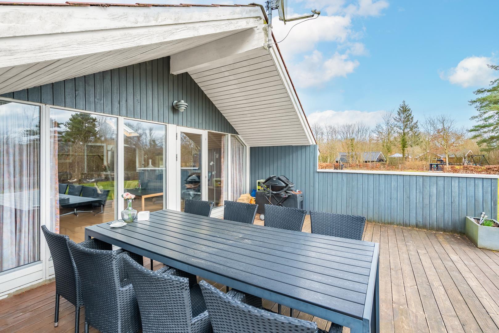 Terrassen, som delvist er overdækket, indbyder til afslapning hele dagen – fra morgenkaffen under åben himmel til hyggelige aftener med grill og god mad.