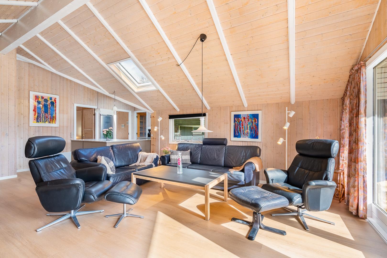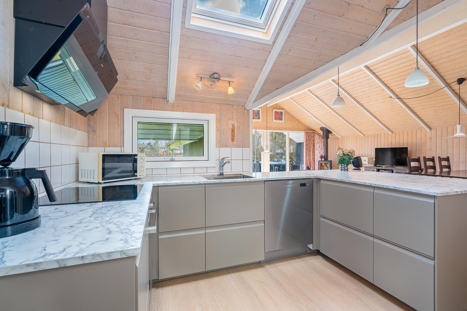 I sommerhusets lyse opholdsstue sørger brændeovnen for ekstra hygge på kølige dage, mens varmepumpen sikrer et behageligt indeklima året rundt. Det åbne køkken er fuldt udstyret og har opvaskemaskine, så I hurtigt er klar til næste måltid omkring det store spisebord.