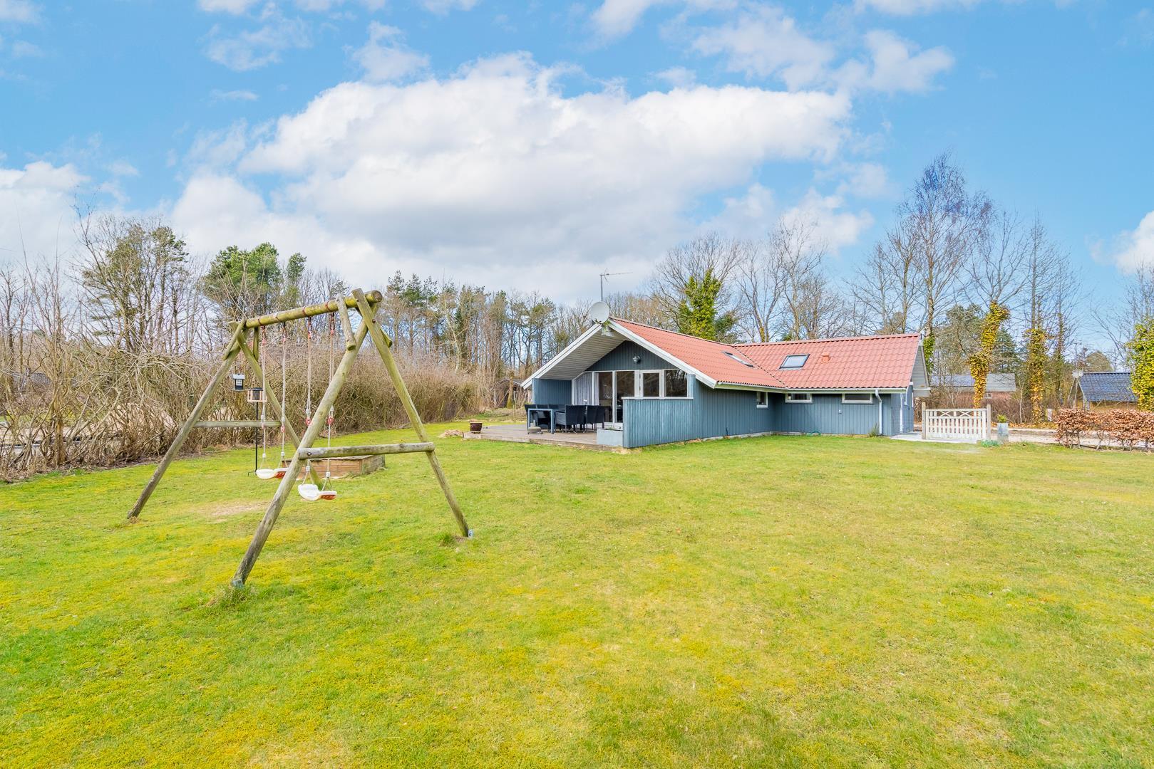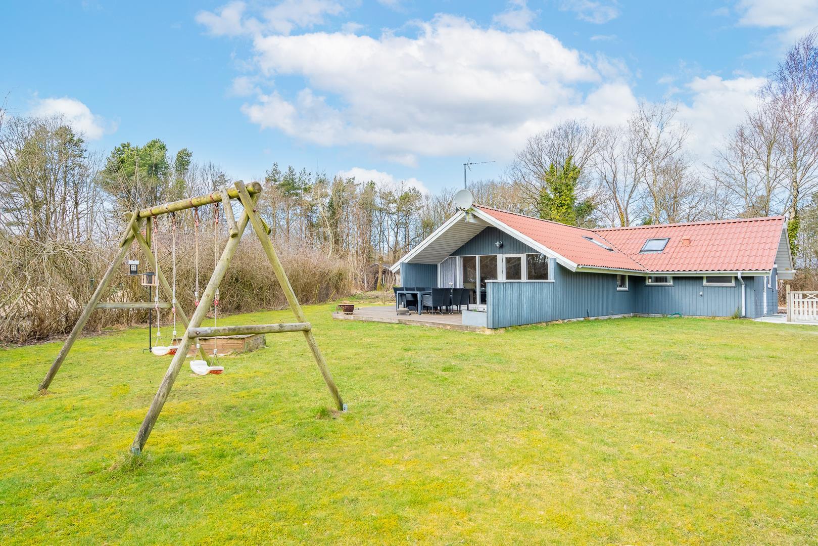 Indhegnet grund med delvist overdækket terrasse, gynge og sandkasse