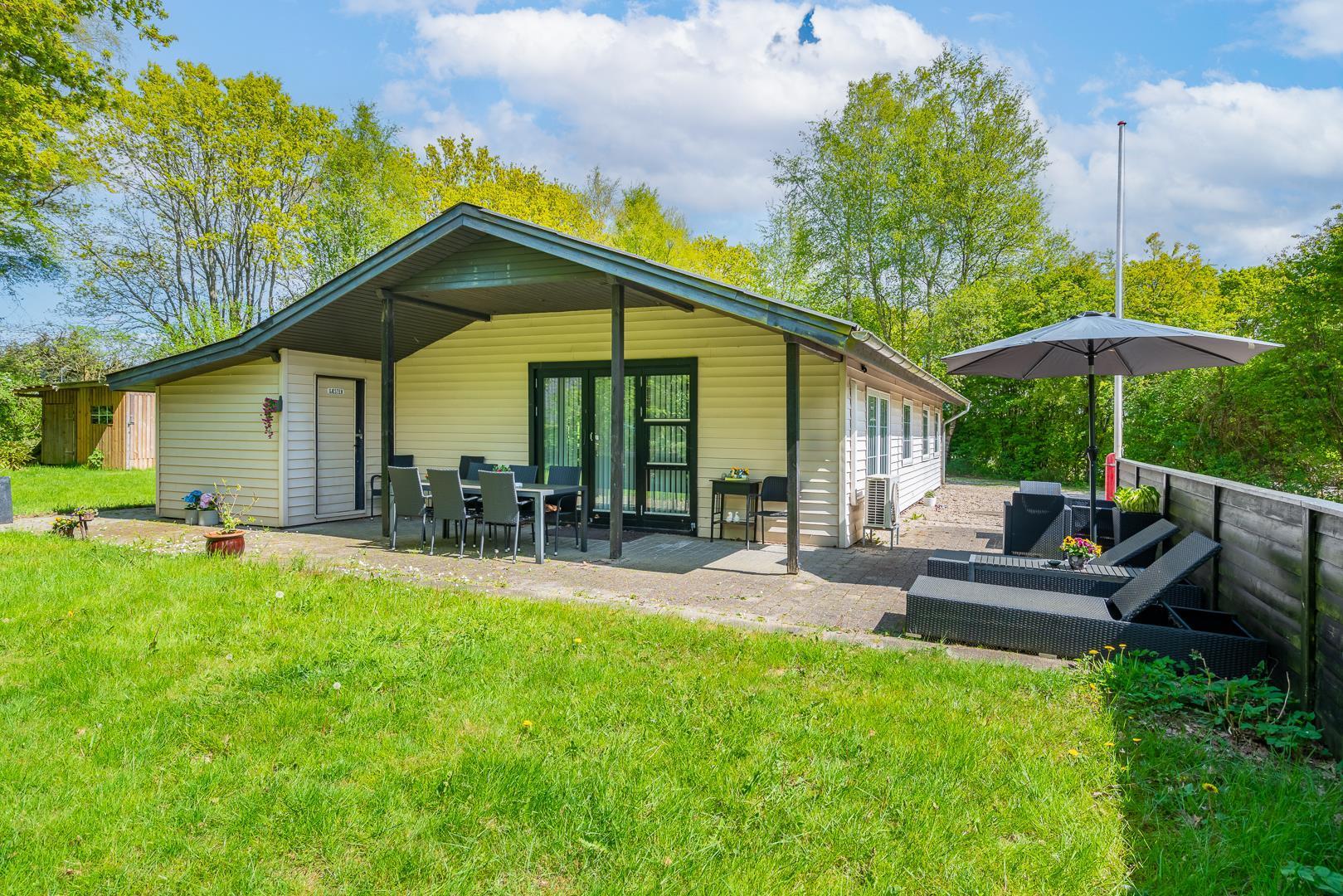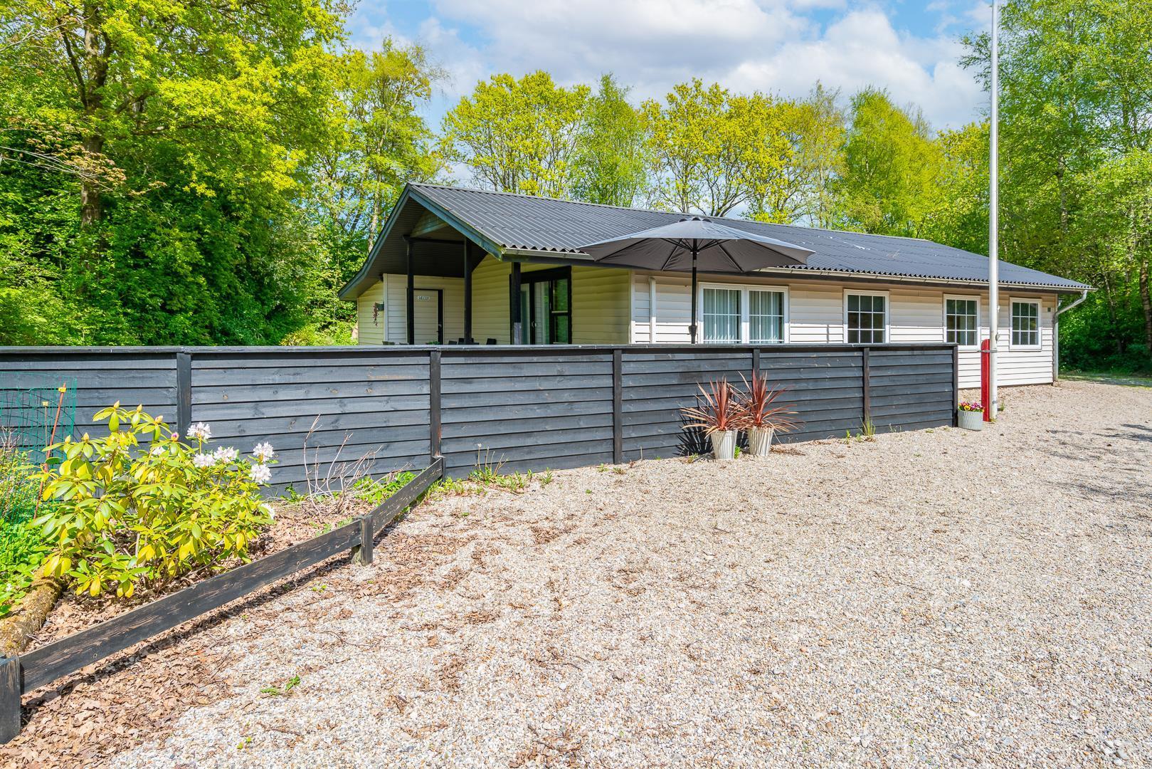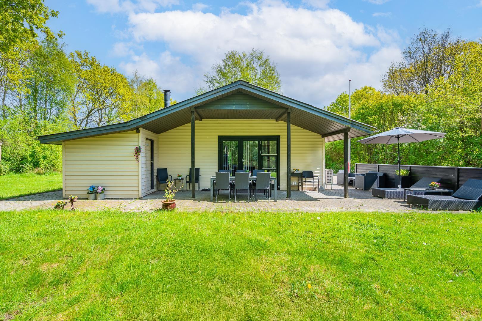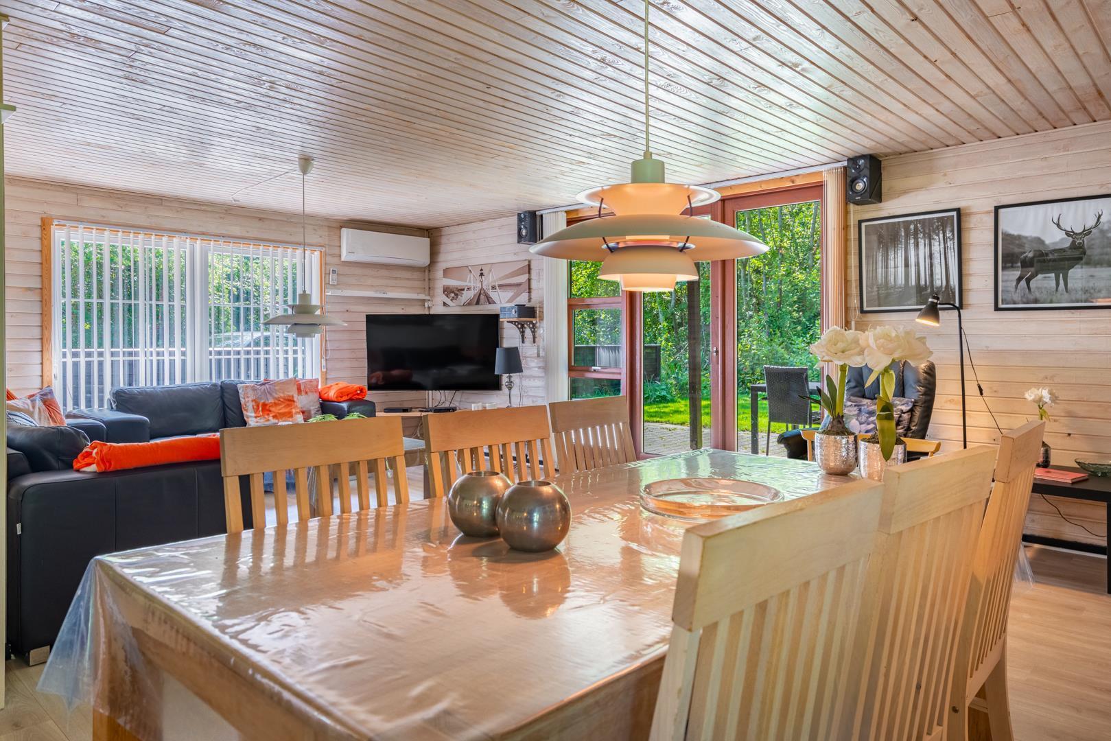 Familievenligt og hyggeligt indrettet sommerhus med 2 nyrenoverede badeværelser til sæson 2024, beliggende på en stor og ugenert naturgrund for enden af blind grusbelagt vej på adressen Hybenvangen 19, Jegum Ferieland. Praktisk indrettet køkken i åben forbindelse med stuen, hvor i finder brændeovn og der er opsat klimaanlæg. Dejligt spisehjørne hvorfra der er direkte udgang til flere delvis overdækkede og afskærmede terrasser. På grunden findes der mange aktiviteter for de mindste og der er god plads til boldspil.