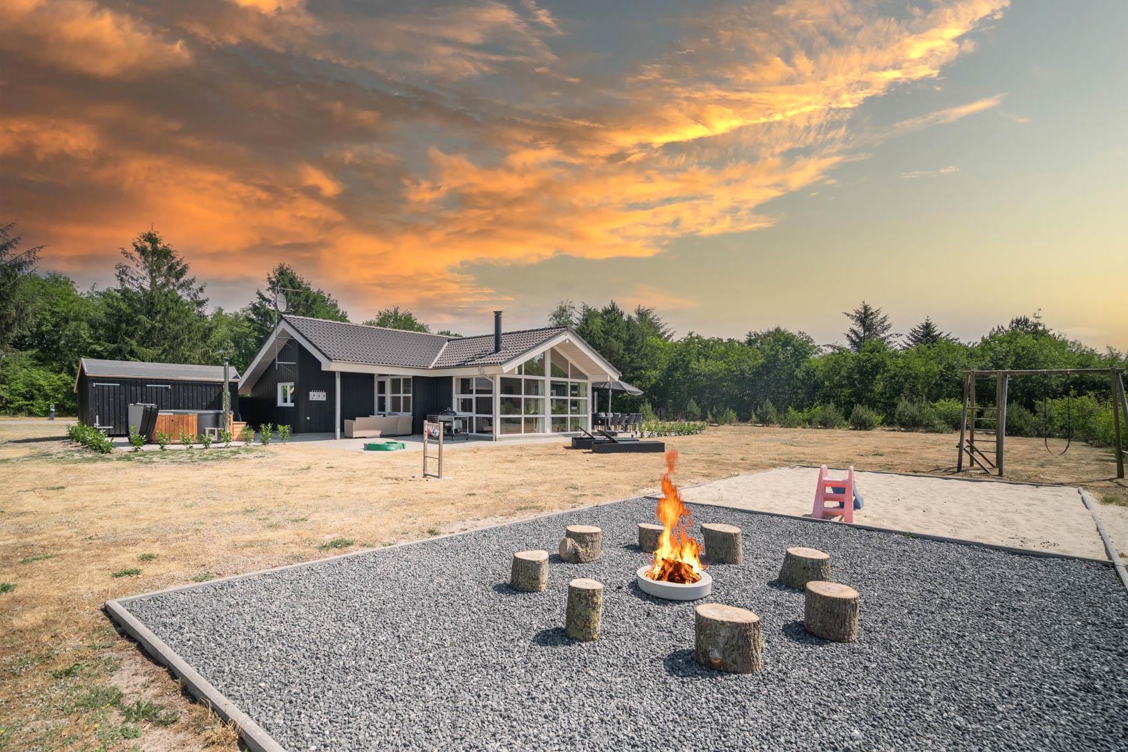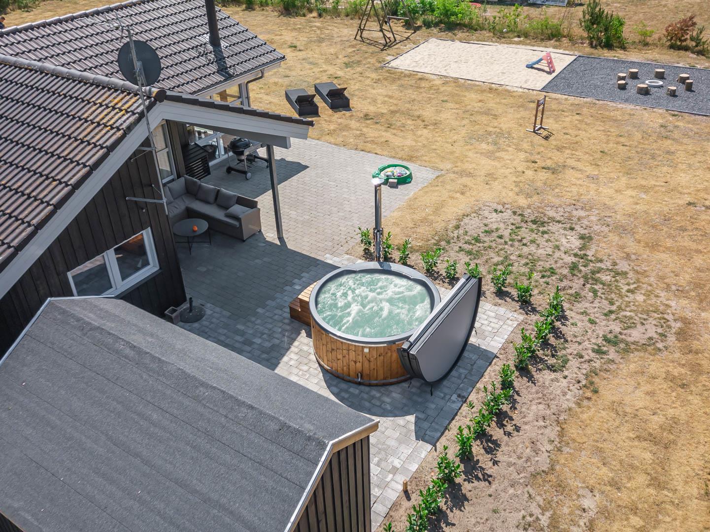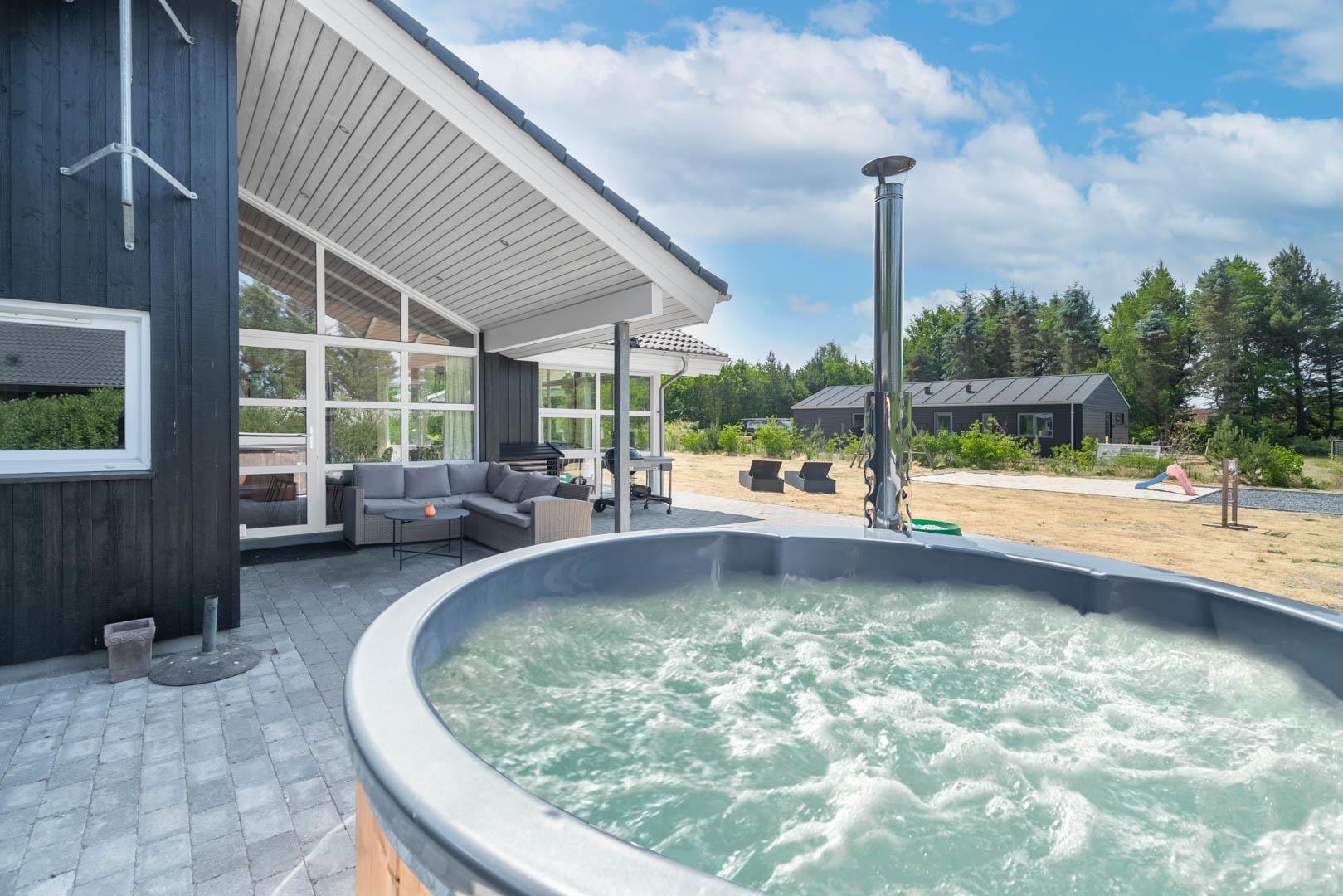Som prikken over i’et finder I husets udendørs spa. Her kan I læne jer tilbage i det varme vand under åben himmel og nyde stilheden – den perfekte afslutning på en dejlig feriedag.