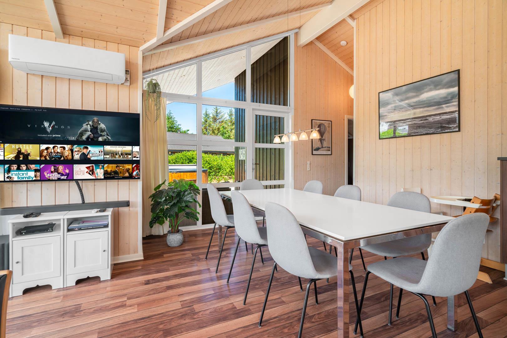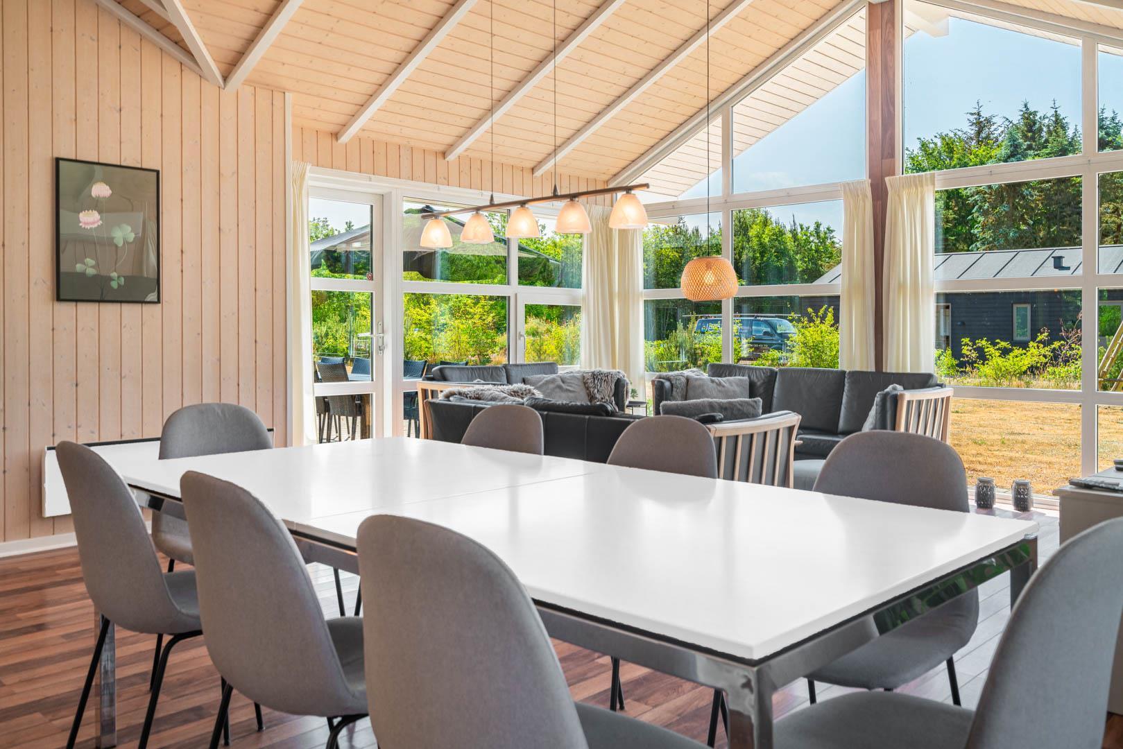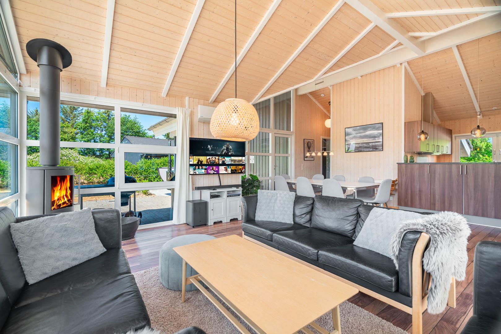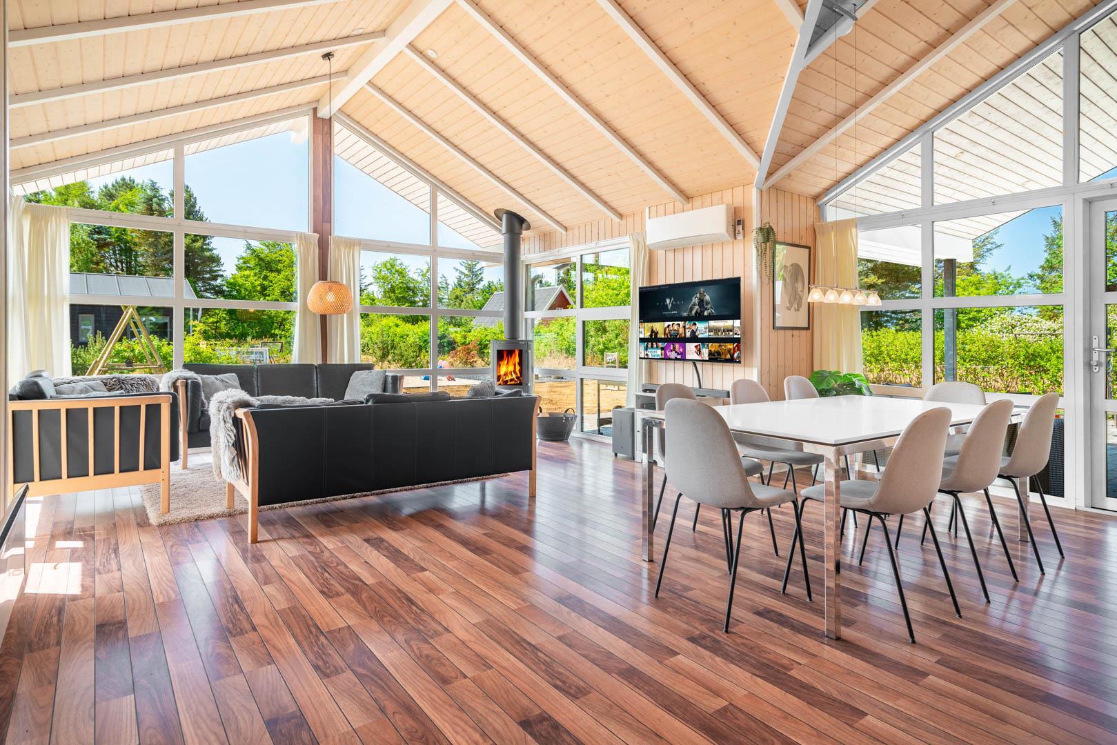 Husets naturlige samlingspunkt er det åbne opholds- og spiseområde. Her kan I samles om måltiderne, spille spil ved spisebordet eller nyde rolige aftener foran brændeovnen. De store vinduespartier lukker masser af dagslys ind og skaber en behagelig overgang mellem inde og ude.