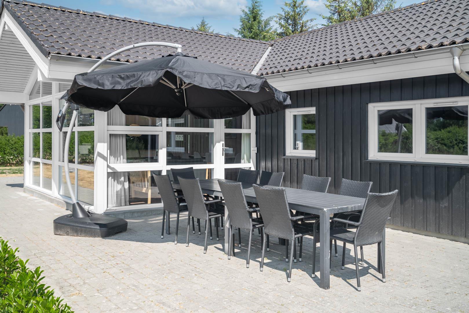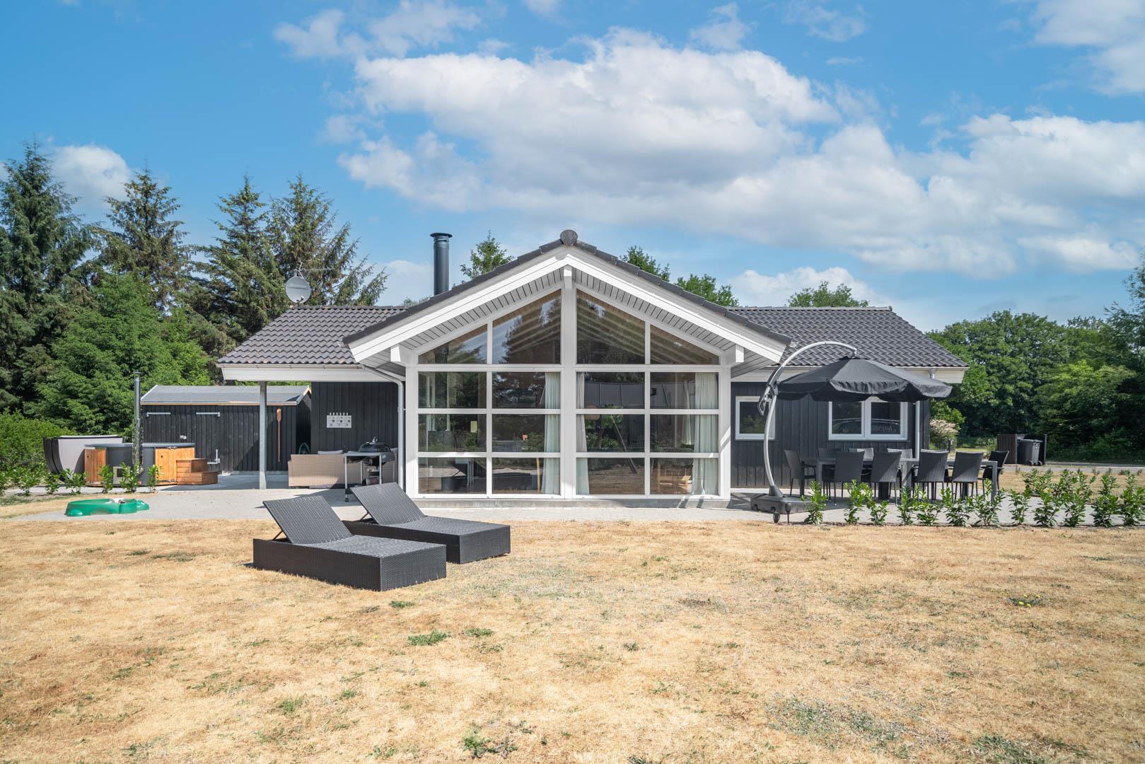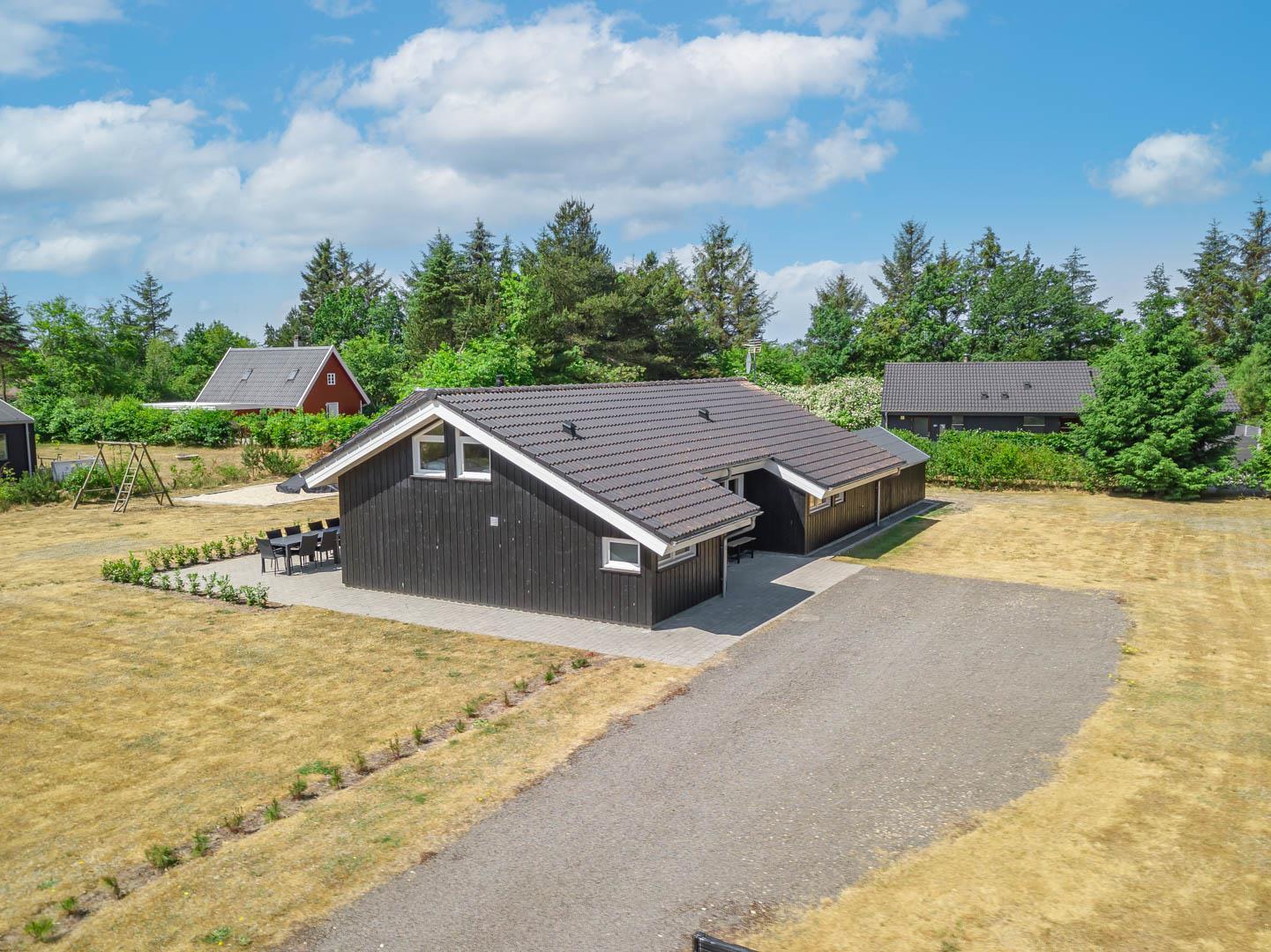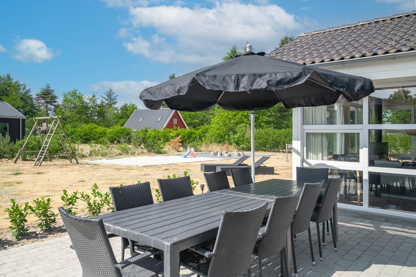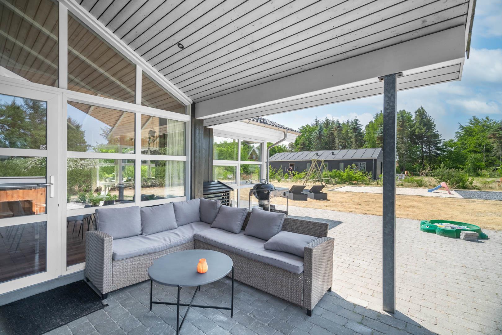 Udendørs venter en fredelig grund, hvor hele familien kan nyde ferien i rolige omgivelser. Den store, overdækkede terrasse danner rammen om både morgenkaffe i den friske luft og lange sommeraftener med grill og hyggeligt samvær – uanset vejret.