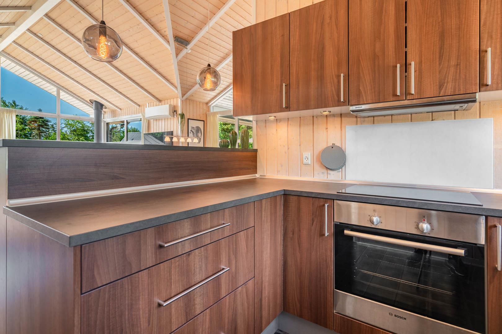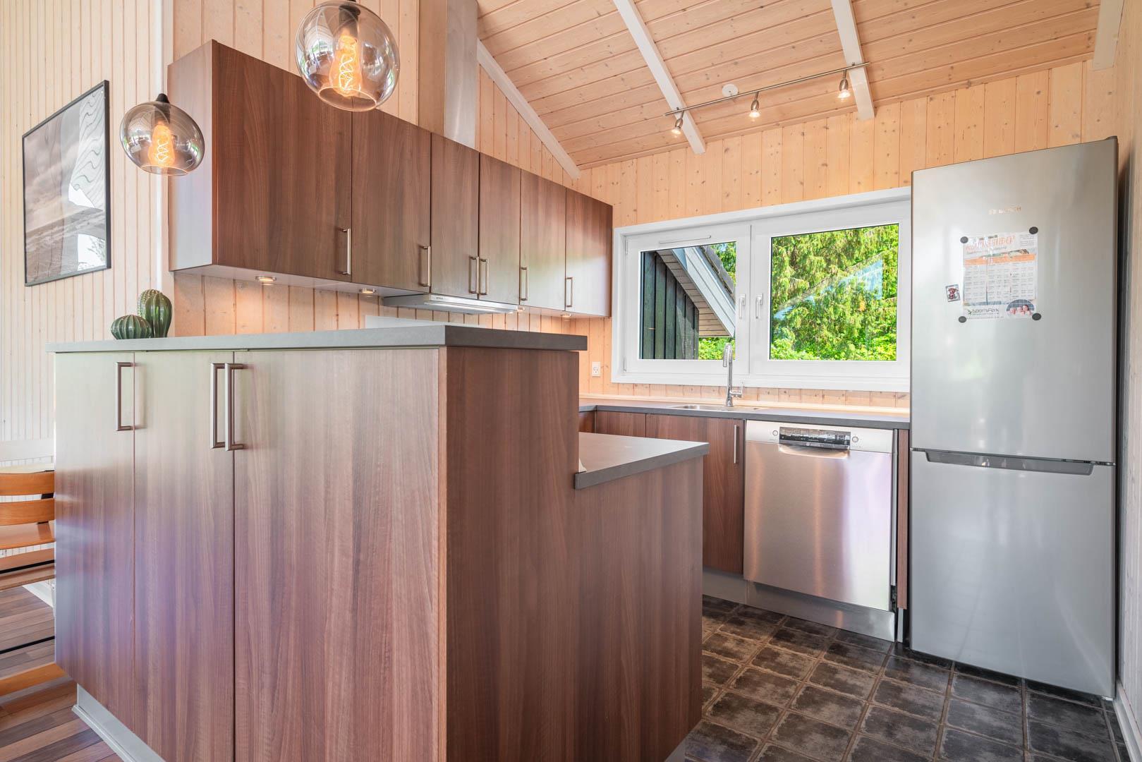 Det åbne køkken er moderne indrettet og veludstyret med bl.a. opvaskemaskine, god bordplads og gulvvarme – så madlavningen bliver en del af ferieoplevelsen.