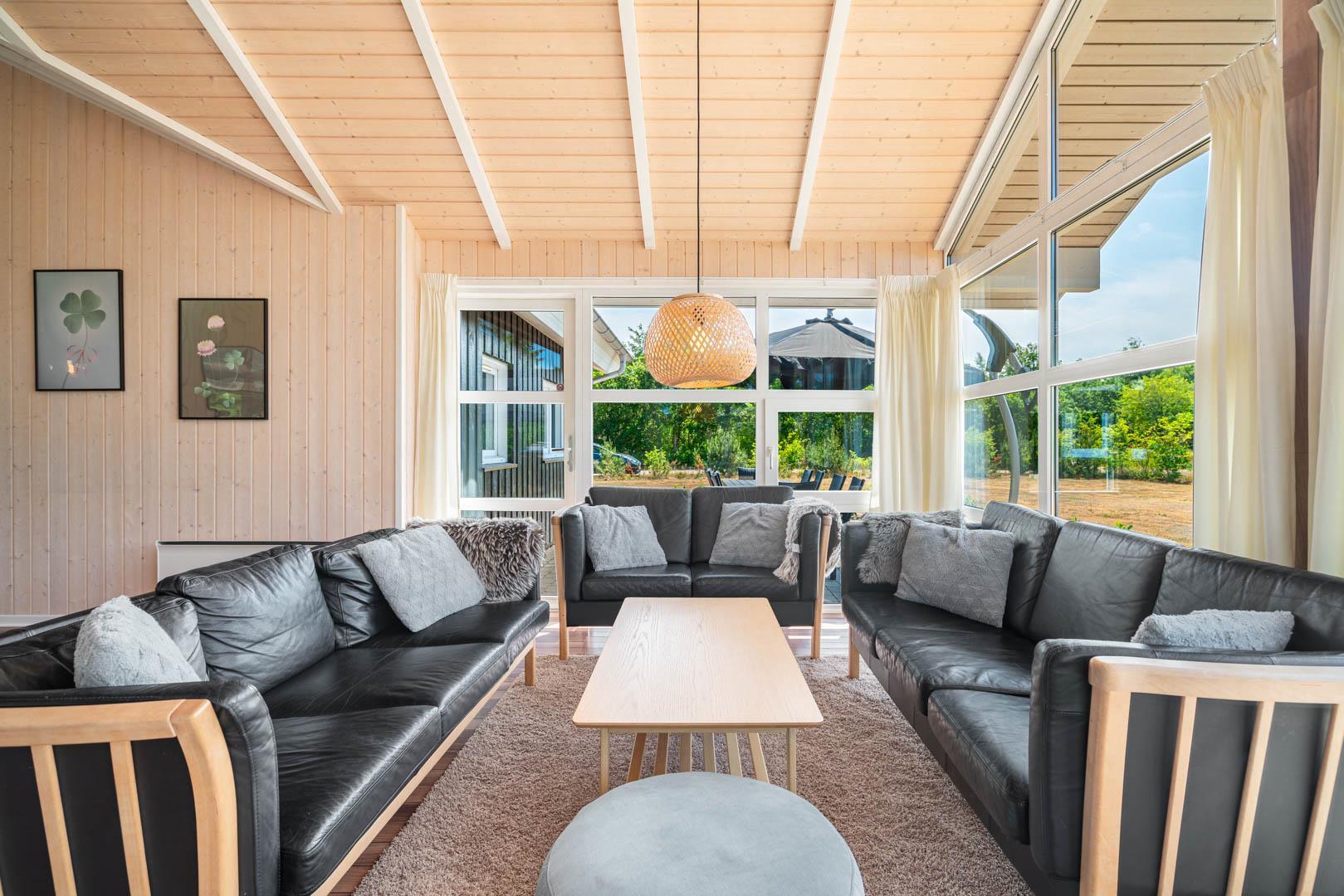 Lyst opholdsrum med brændeovn, sauna og spabad