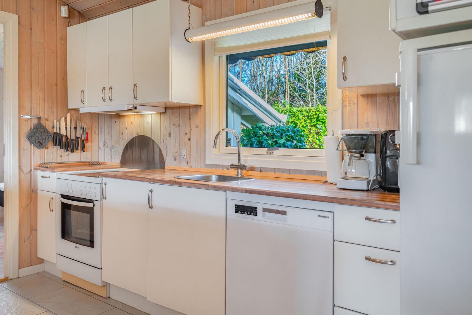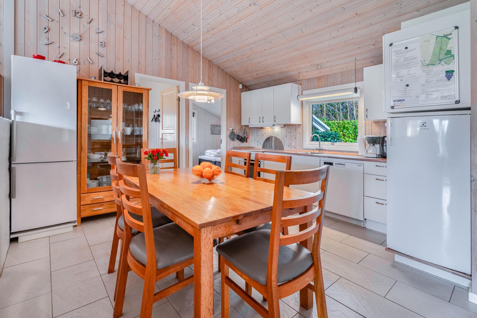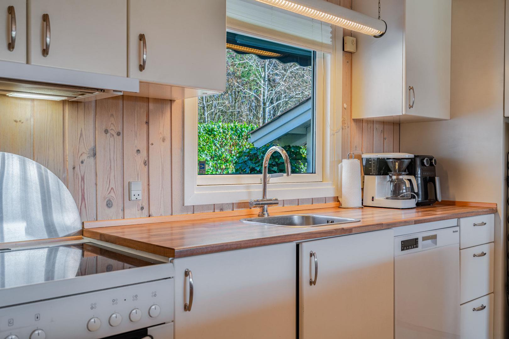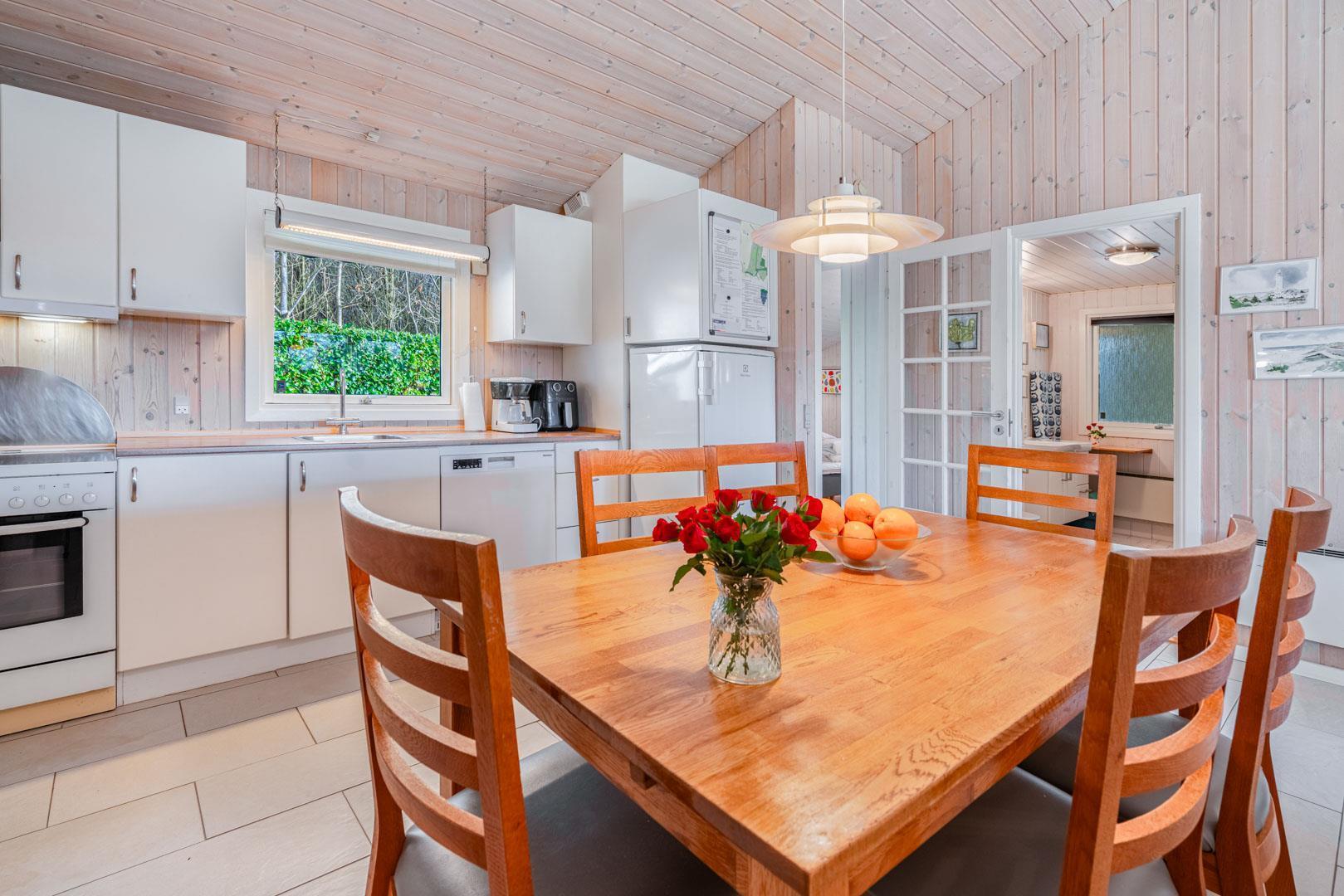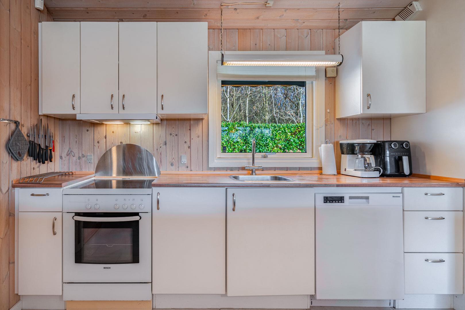 Det moderne køkken med opvaskemaskine og gulvvarme har alt, hvad I behøver til fælles madlavning og hyggelige måltider.