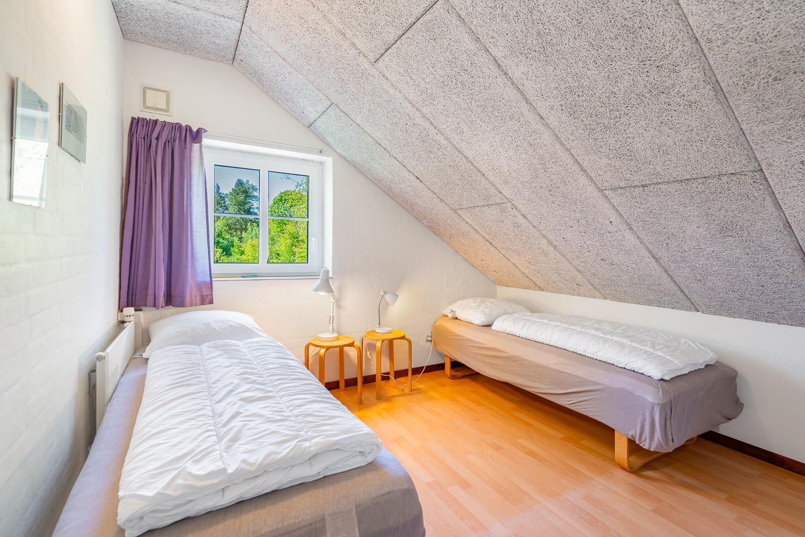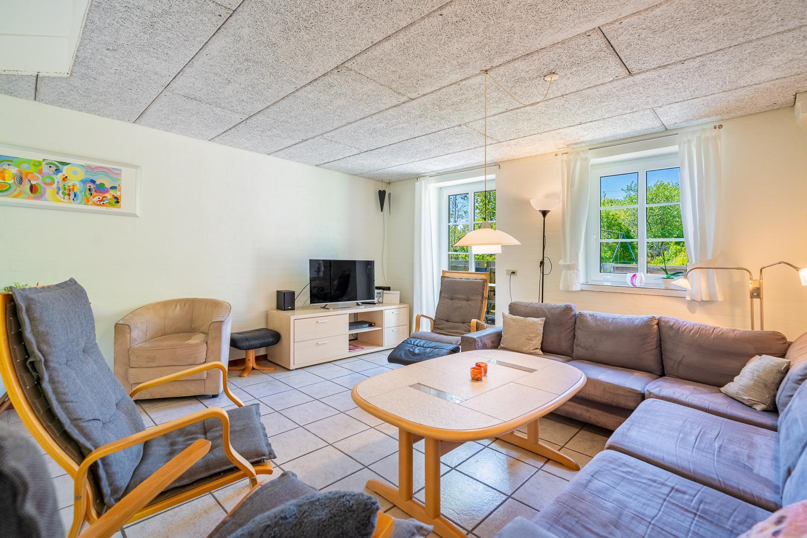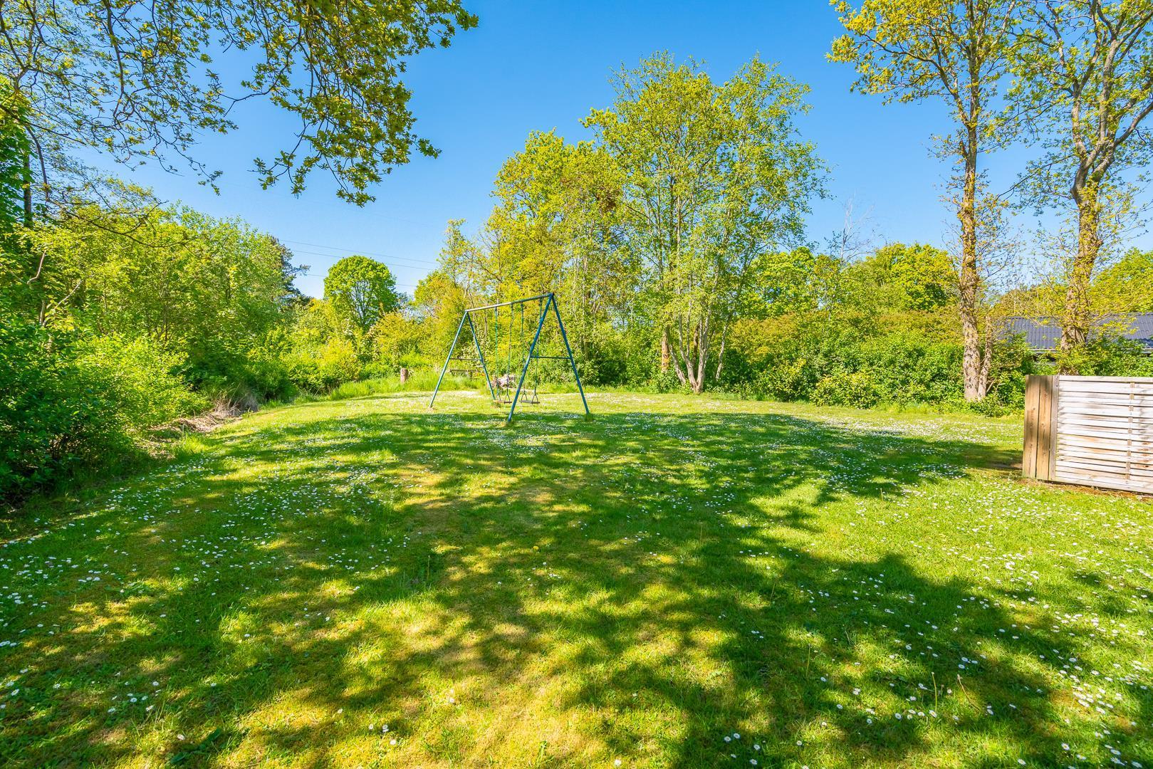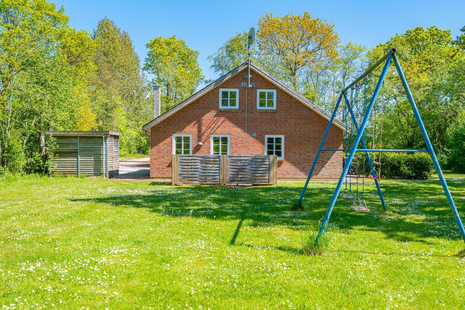 Huset ligger naturskønt på en stor lukket grund, hvor haven er omkranset af træer. Her er en dejlig terrasse med havemøbler, grill og parasol. I haven finder du også et gyngestativ til børnene.