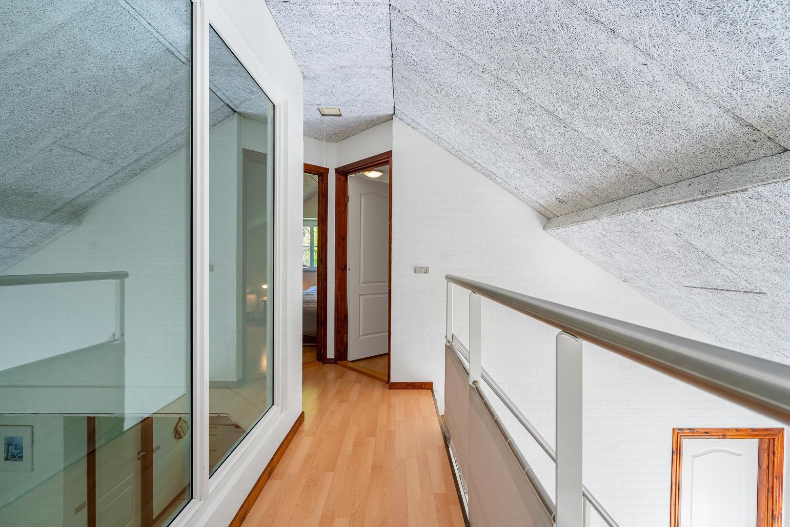 Fra køkkenet er der åbent ind i den store stue. Med hvide vægge og højt til loftet er spisestuen et behageligt opholdsrum. I stueplan er der 2 soverum og 2 badeværelser, begge med gulvvarme. Fra entréen går trappen op til første Salen, med gangbro og blik ned til spisestuen. Her finder du 4 soverum, et dejligt hus med plads til flere familier.