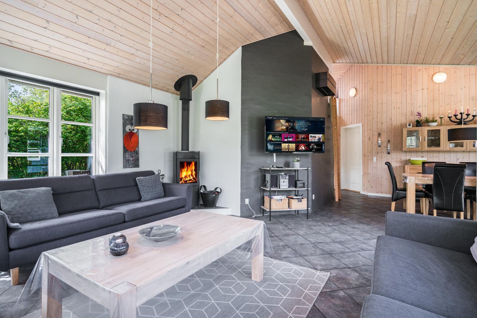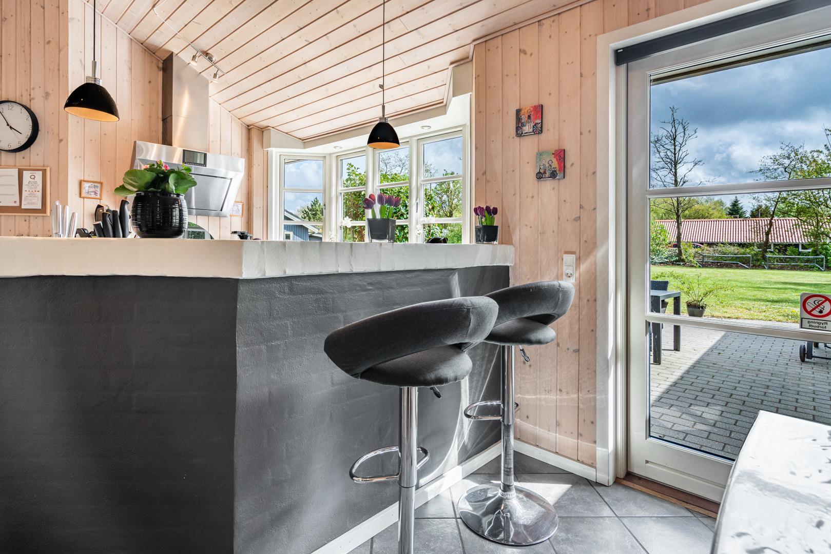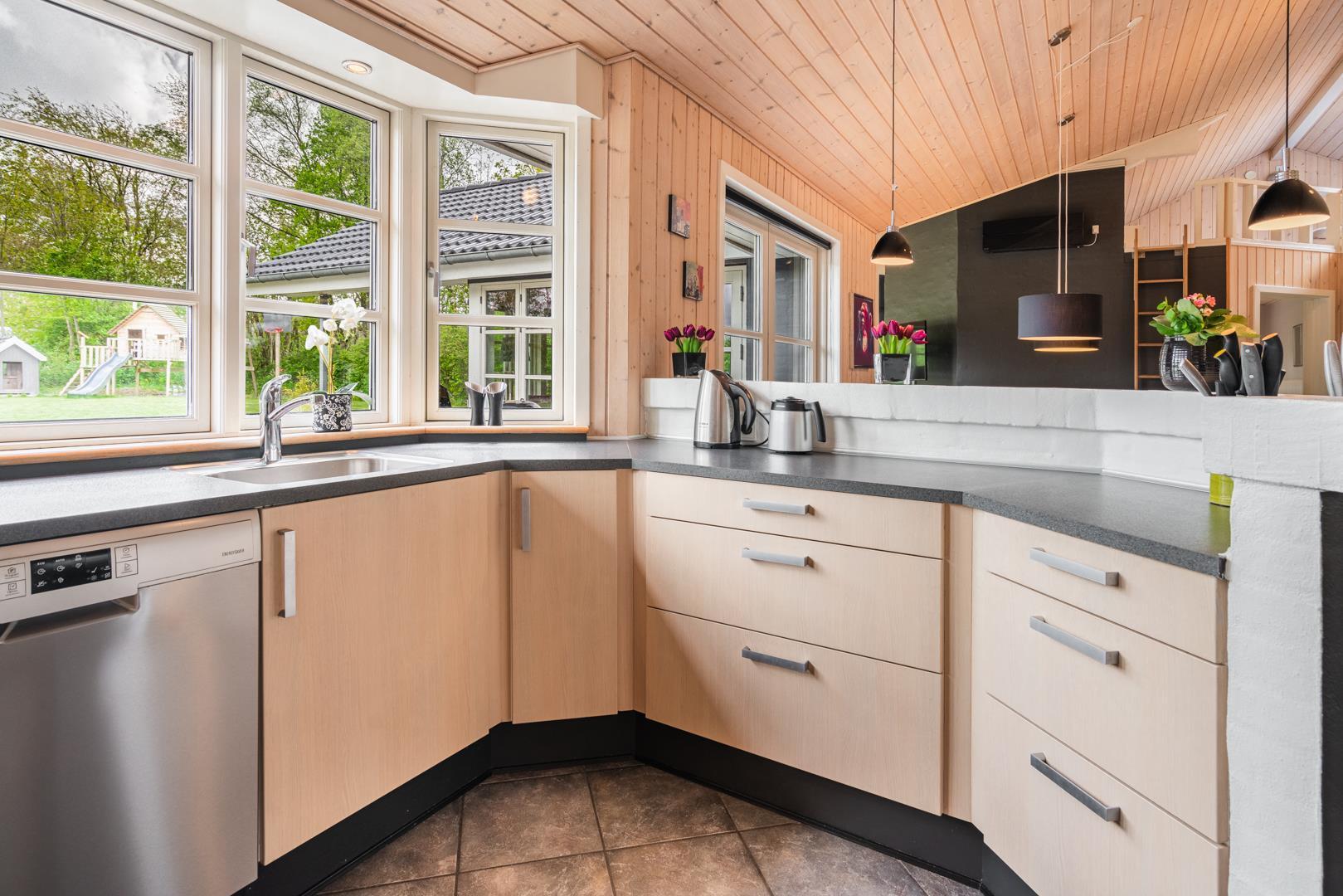 Opholdsstuen i sommerhuset på Møllevangen 43 er lyst, hyggelig og indbydende året rundt med gulvvarme, brændeovn og varmepumpe. De store vinduespartier giver masser af naturligt lys og skaber en varm atmosfære. Det åbne køkken er moderne indrettet med bl.a. opvaskemaskine – og også her sørger gulvvarmen for ekstra komfort.