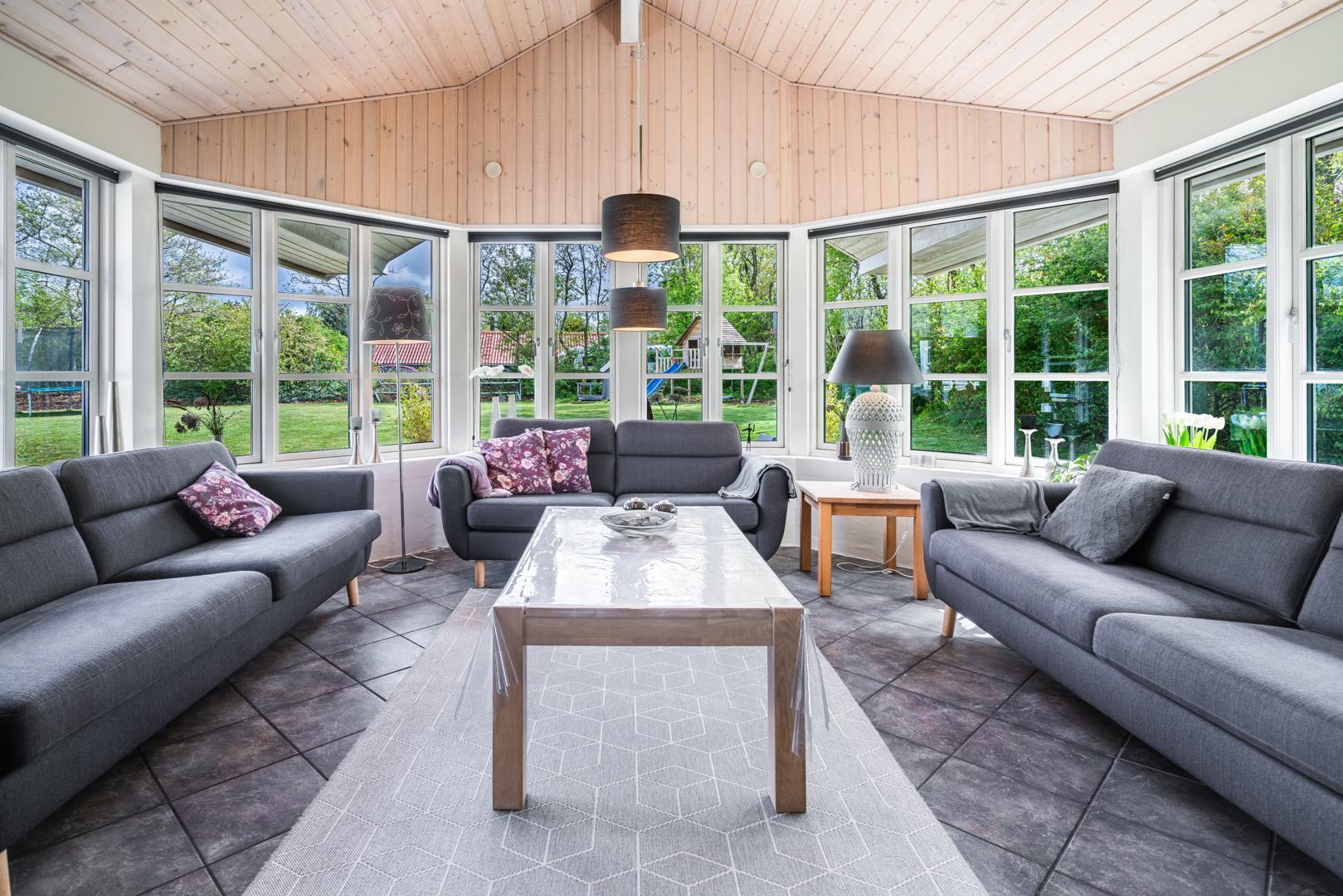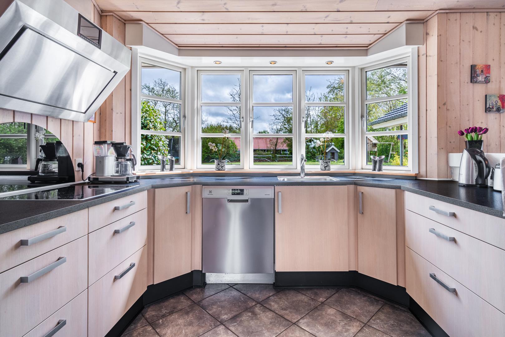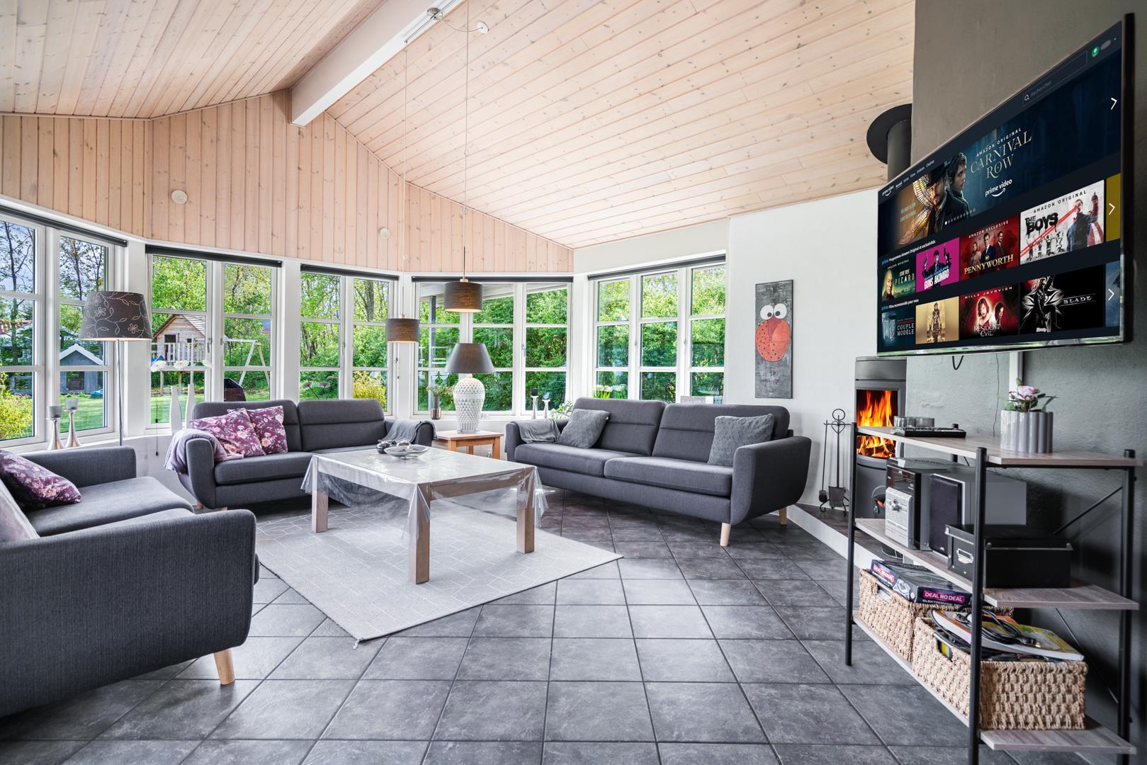 Opholdsstuen i sommerhuset på Møllevangen 43 er lyst, hyggelig og indbydende året rundt med gulvvarme, brændeovn og varmepumpe. De store vinduespartier giver masser af naturligt lys og skaber en varm atmosfære. Det åbne køkken er moderne indrettet med bl.a. opvaskemaskine – og også her sørger gulvvarmen for ekstra komfort.