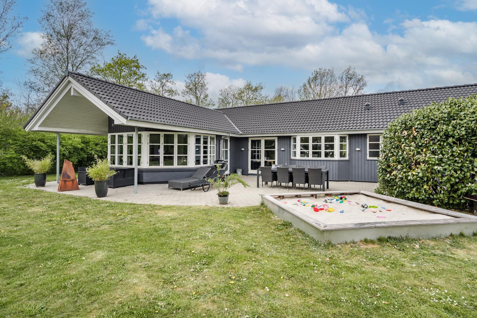Grunden omkring sommerhuset er stor og indbyder til afslapning og leg under åben himmel. Den overdækkede terrasse er et naturligt samlingspunkt – ideel til morgenkaffe i solen eller en hyggelig grillaften med udsigt til naturen.