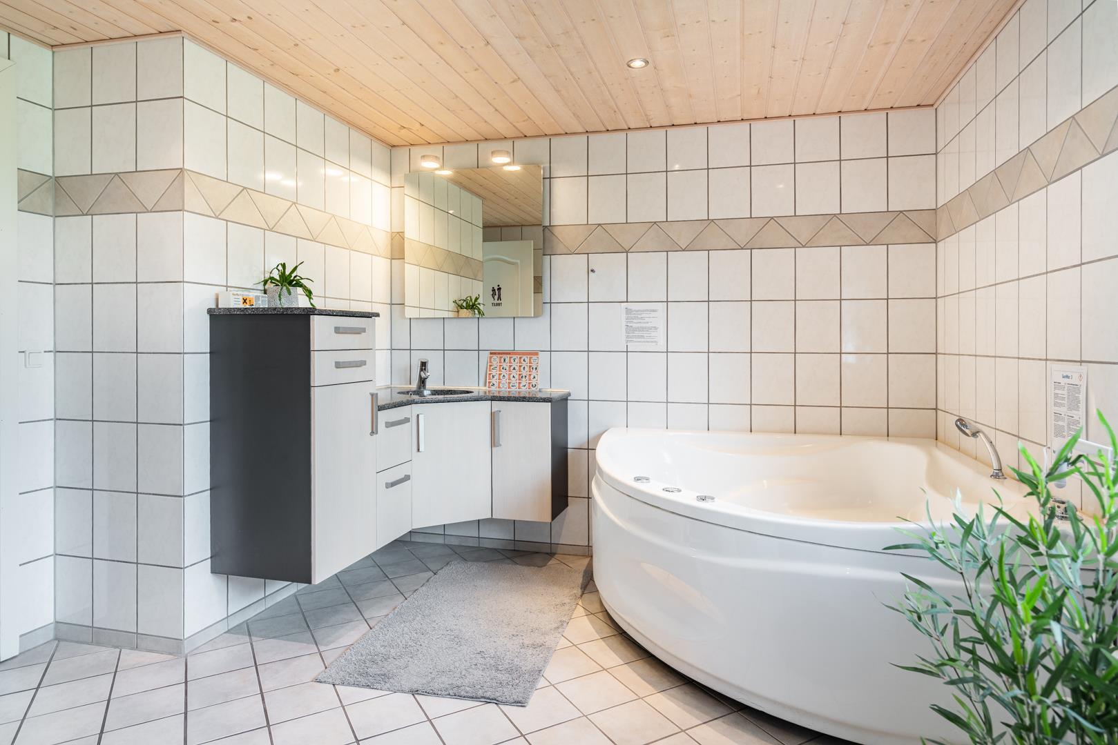 Begge badeværelser har gulvvarme, og i det ene kan I forkæle jer selv med et dejligt spabad og en tur i saunaen efter en aktiv dag.