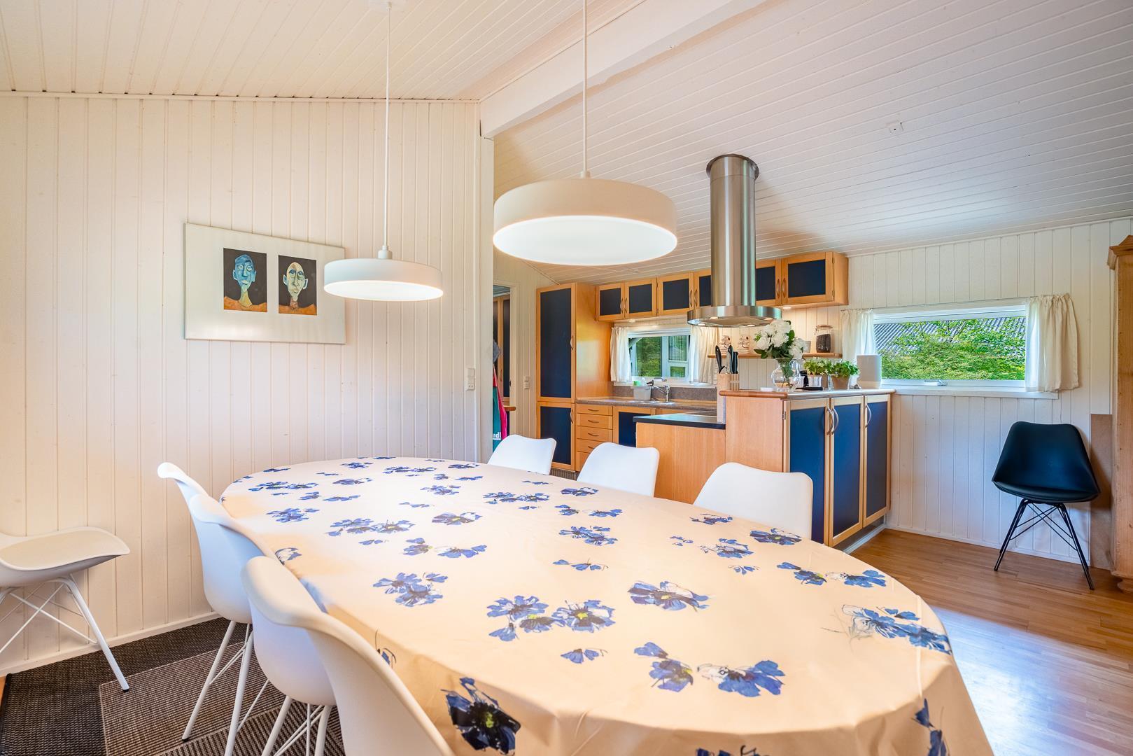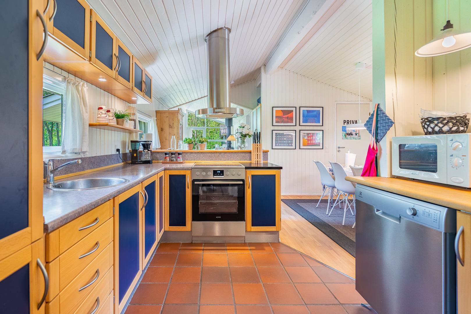 Det store opholdsrum er hjertet i sommerhuset – her kan I nyde hyggelige aftener foran brændeovnen, se film via Chromecast eller bare slappe af i sofaen. Det åbne køkken er stilfuldt og fuldt udstyret med bl.a. opvaskemaskine, så madlavningen bliver let og hyggelig. Gulvvarme og varmepumpe sikrer et behageligt indeklima året rundt.