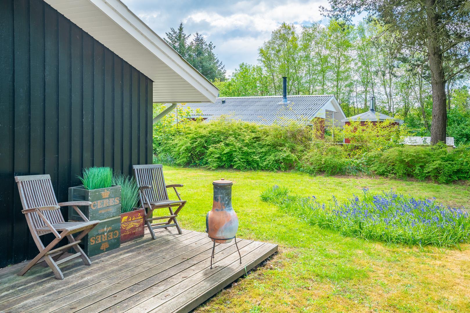 Udenfor venter en stor, delvist overdækket terrasse, hvor I kan nyde solen, grille sammen eller bare læne jer tilbage med en kop kaffe og mærke roen. På den store naturgrund er der god plads til leg, boldspil og afslapning for hele familien.