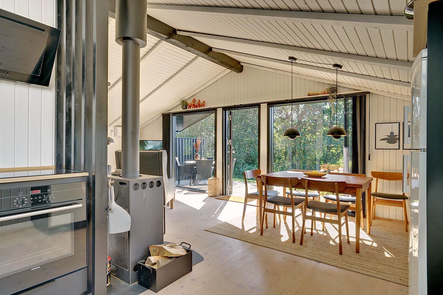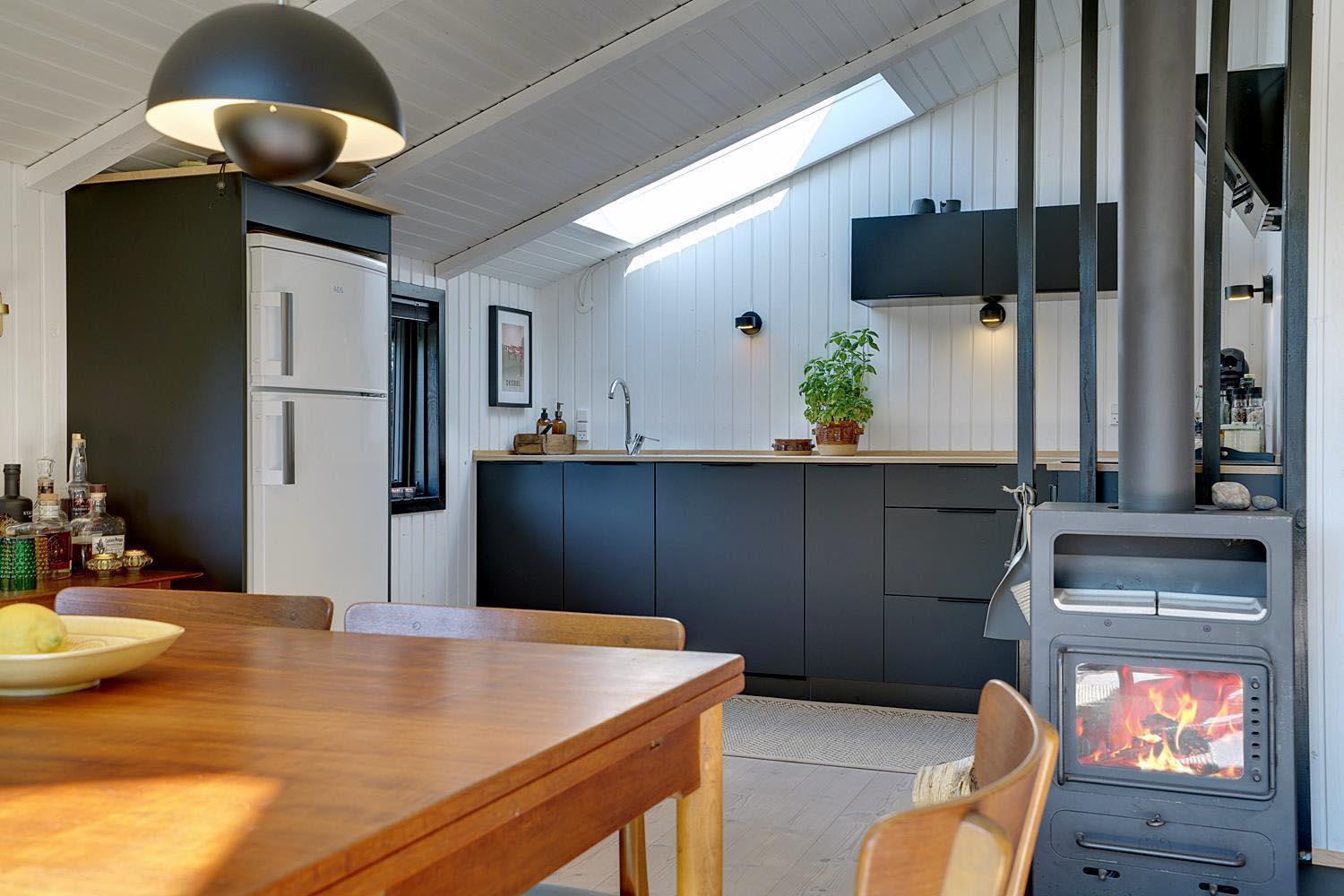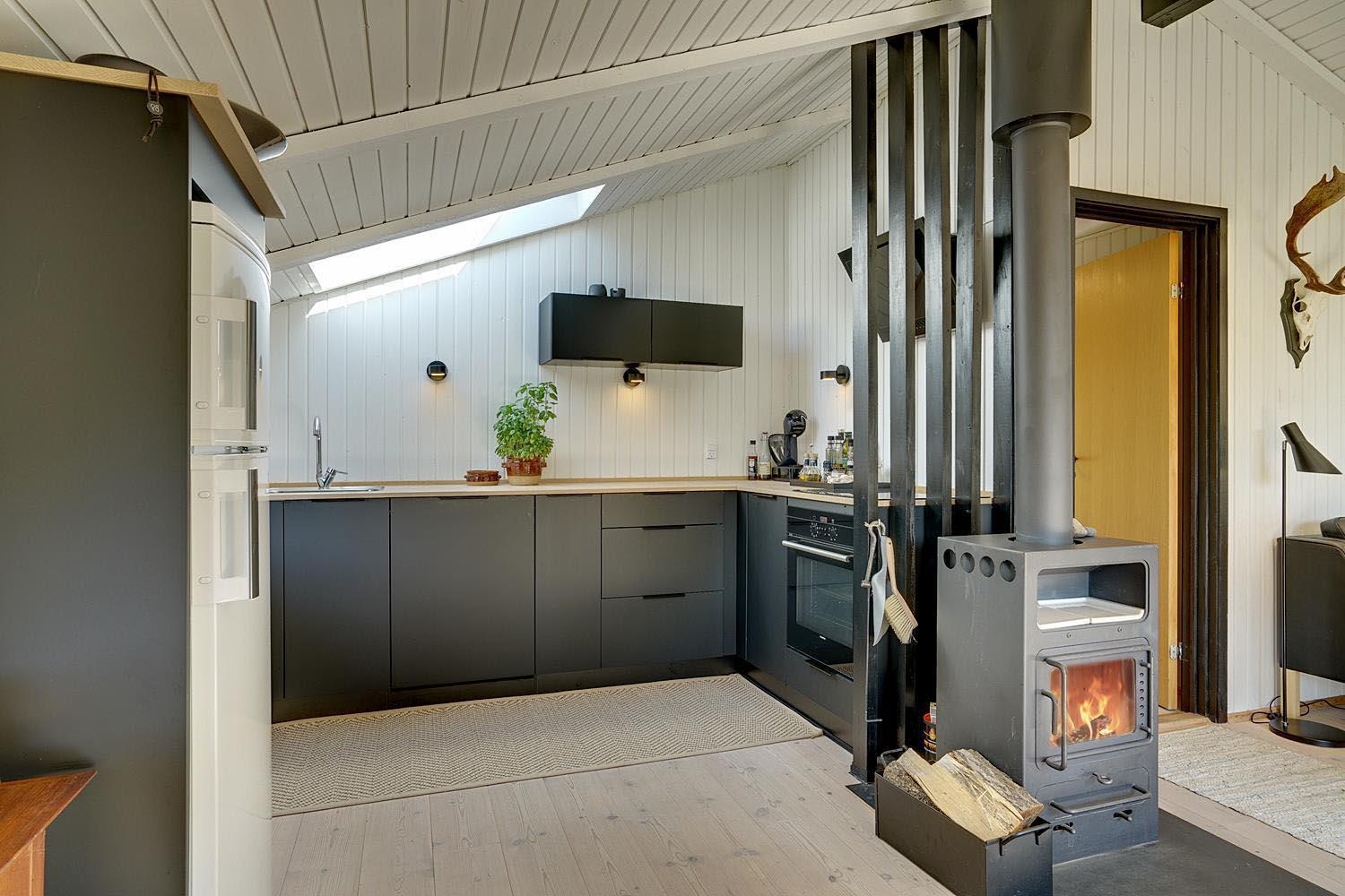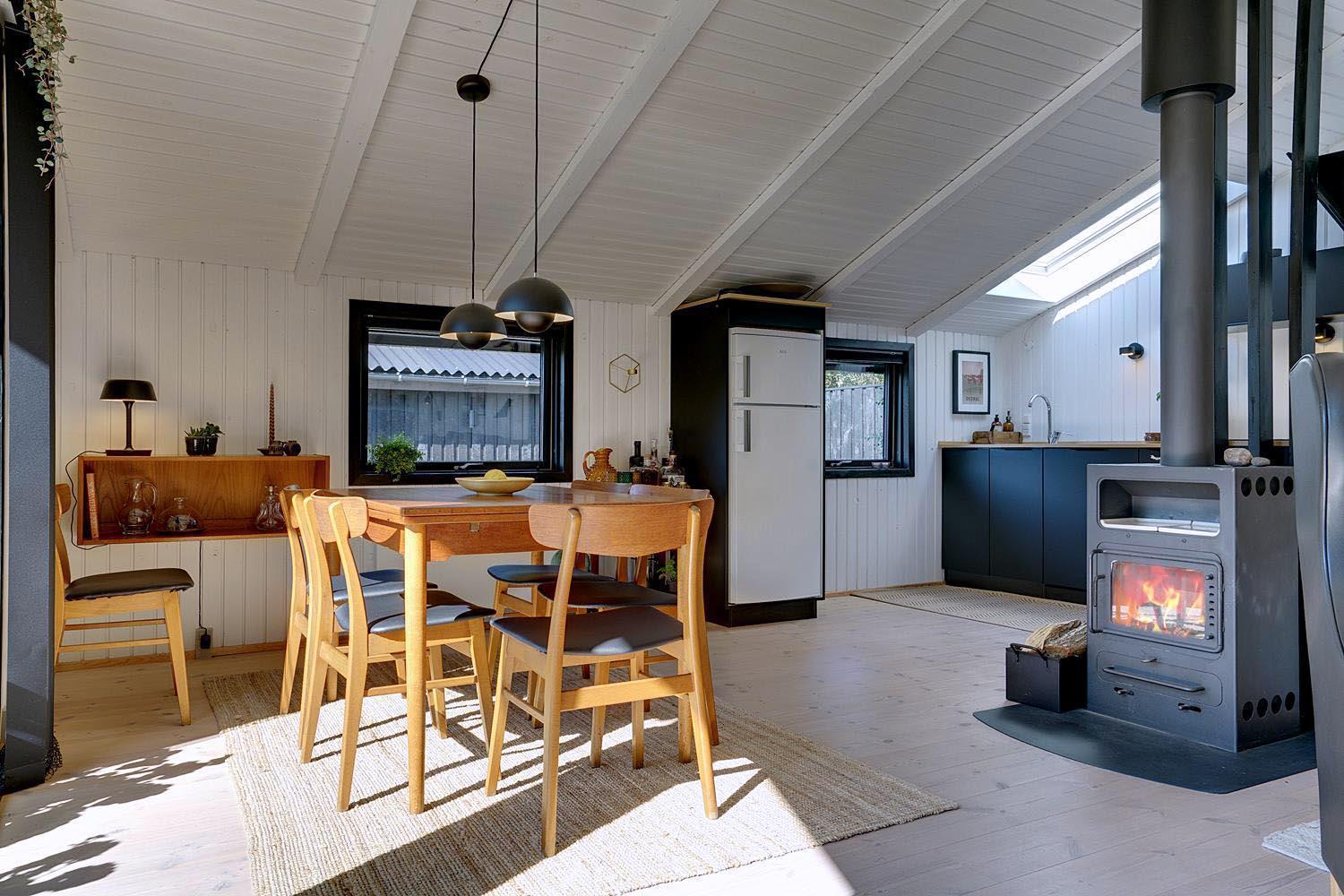 I den åbne stue kan I samle jer omkring brændeovnen og nyde den varme, knitrende ild. Den moderne varmepumpe sikrer et behageligt indeklima året rundt.