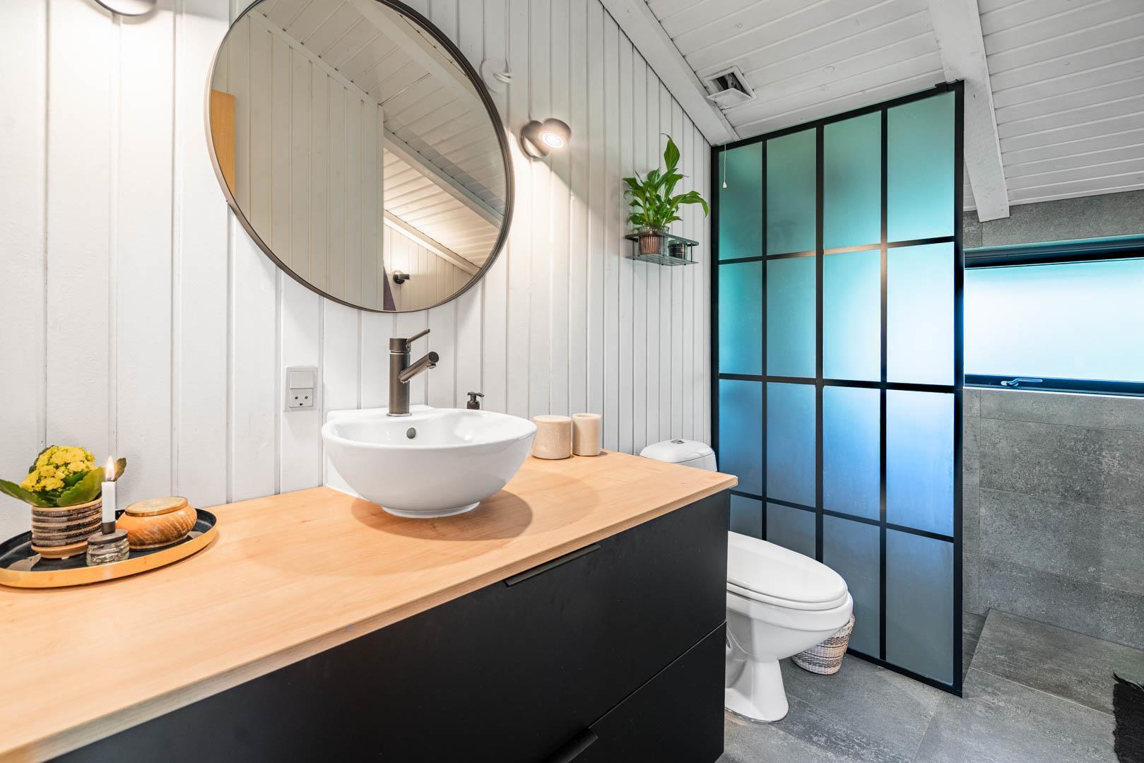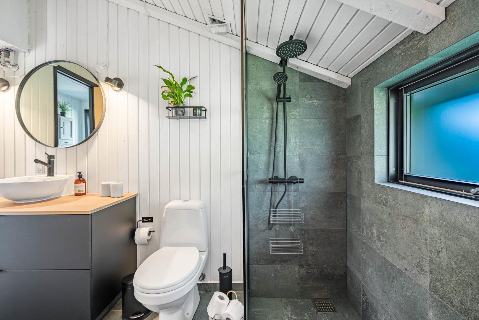 Køkkenet er fuldt udstyret – blandt andet med opvaskemaskine – og hænger naturligt sammen med spiseområdet, hvor måltiderne får en hyggelig ramme. Badeværelset er lyst og komfortabelt med gulvvarme.