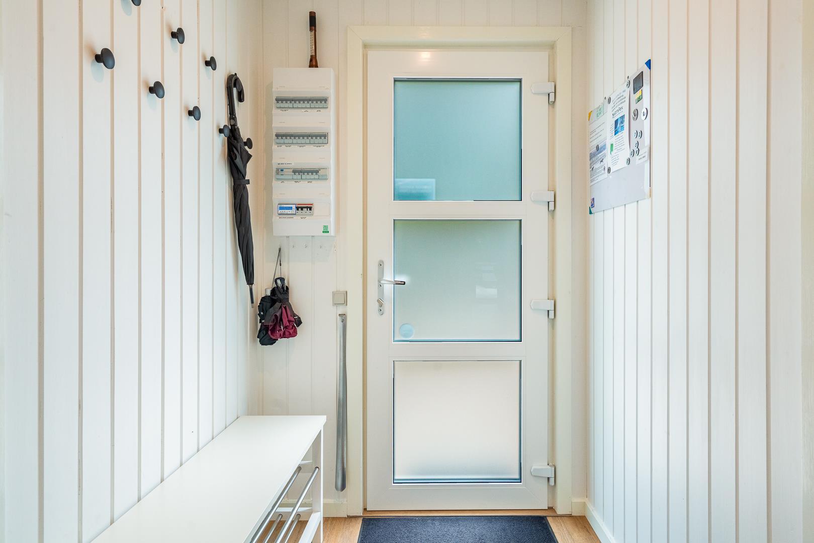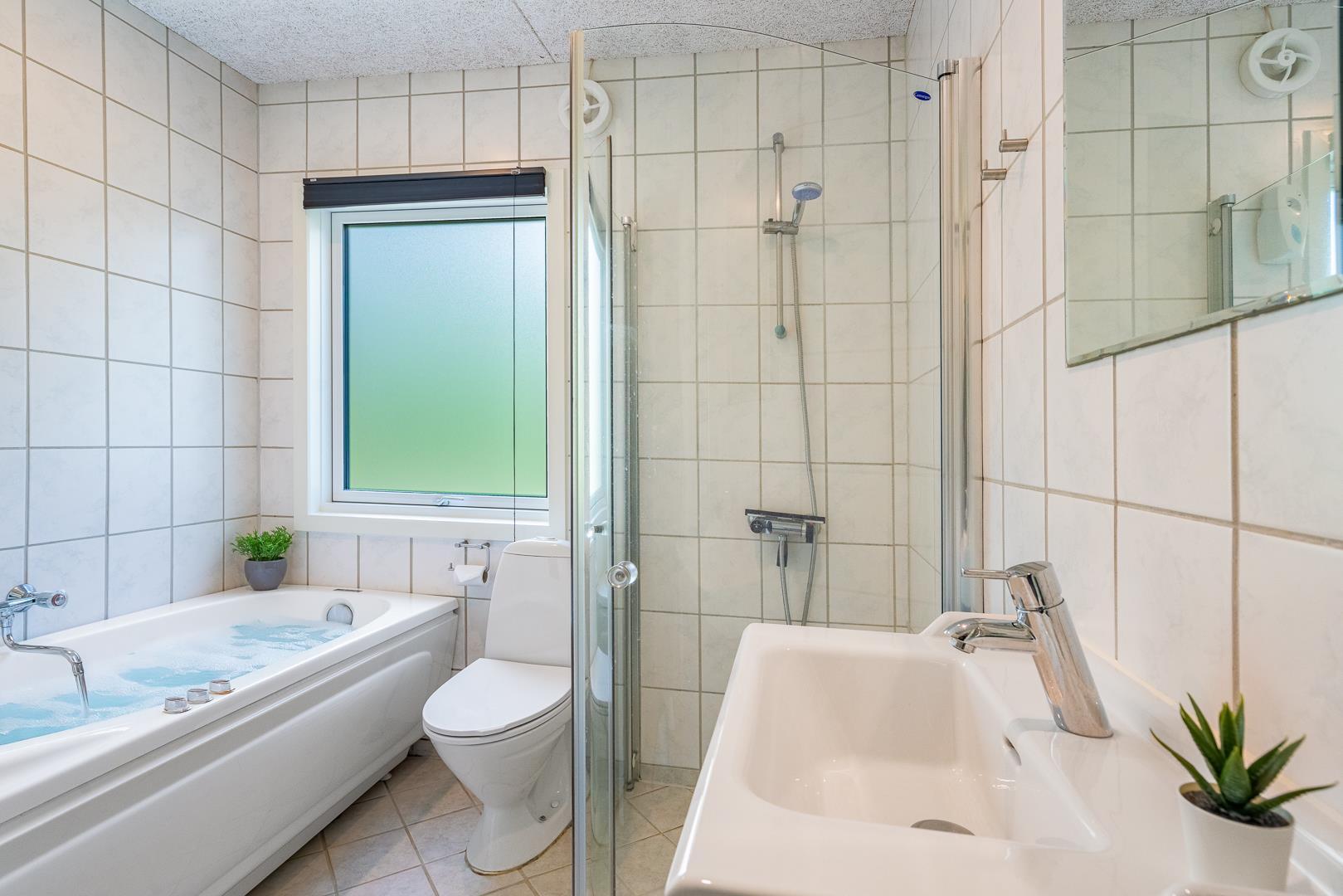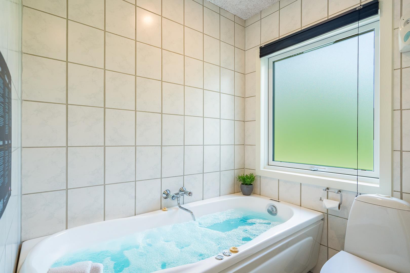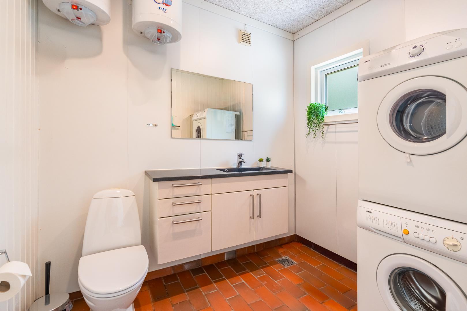 Det moderne badeværelse byder på gulvvarme, badekar, sauna, vaskemaskine og tørretumbler – ideelt til både familieferien og afslappende wellnessaftener efter en aktiv dag i naturen.
