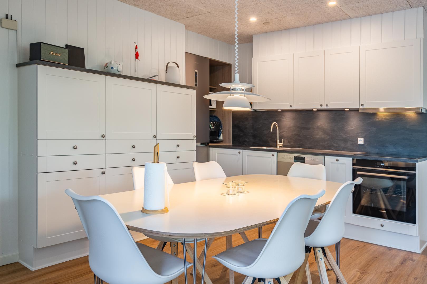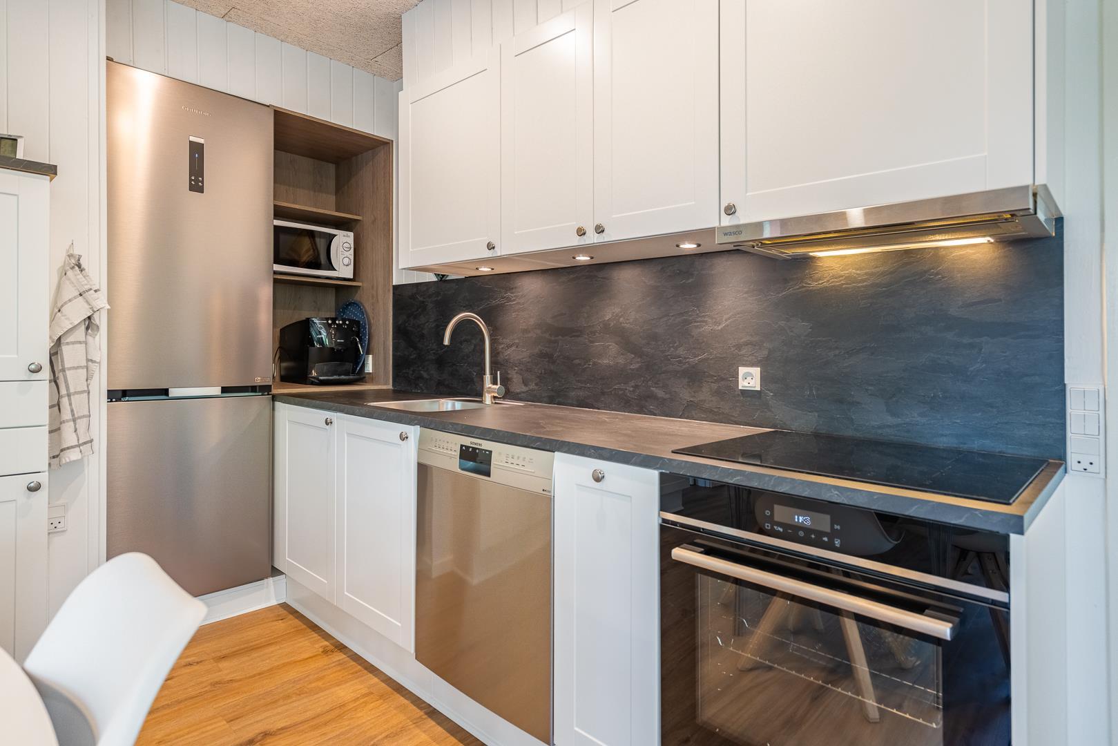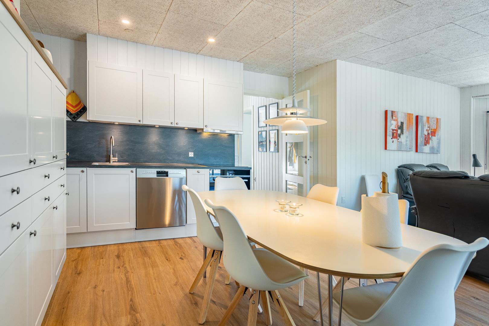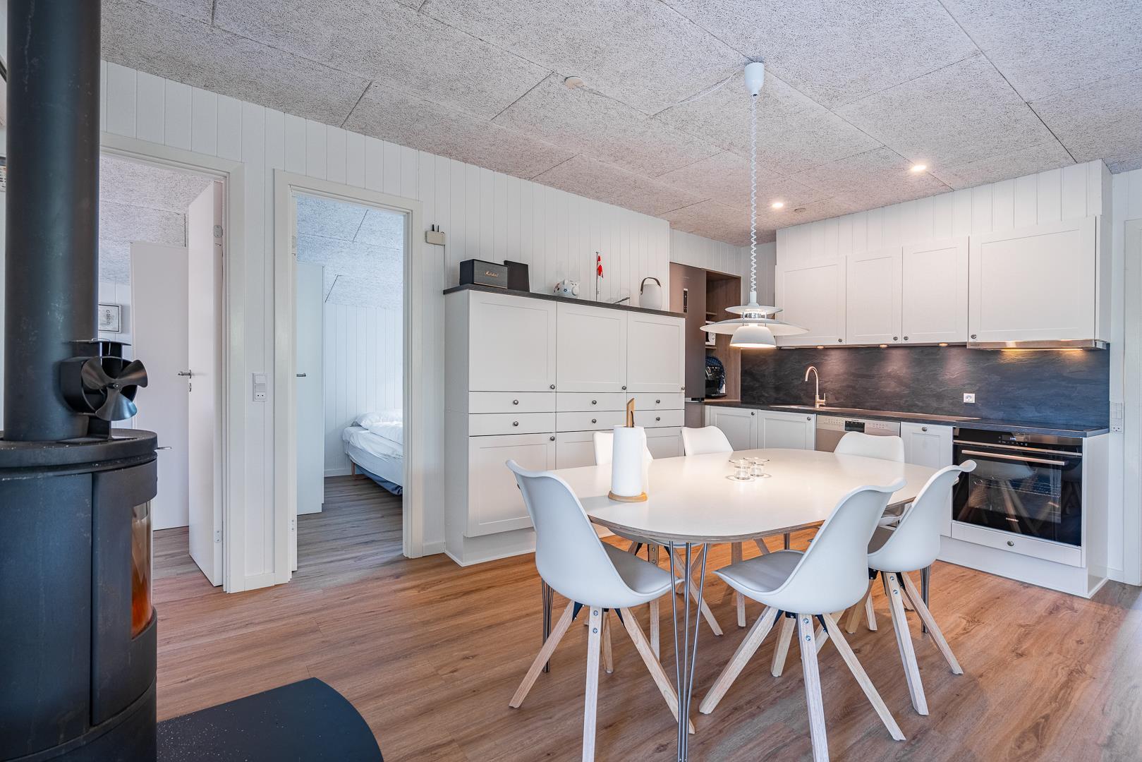Det åbne køkken er fuldt udstyret med opvaskemaskine, god bordplads og alt, hvad du behøver for at lave lækre feriemåltider sammen.