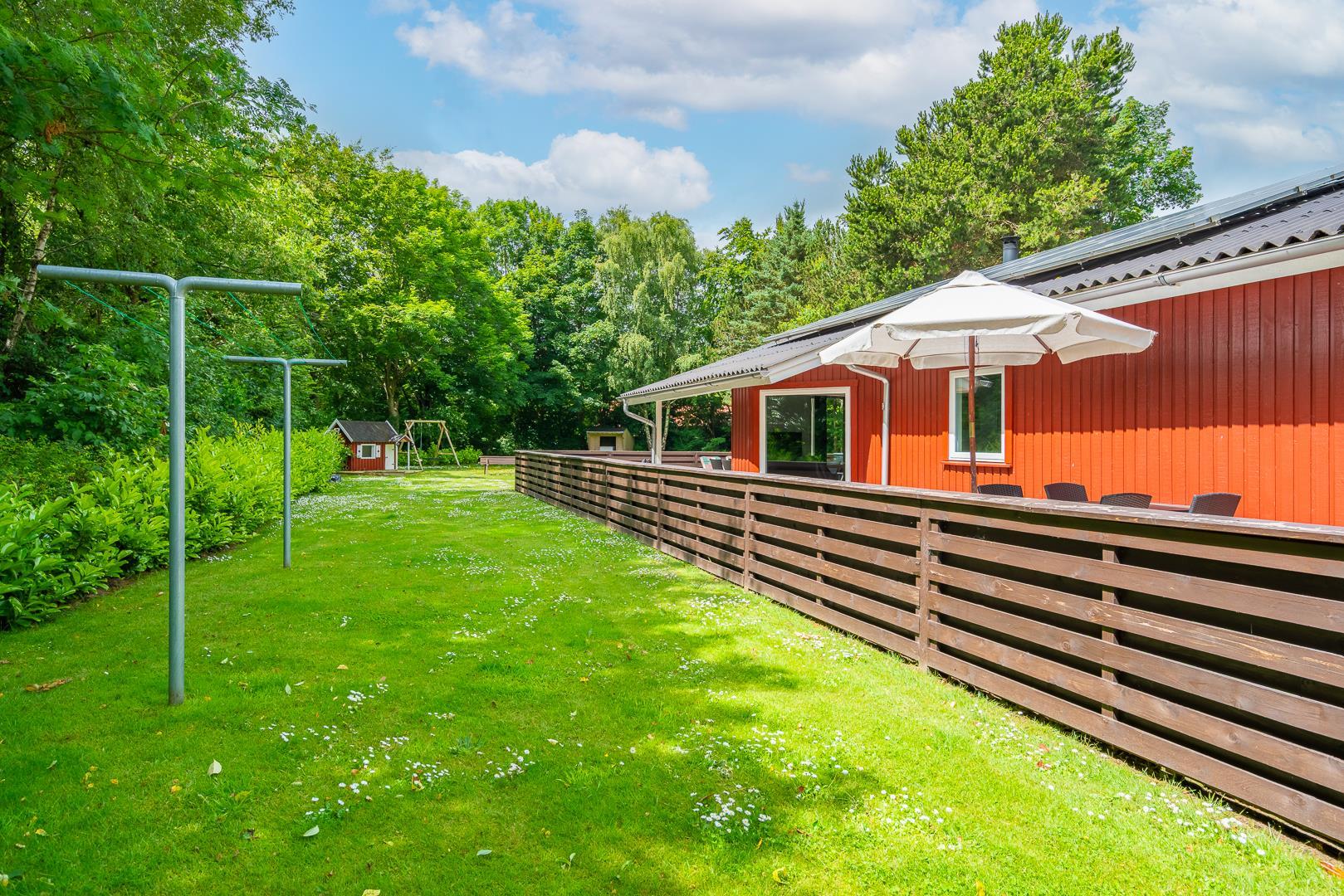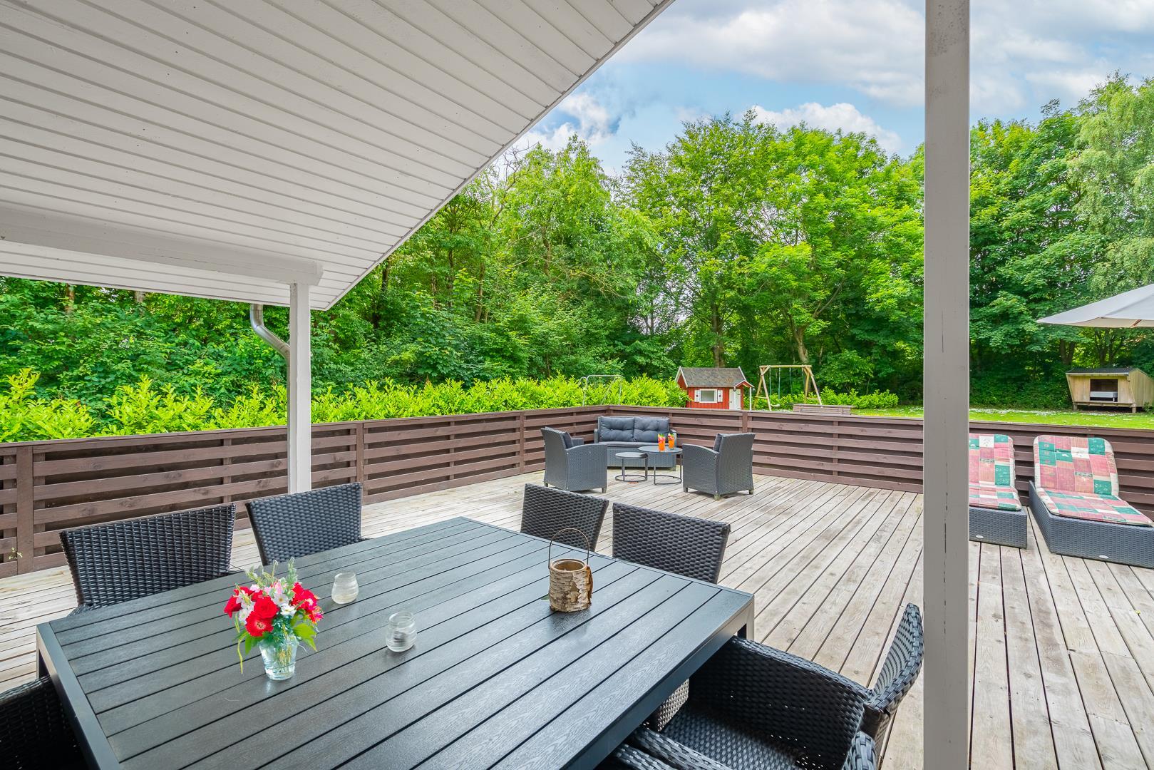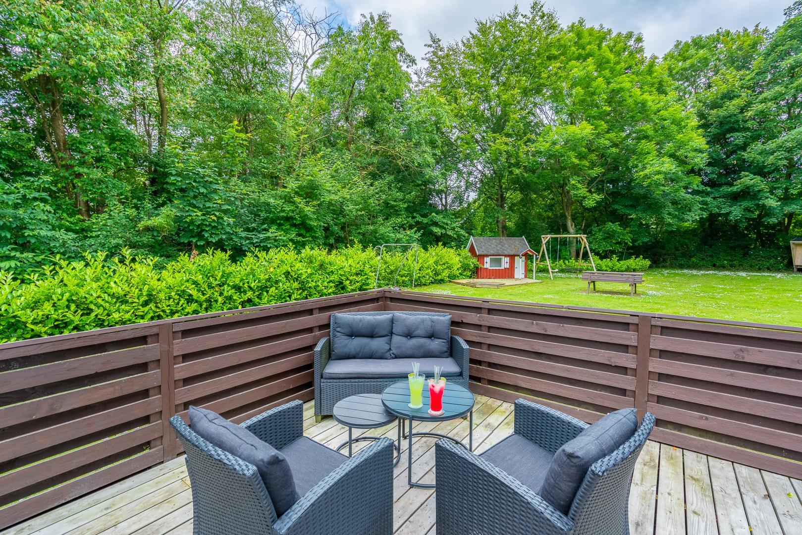 Den lukkede terrasse er perfekt til morgenkaffen eller solrige eftermiddage, mens børnene hygger sig med gynge og sandkasse. Derudover er der en overdækket terrasse, så udelivet kan nydes uanset vejret.