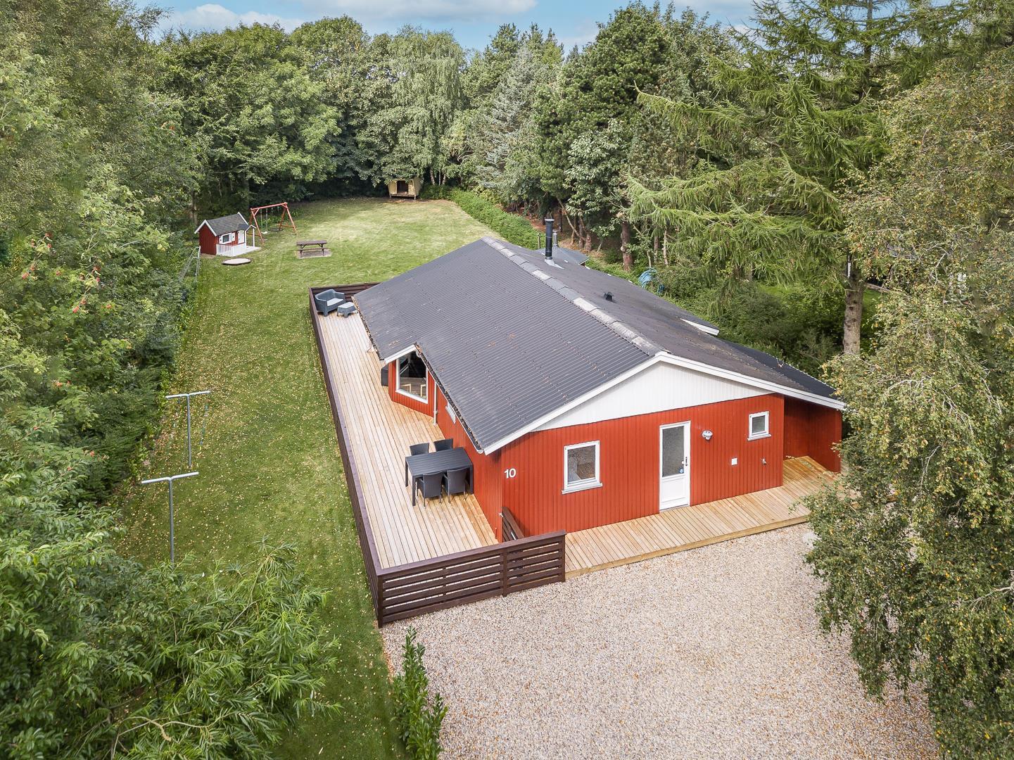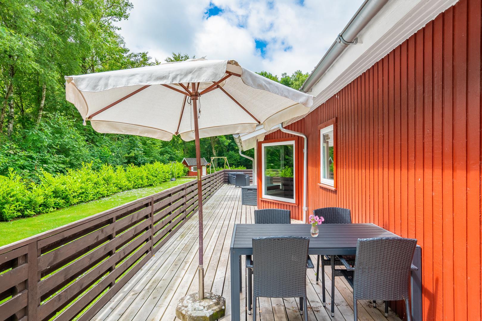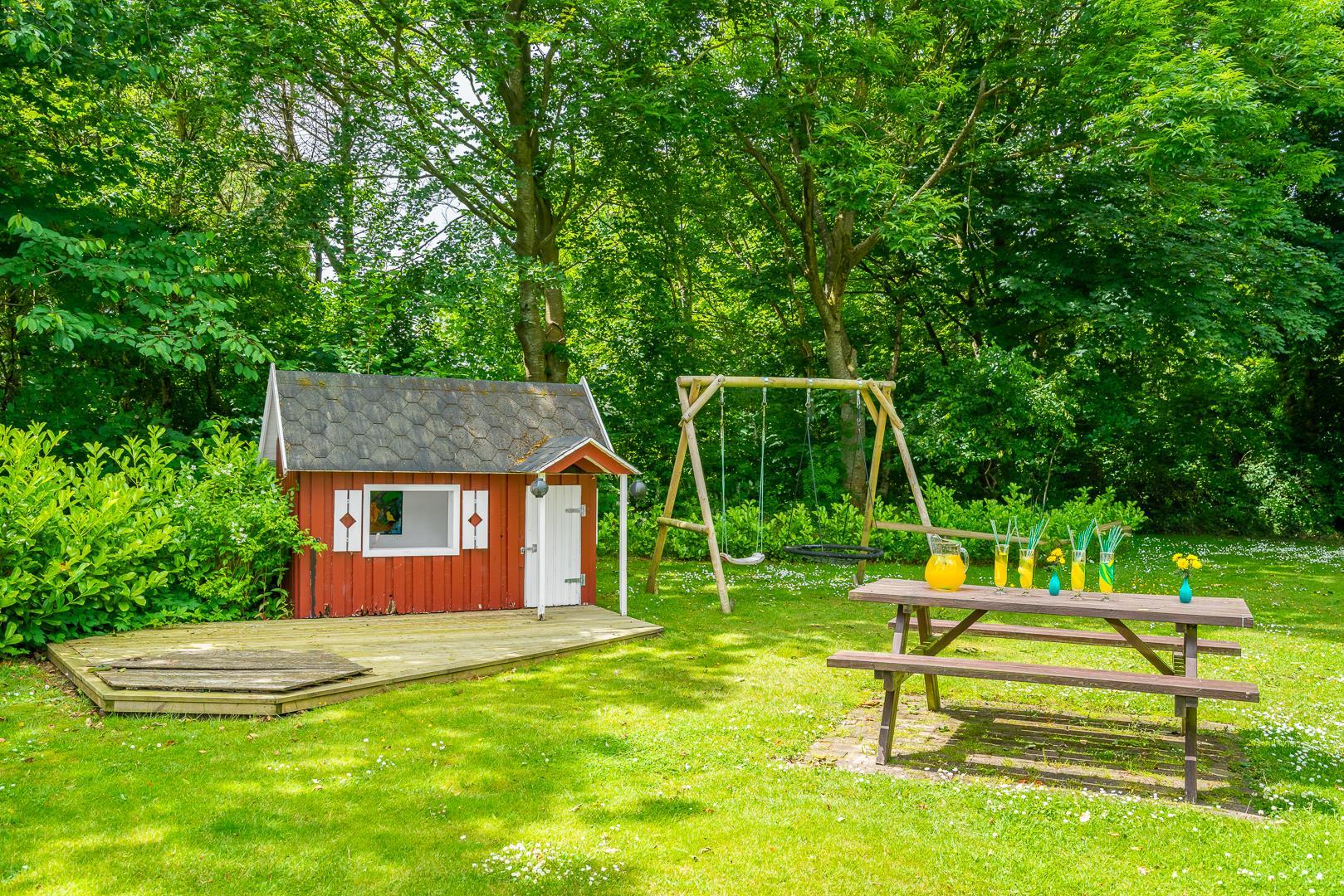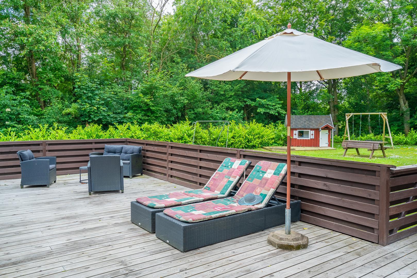 Den lukkede terrasse er perfekt til morgenkaffen eller solrige eftermiddage, mens børnene hygger sig med gynge og sandkasse. Derudover er der en overdækket terrasse, så udelivet kan nydes uanset vejret.