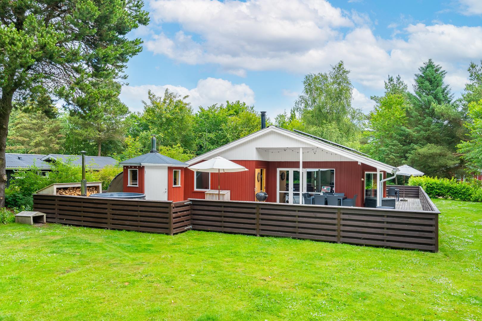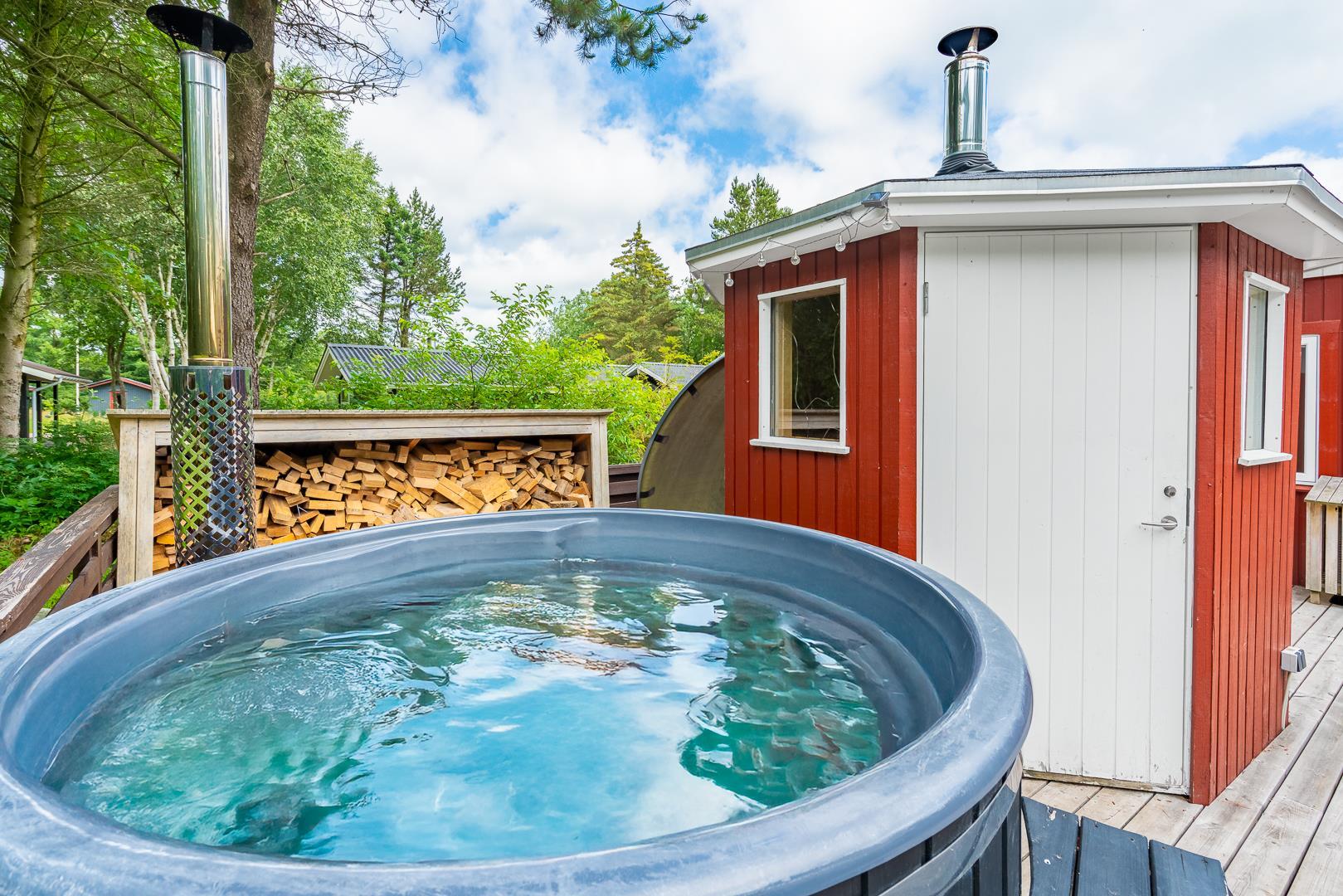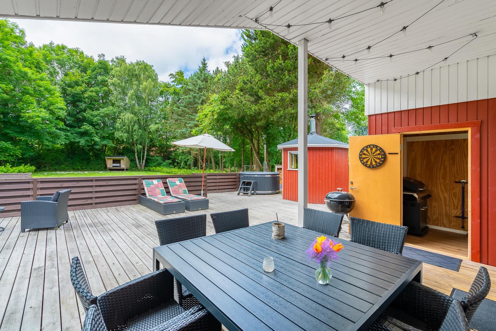 Nøddehaven 10 imponerer med sit store og indbydende udeområde. Her finder du udendørs sauna, udendørs bruser og en badetønde, hvor du kan slappe af under åben himmel – måske endda under stjernerne.