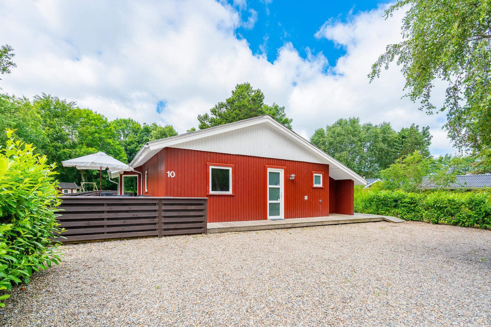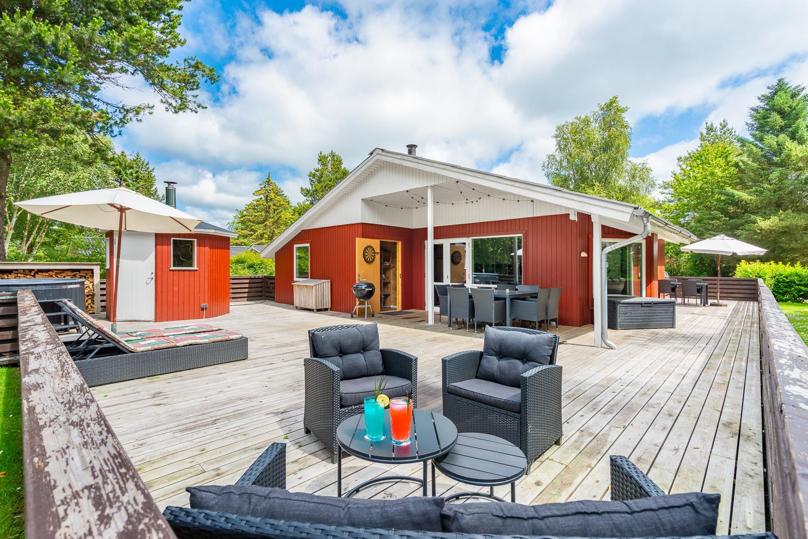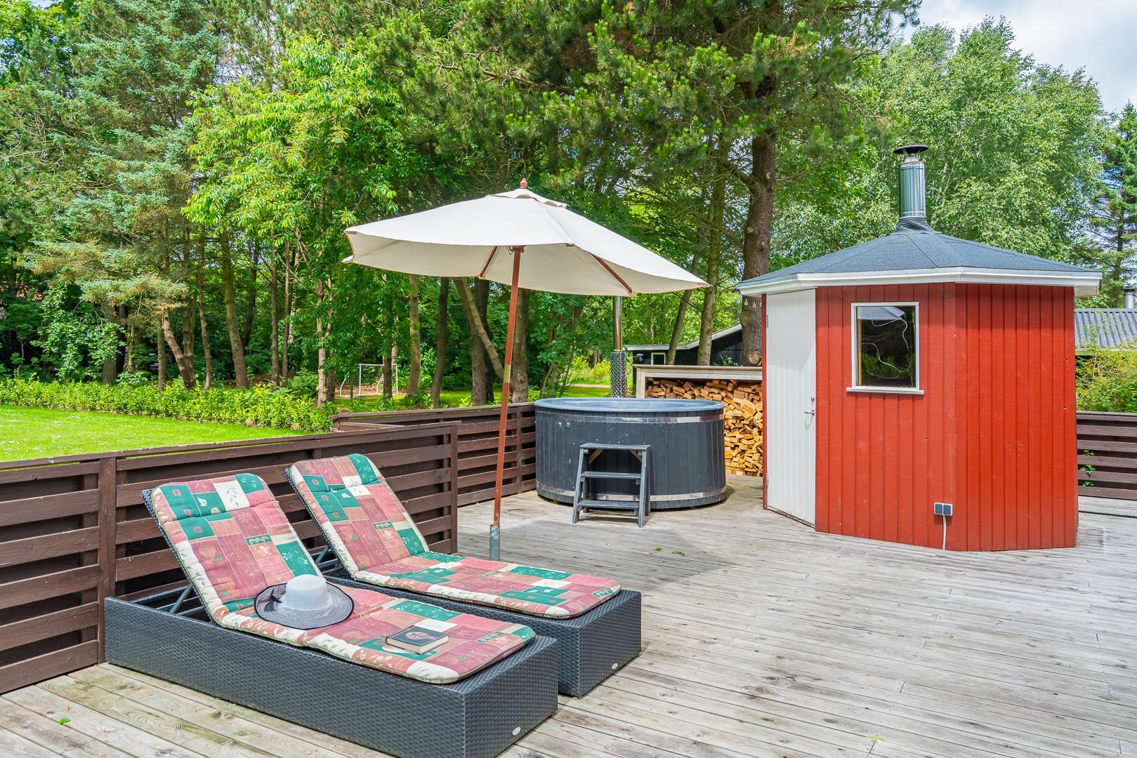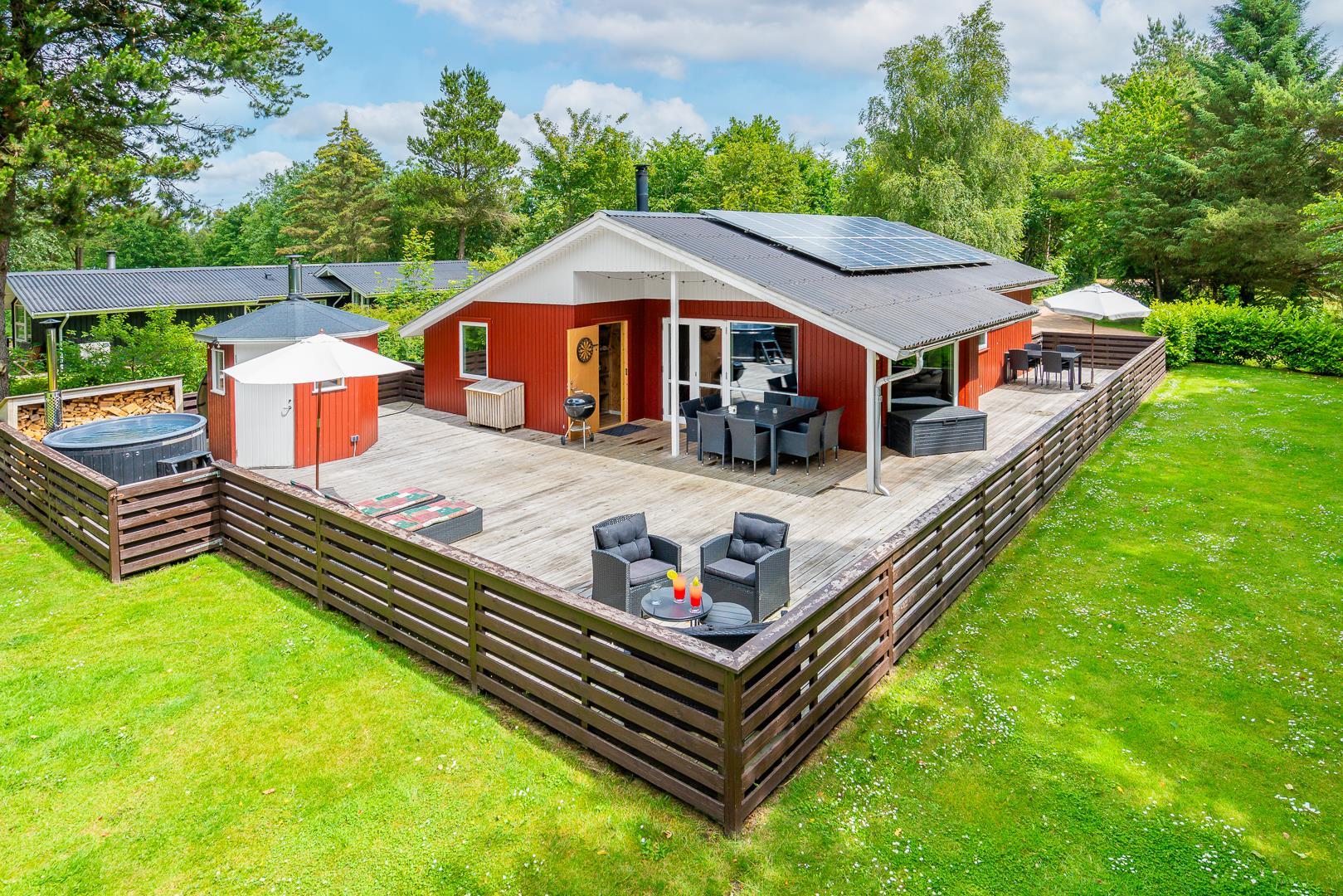 Nøddehaven 10 imponerer med sit store og indbydende udeområde. Her finder du udendørs sauna, udendørs bruser og en badetønde, hvor du kan slappe af under åben himmel – måske endda under stjernerne.