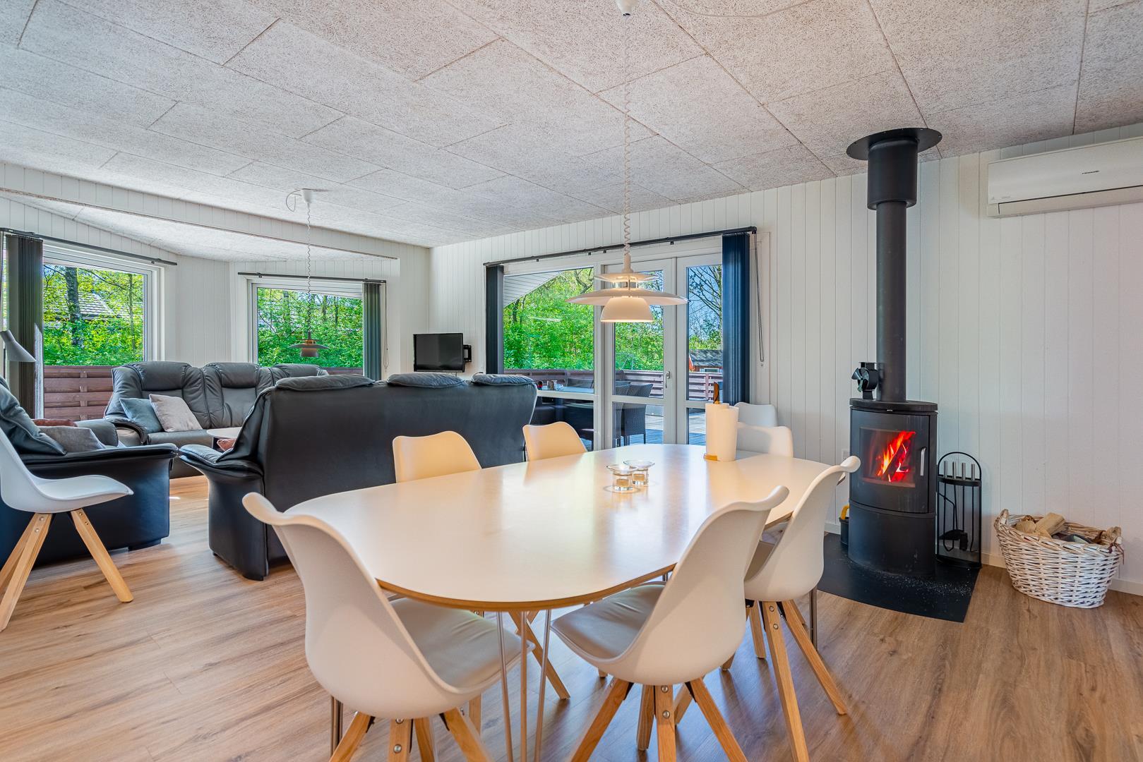 Husets samlingspunkt er den lyse opholds- og spiseafdeling med brændeovn, som skaber ekstra hygge på kølige dage. En energivenlig varmepumpe og gulvvarme på badeværelset sikrer et behageligt indeklima året rundt.