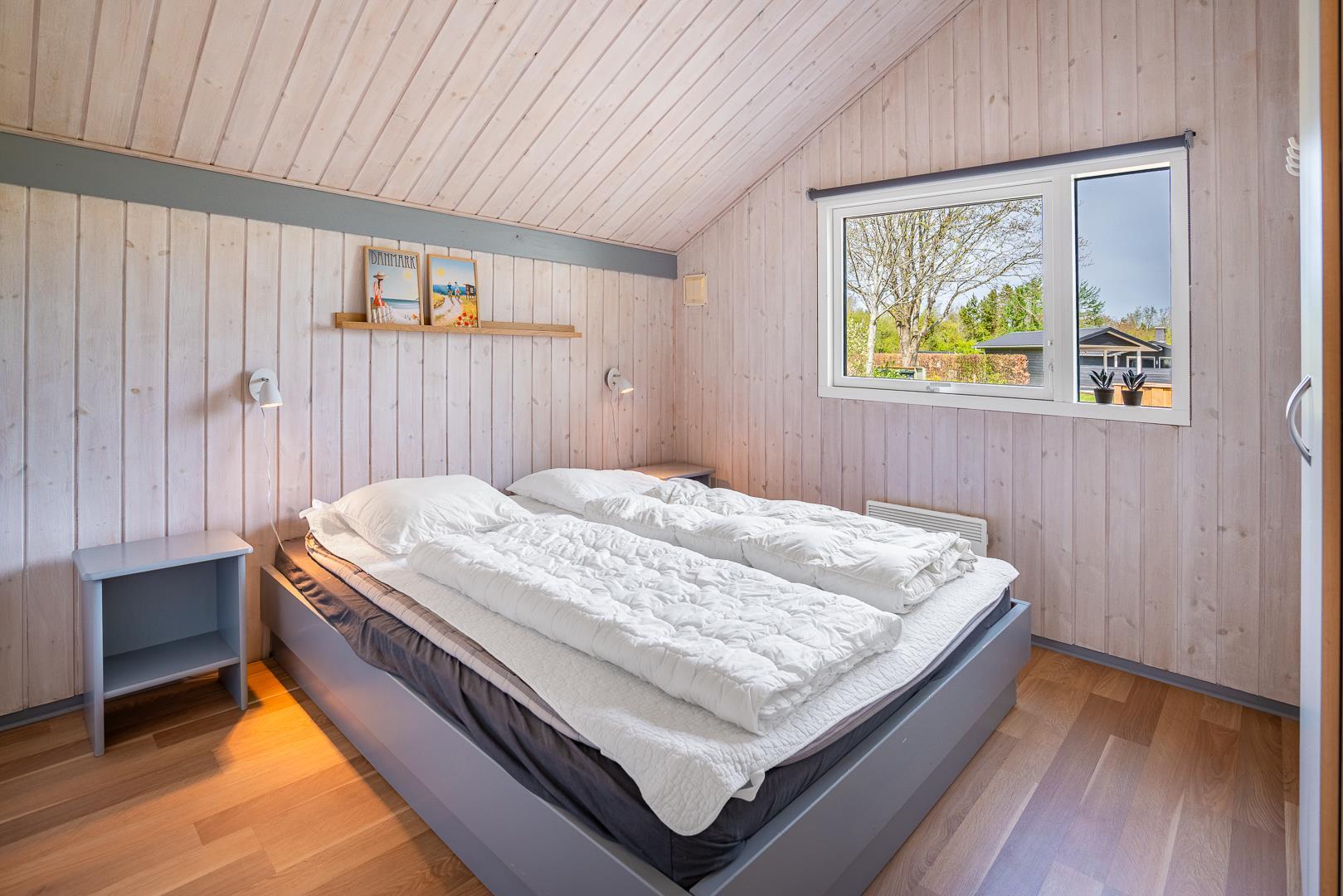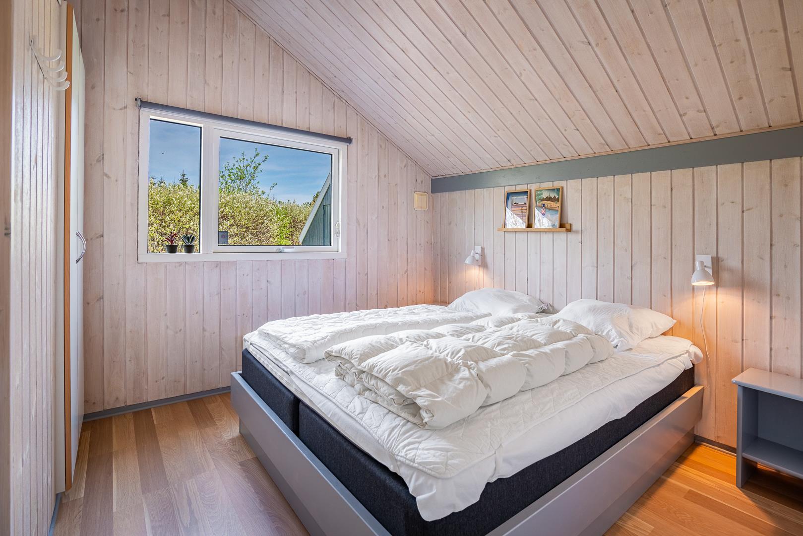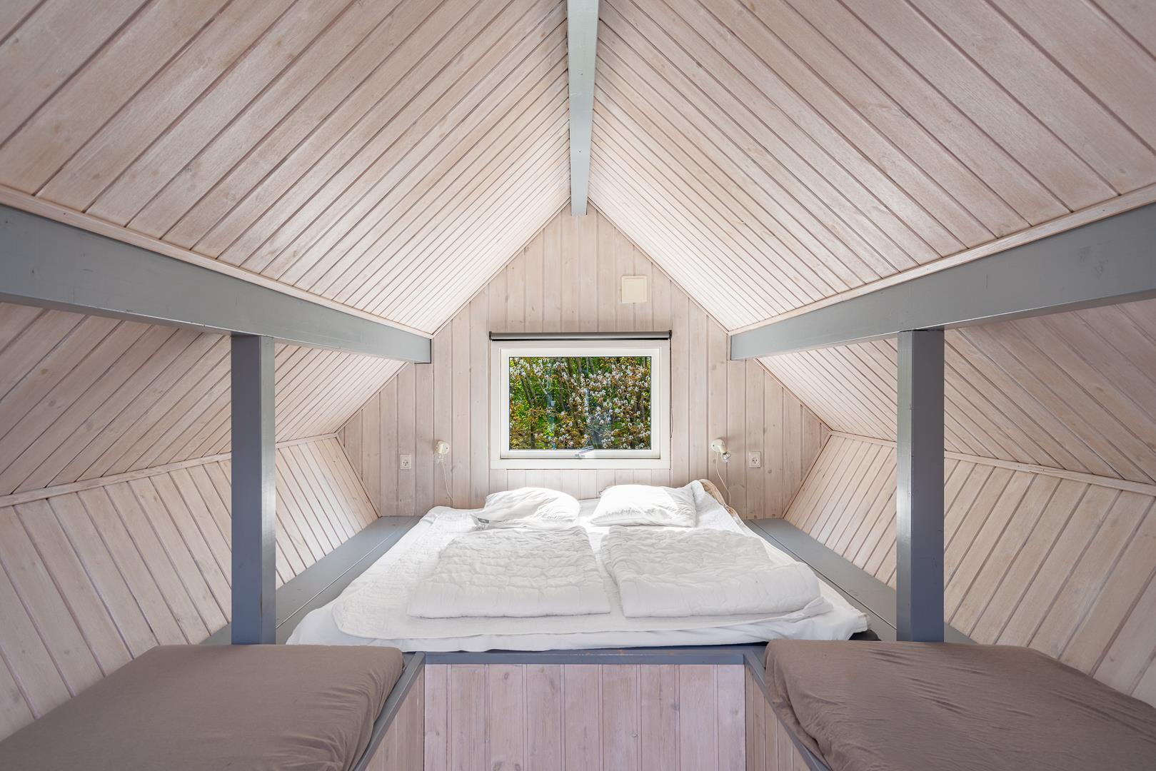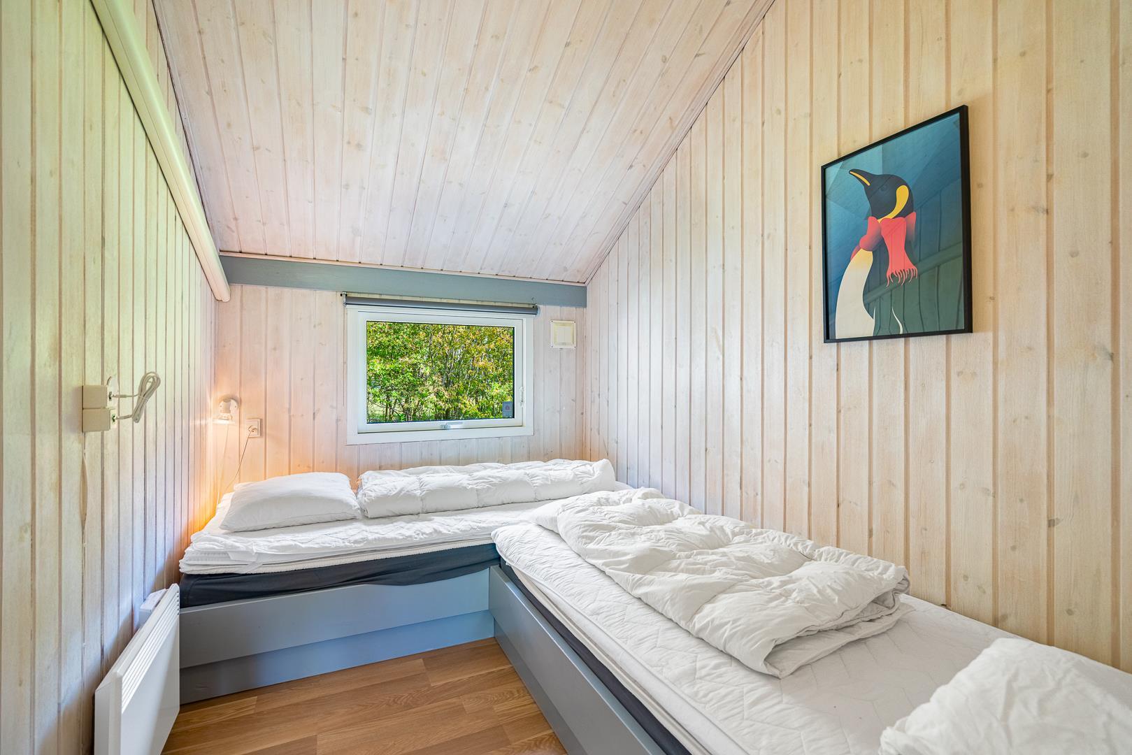 2 dobbeltsenge (160 x 200 cm) og 2 enkeltsenge (90 x 200 cm).
