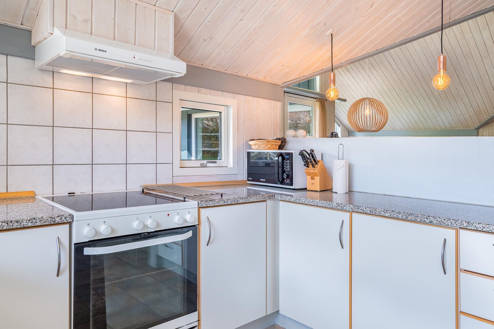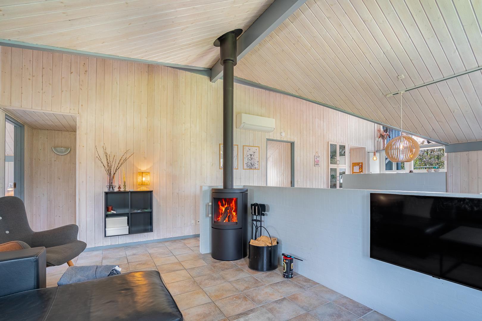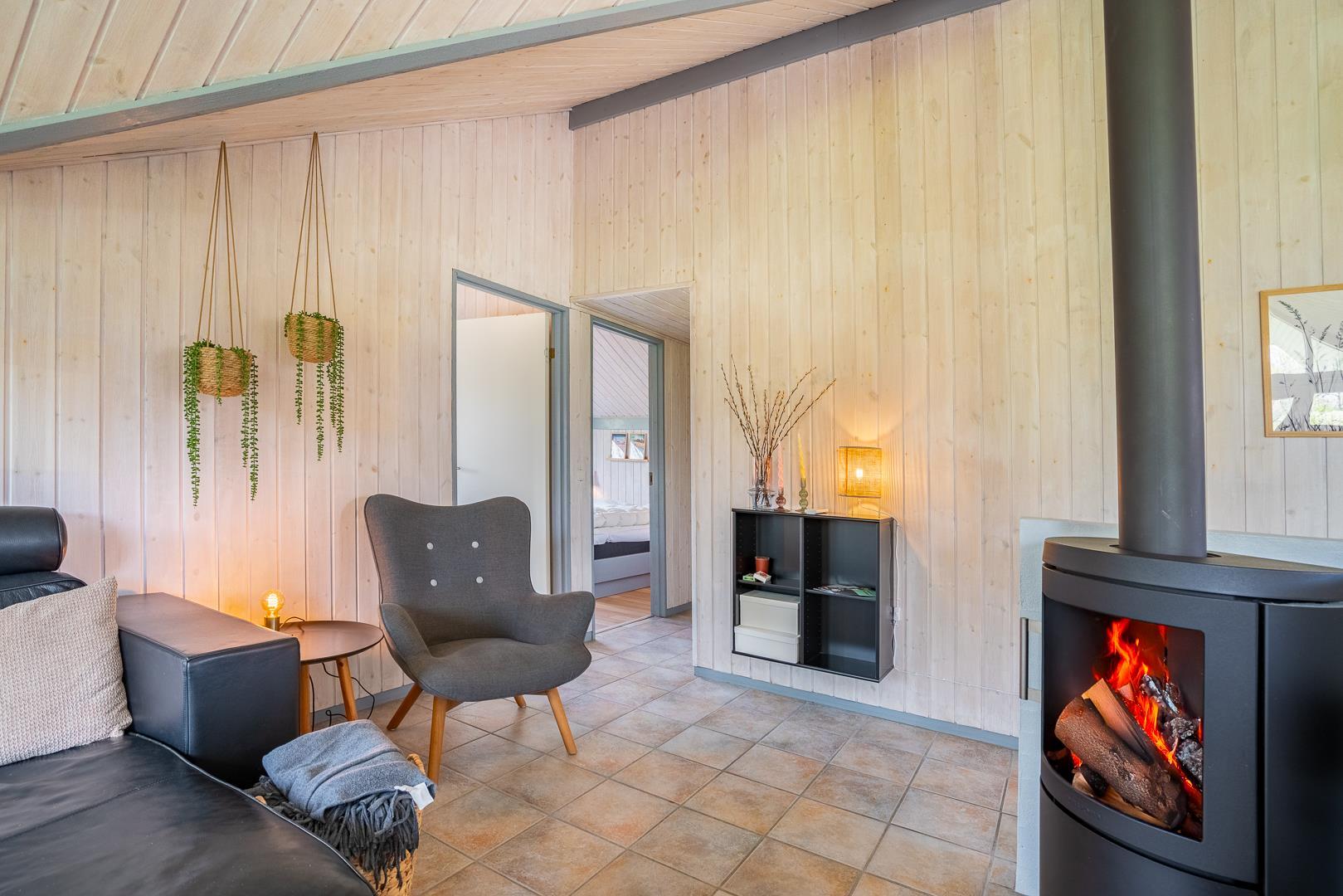 Husets naturlige samlingspunkt er den indbydende opholdsstue med brændeovn og gulvvarme, som skaber en behagelig varme – også på køligere dage. Det åbne køkken er ligeledes udstyret med gulvvarme, opvaskemaskine og alt, hvad I behøver til fælles madlavning. Her er der plads til nærvær, gode samtaler og lange, afslappede aftener.