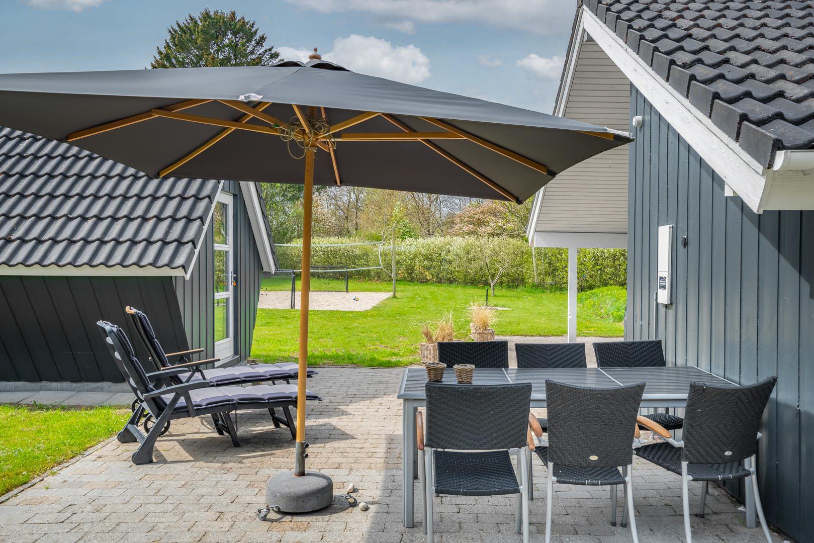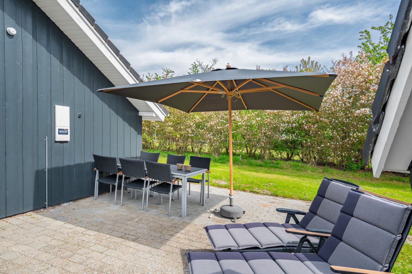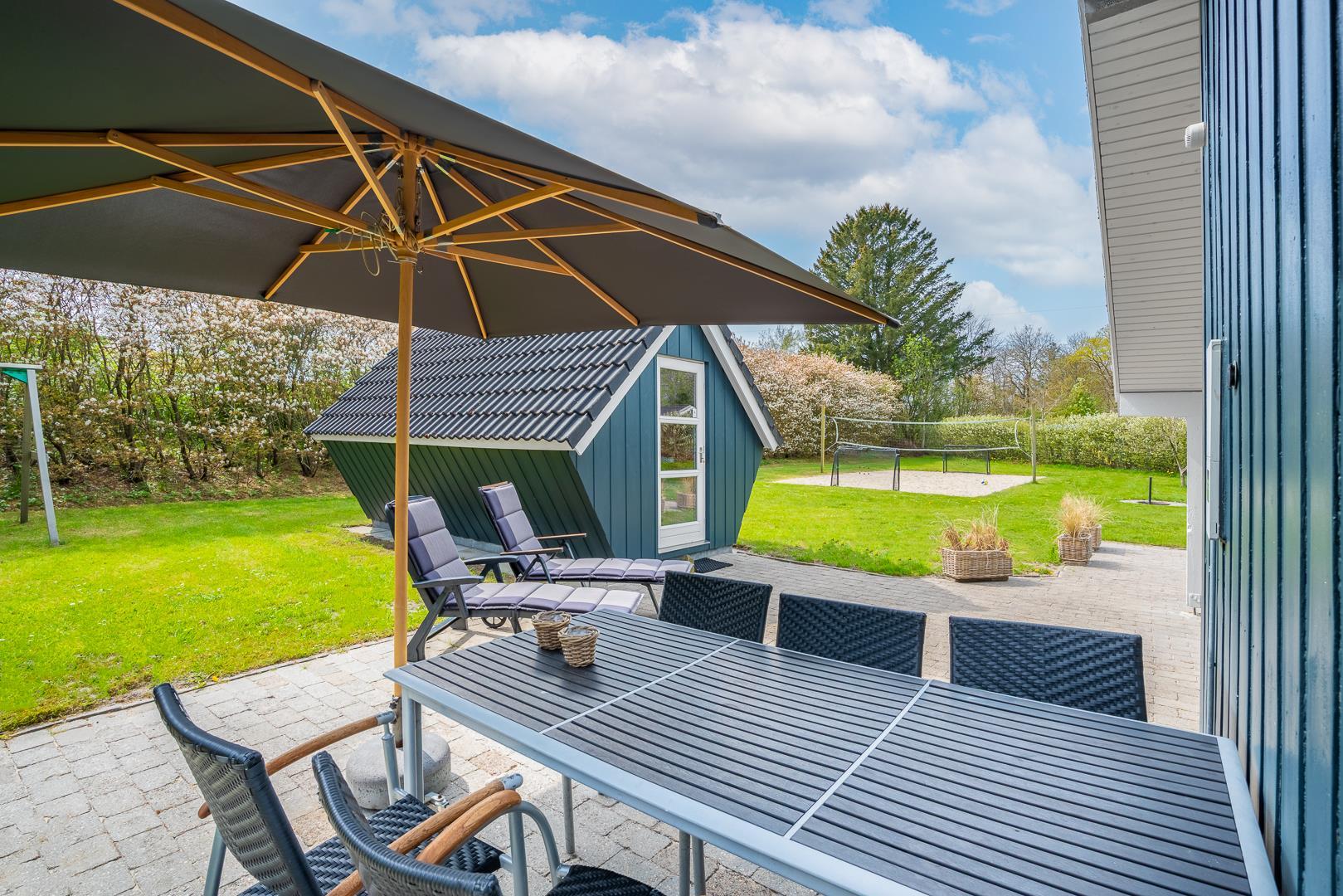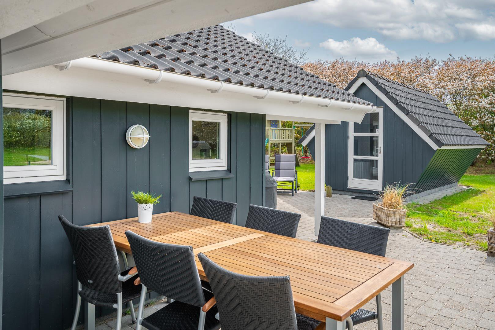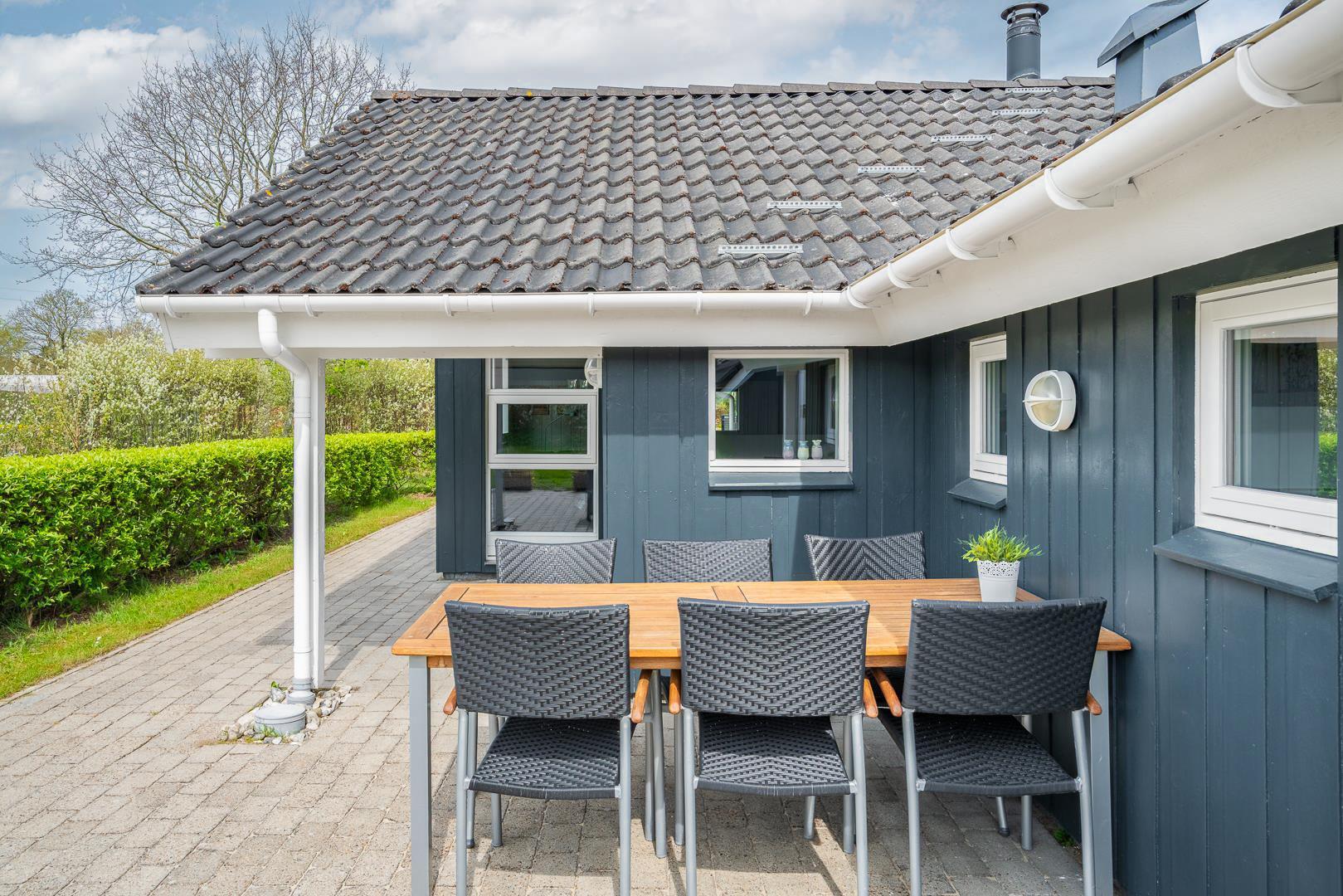 Den overdækkede terrasse indbyder til afslapning i det fri – hvad enten det er med grillmad, en god bog eller bare stilheden omkring jer. Den afskærmede beliggenhed giver både privatliv og en dejlig fornemmelse af at være tæt på naturen.