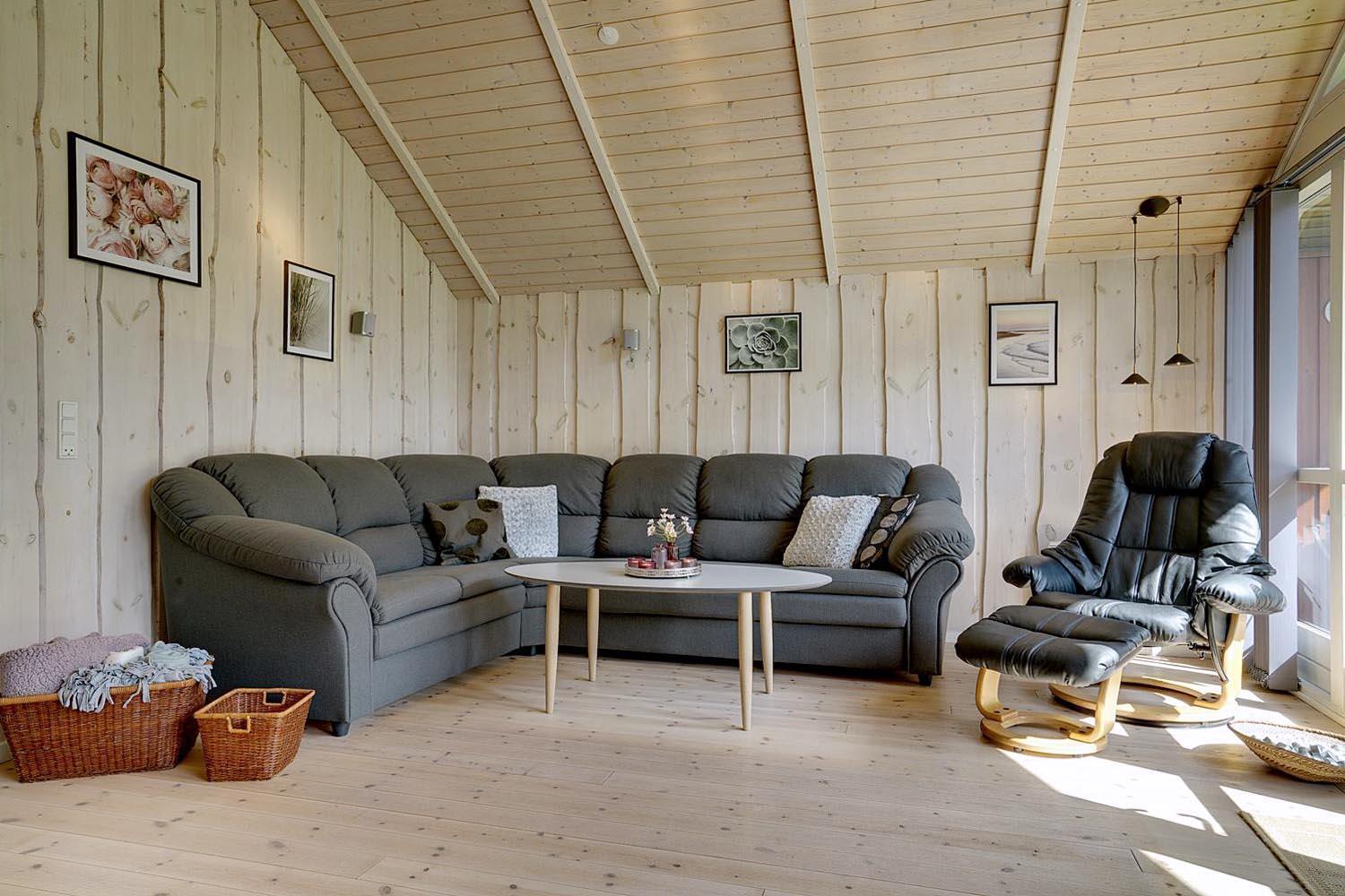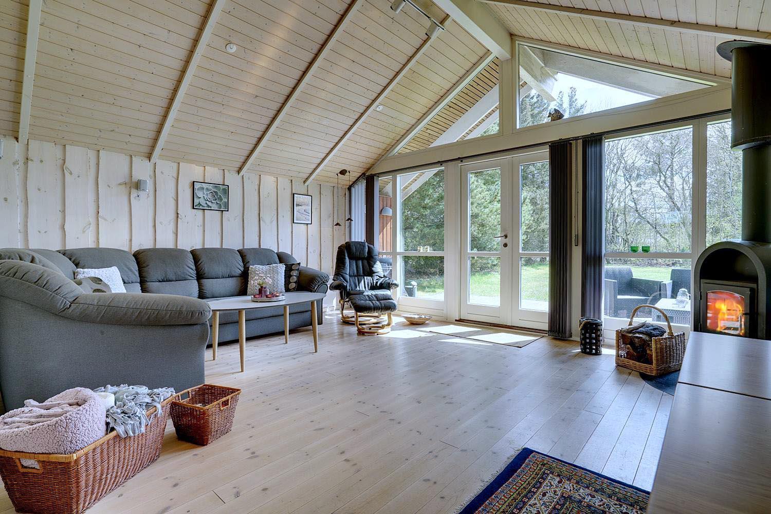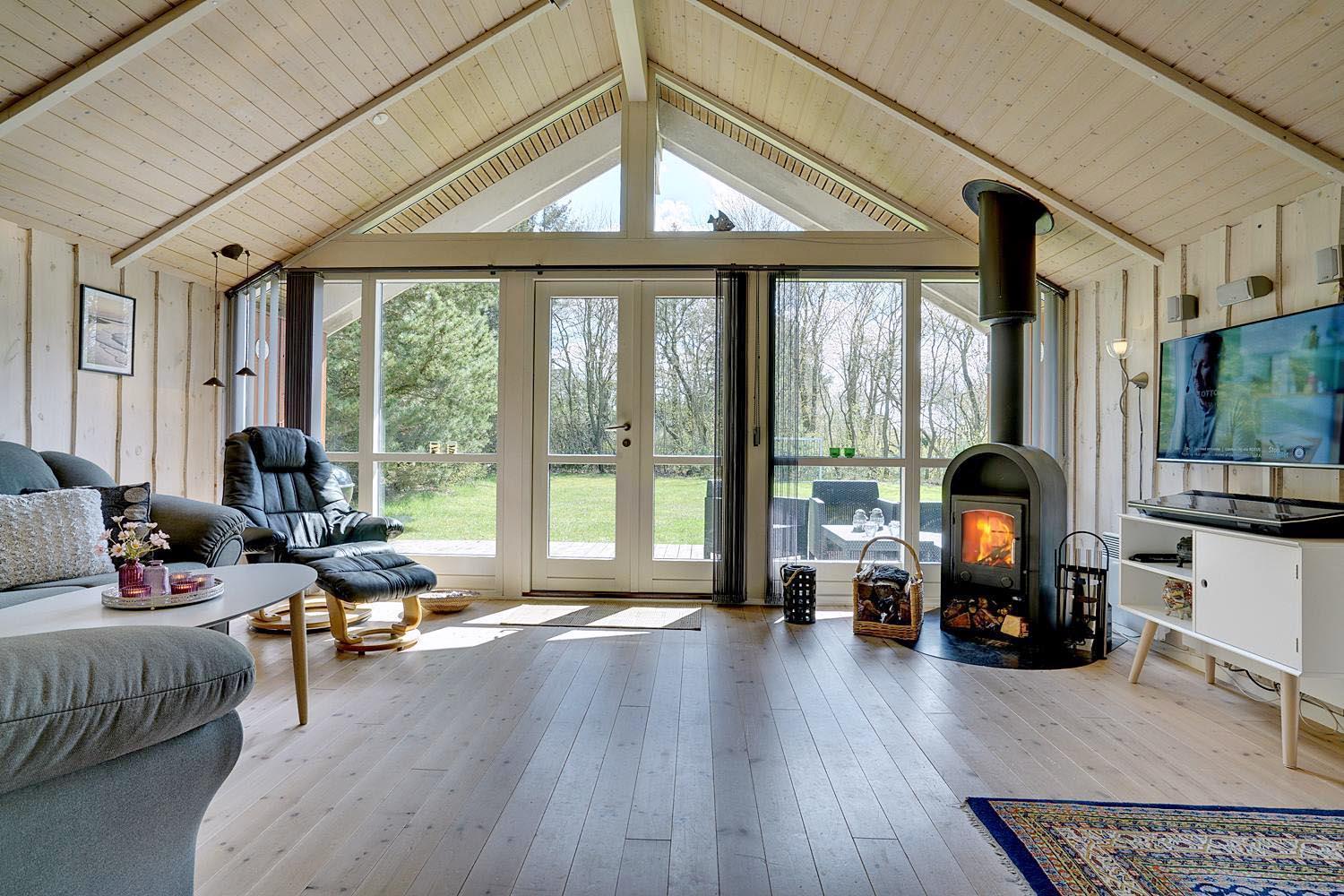 Den lyse stue er sommerhusets naturlige samlingspunkt, hvor køkken, spiseplads og sofaområde smelter sammen til ét – perfekt til samvær og afslapning. Brændeovnen spreder varme og stemning på kølige dage, mens varmepumpen sørger for et behageligt indeklima året rundt.