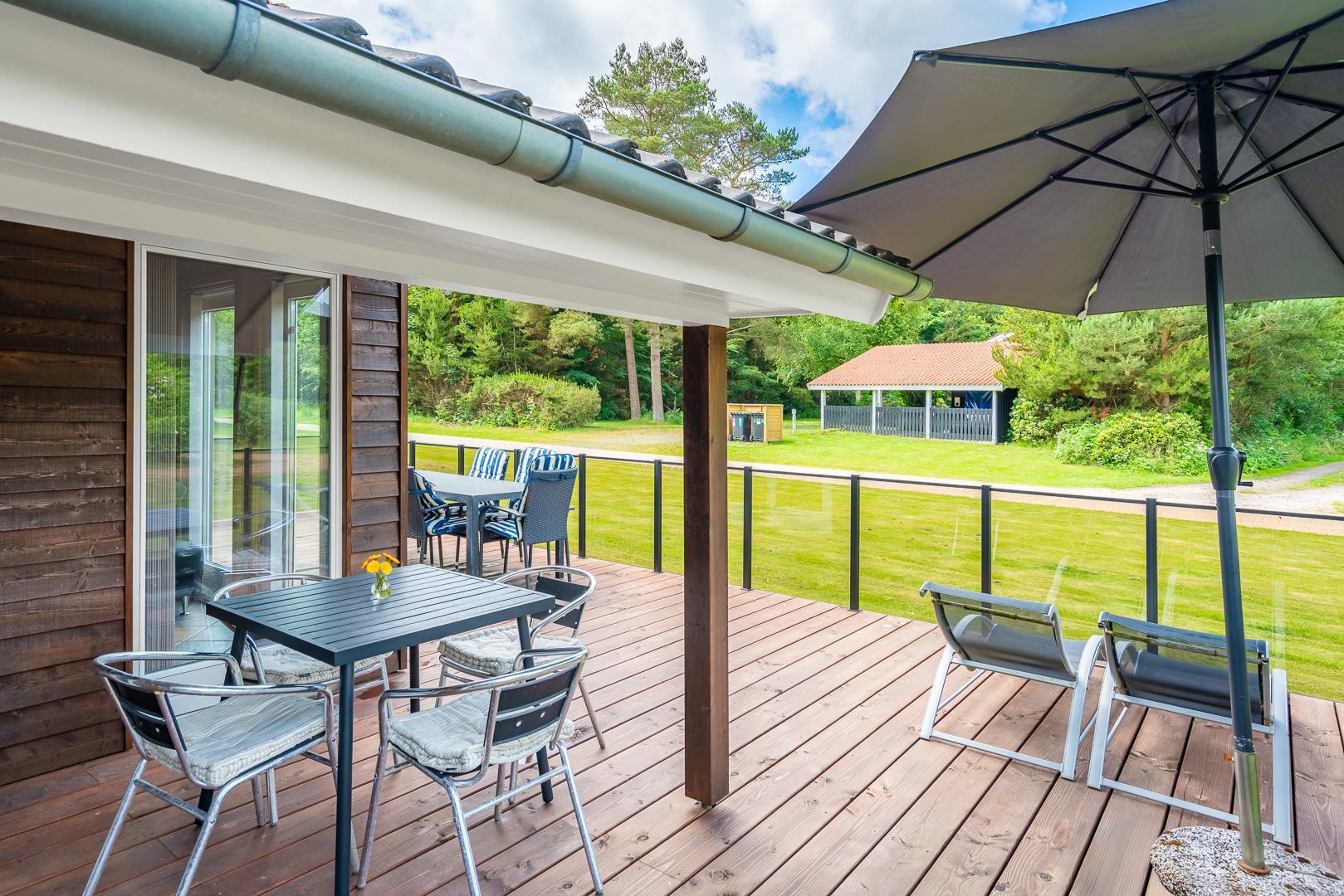 Feriehuset har et pænt badeværelse med spa og sauna, som giver ekstra komfort. Det kombinerede køkken og stue er husets samlingspunkt med spiseplads samt TV i både stue og værelser. Udenfor kan man nyde terrassen, der går rundt om det meste af huset, både åben og overdækket, samt en dejlig grillplads.