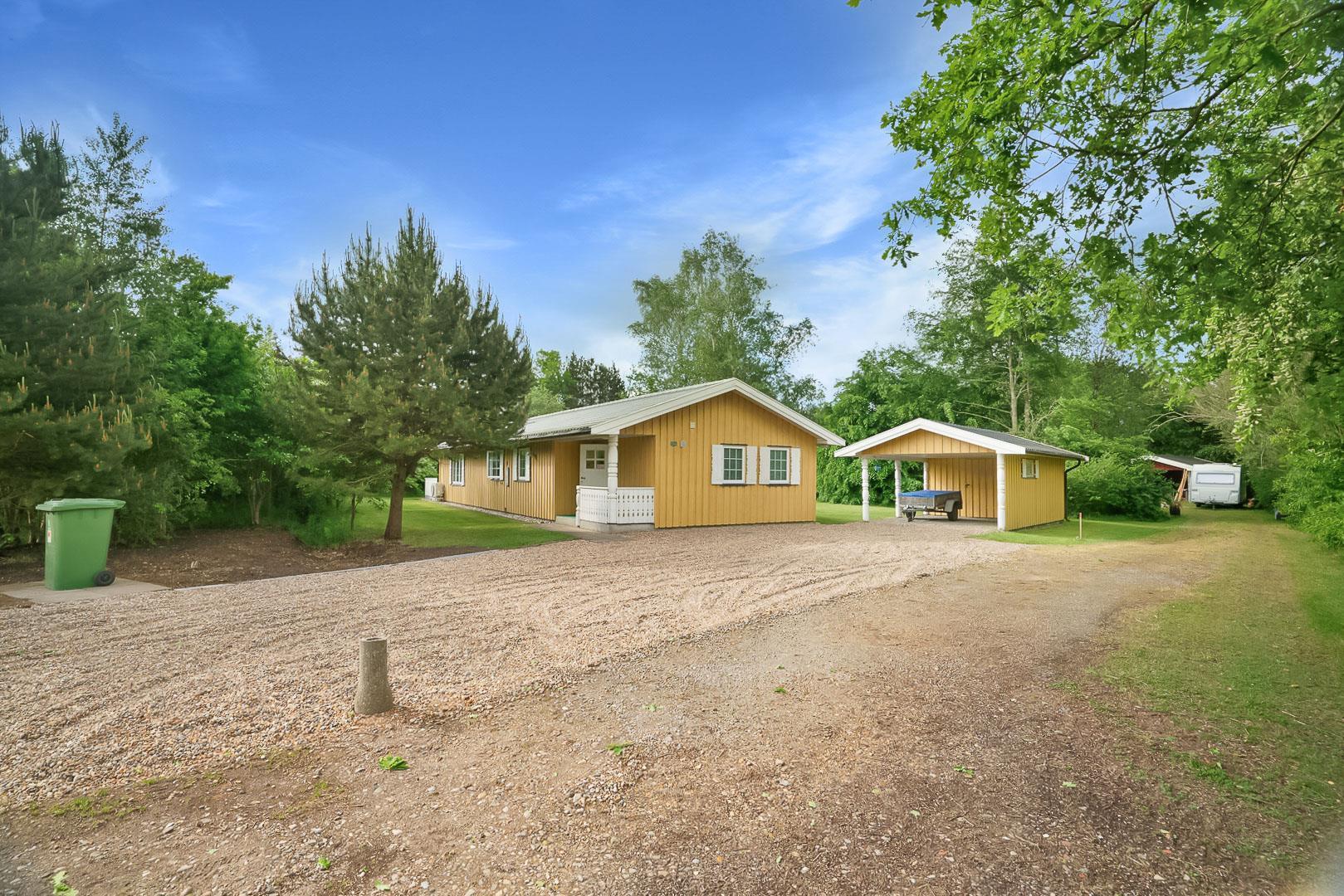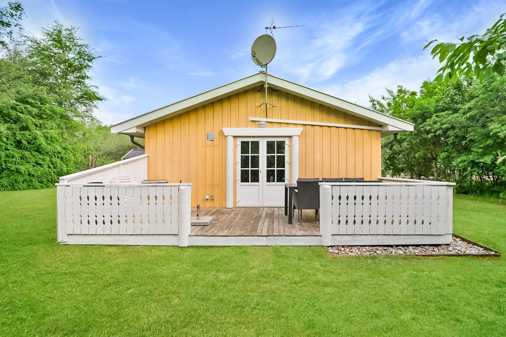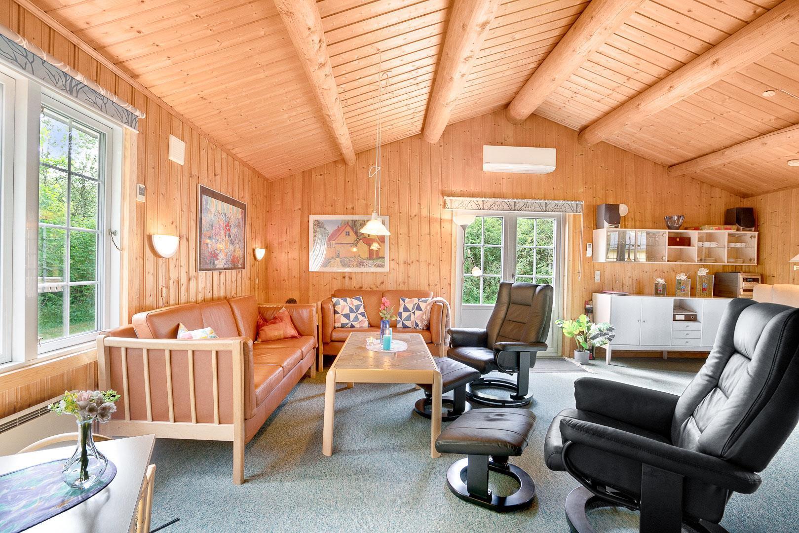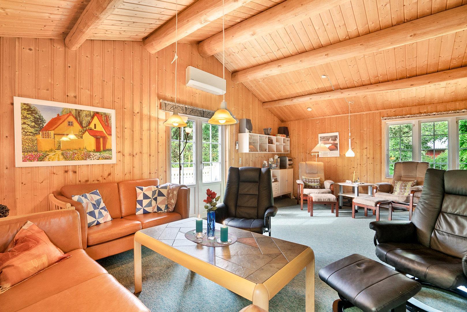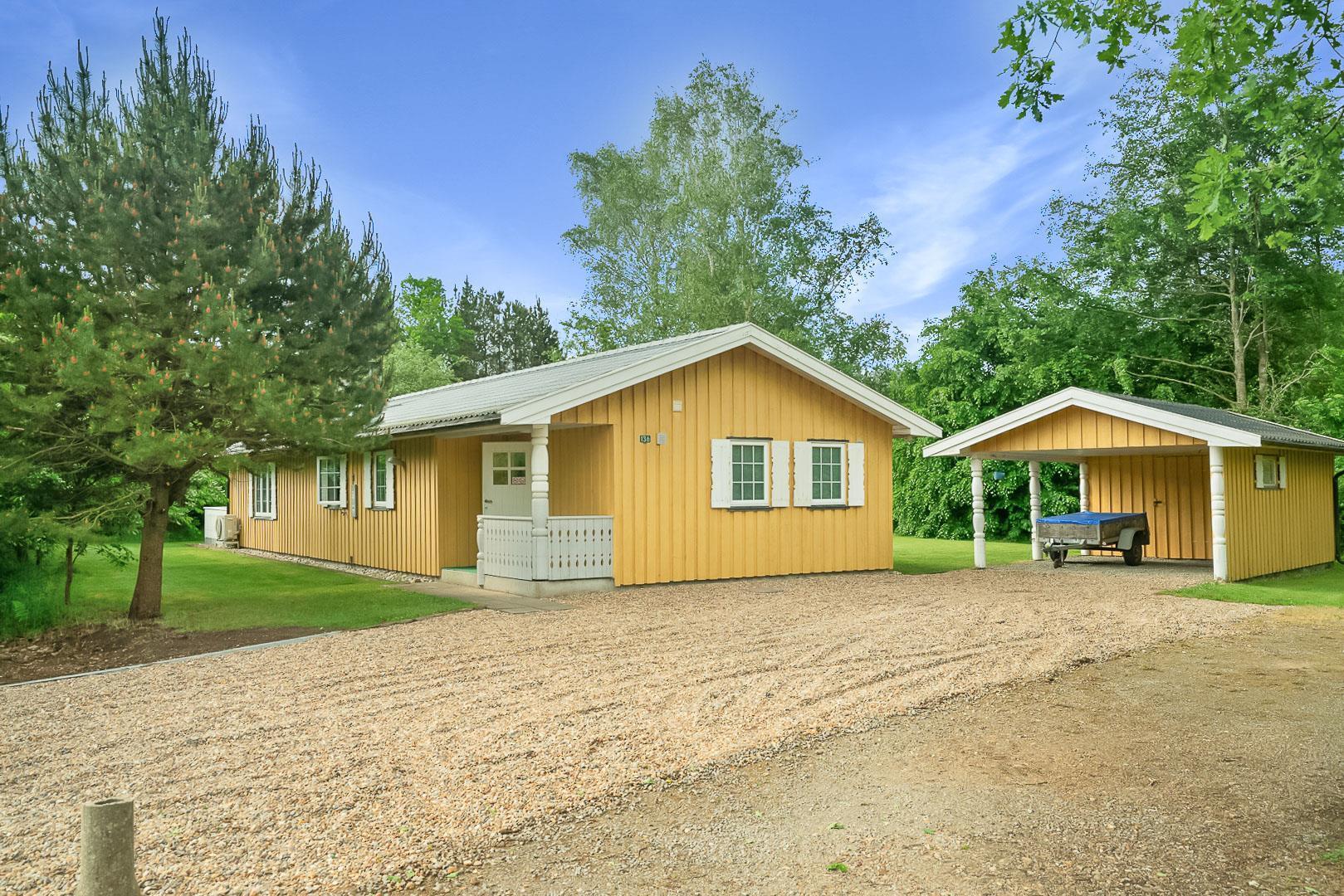Hyggelig bjælkehytte beliggende på en lukket og ugenert naturgrund. Huset har synlige loftbjælker og er med sin specielle byggestil noget ganske særligt. Køkkenet er lukket af fra den store og rummelige stue med brændeovn, der er desuden direkte udgang til en sydvendt terrasse. For de yngre familiemedlemmer findes der bl.a. legehus og gynge i haven. Ferielandets aktivitetscenter ligger i gåafstand fra huset, hvor I ligeledes finder et lille supermarked, hvor der kan købes det mest nødvendige, en restaurant og fælles grill-område.