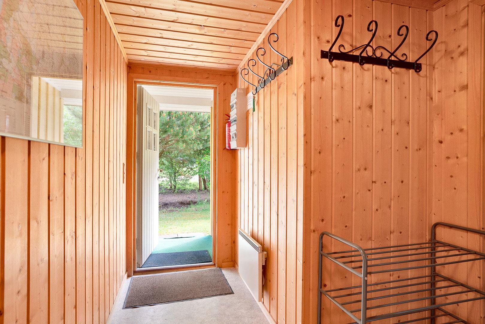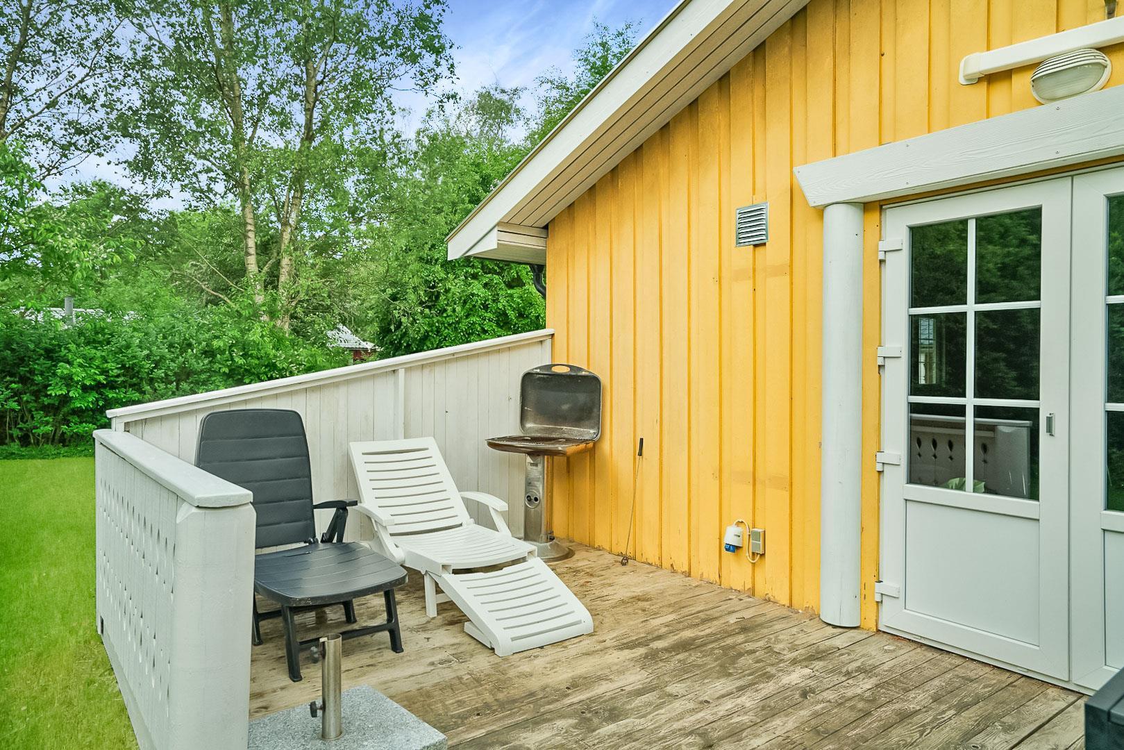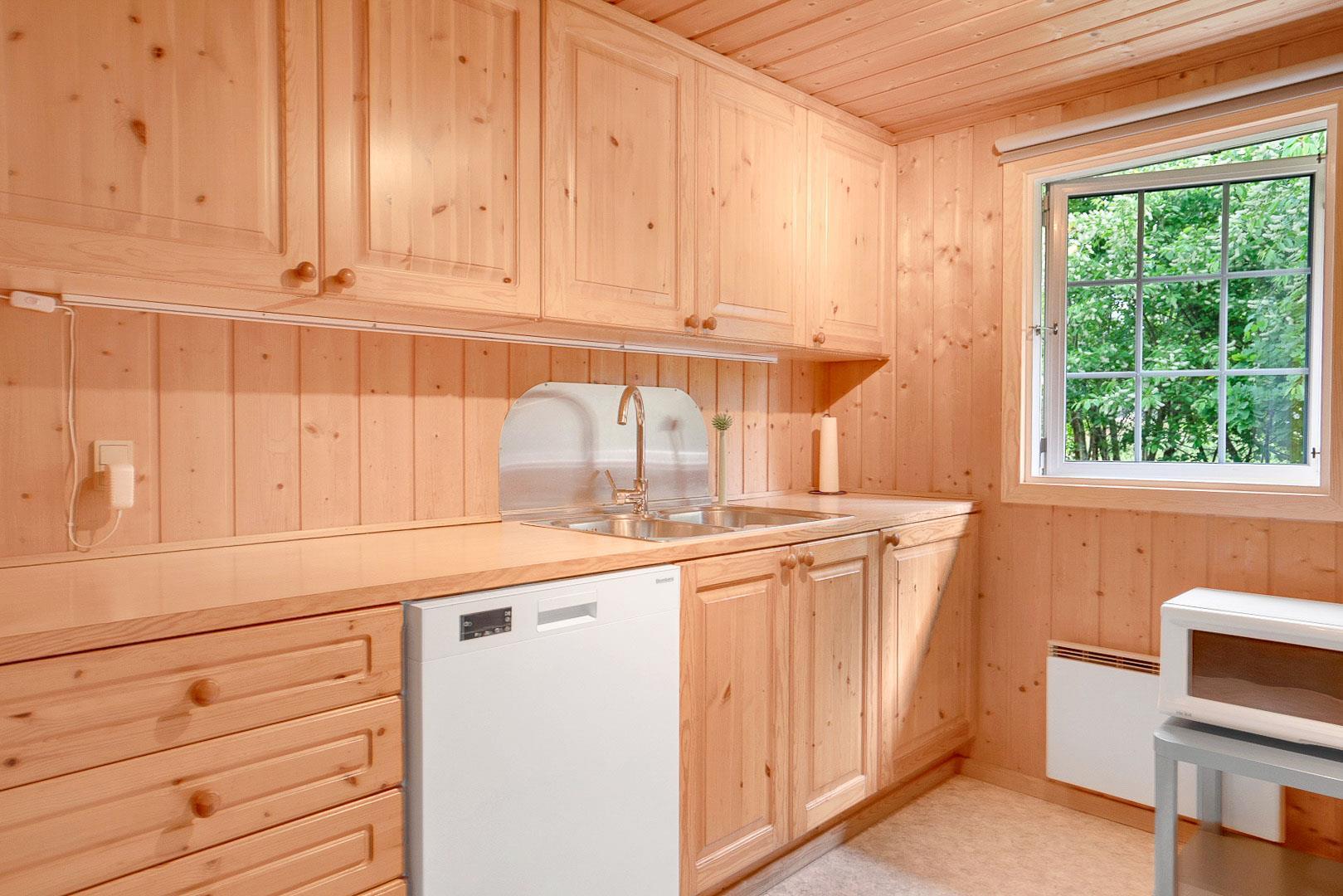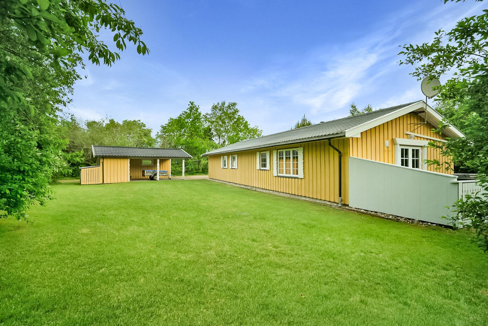 Hyggelig bjælkehytte beliggende på en lukket og ugenert naturgrund. Huset har synlige loftbjælker og er med sin specielle byggestil noget ganske særligt. Køkkenet er lukket af fra den store og rummelige stue med brændeovn, der er desuden direkte udgang til en sydvendt terrasse. For de yngre familiemedlemmer findes der bl.a. legehus og gynge i haven. Ferielandets aktivitetscenter ligger i gåafstand fra huset, hvor I ligeledes finder et lille supermarked, hvor der kan købes det mest nødvendige, en restaurant og fælles grill-område.