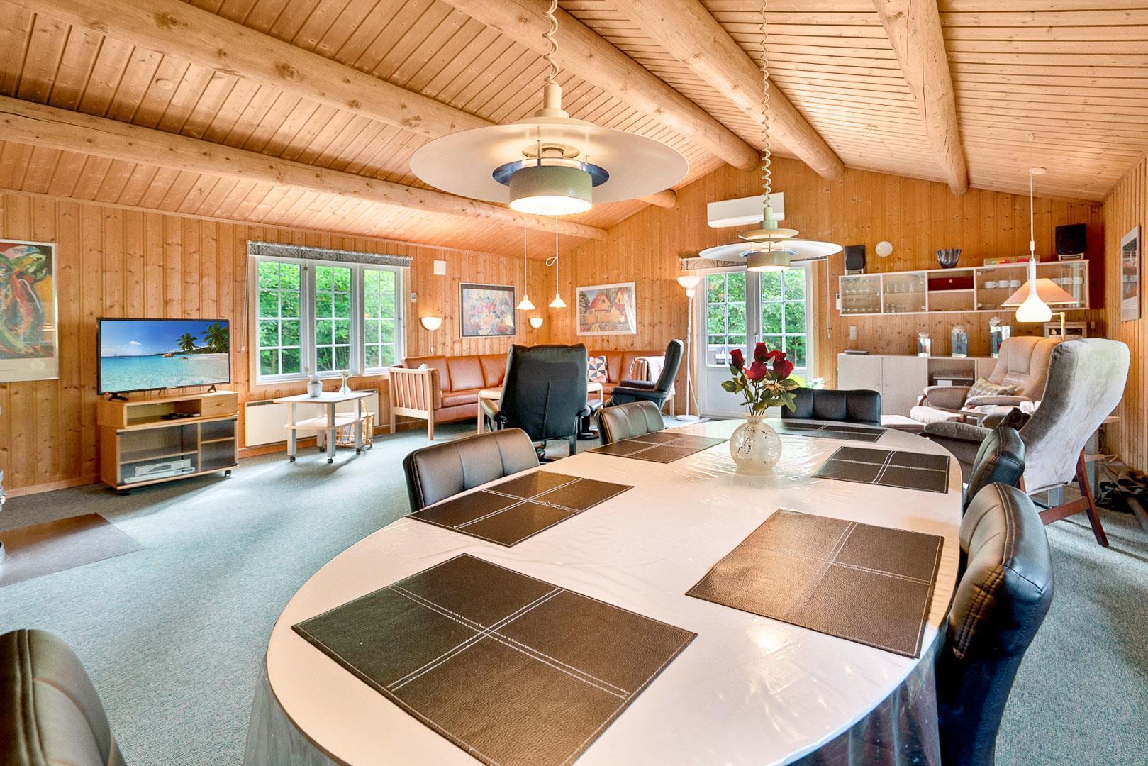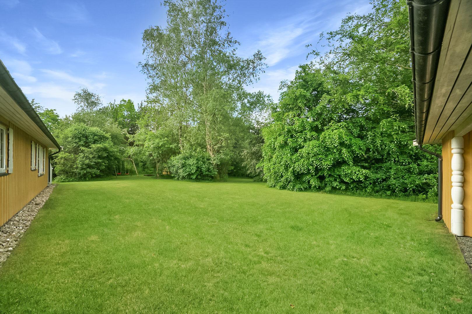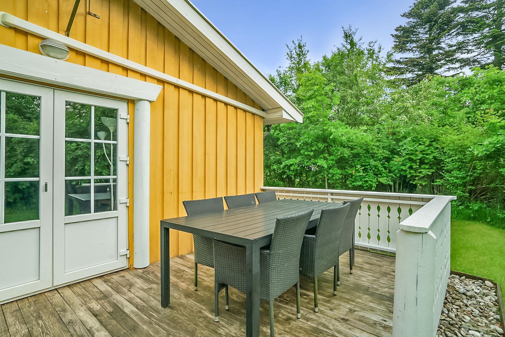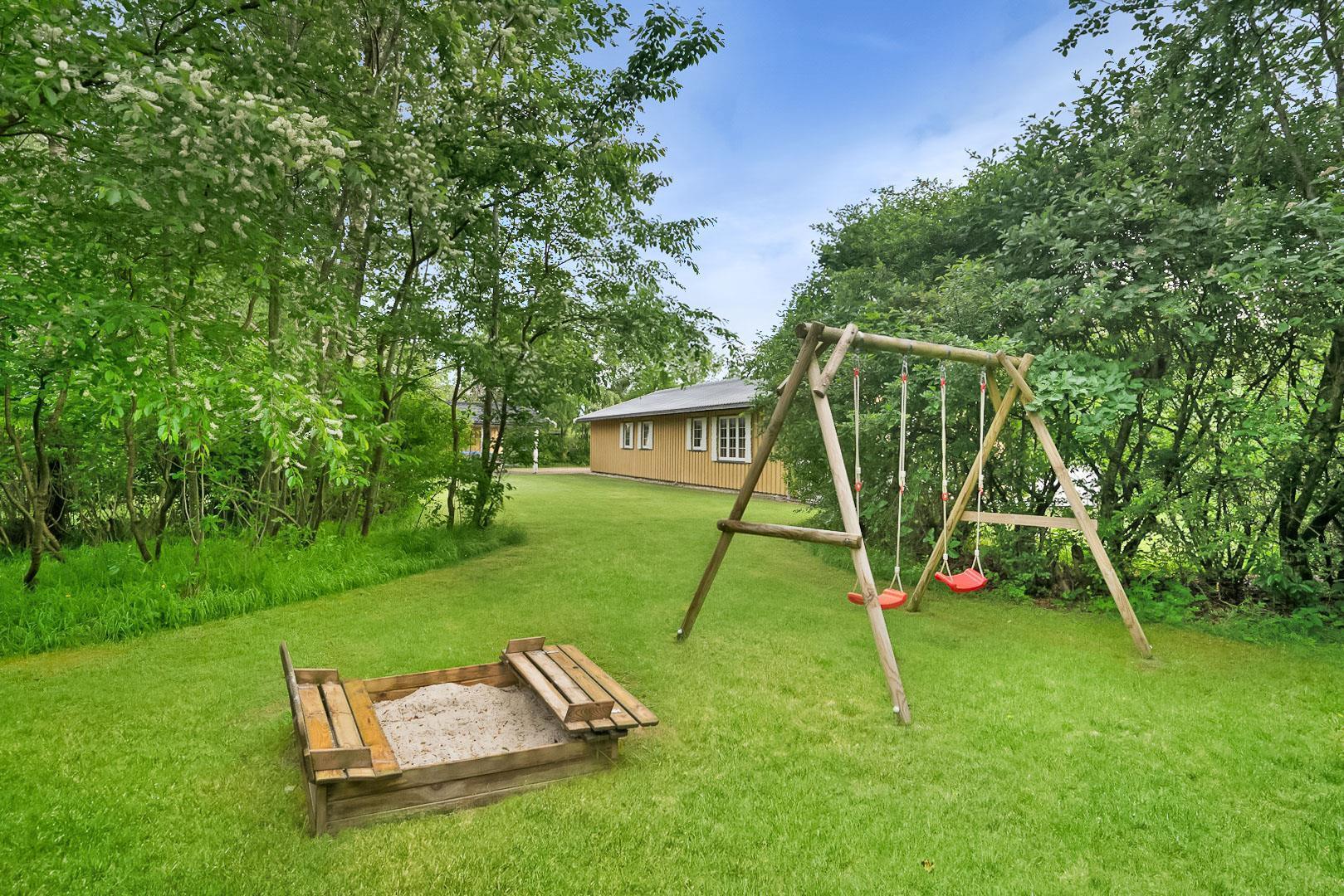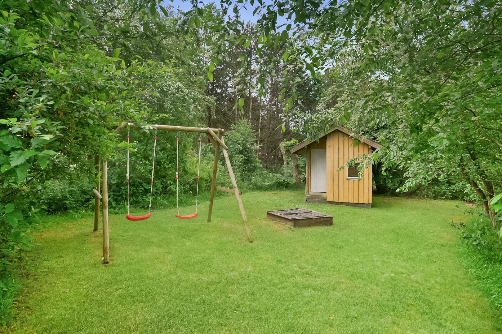 Hyggelig bjælkehytte beliggende på en lukket og ugenert naturgrund. Huset har synlige loftbjælker og er med sin specielle byggestil noget ganske særligt. Køkkenet er lukket af fra den store og rummelige stue med brændeovn, der er desuden direkte udgang til en sydvendt terrasse. For de yngre familiemedlemmer findes der bl.a. legehus og gynge i haven. Ferielandets aktivitetscenter ligger i gåafstand fra huset, hvor I ligeledes finder et lille supermarked, hvor der kan købes det mest nødvendige, en restaurant og fælles grill-område.