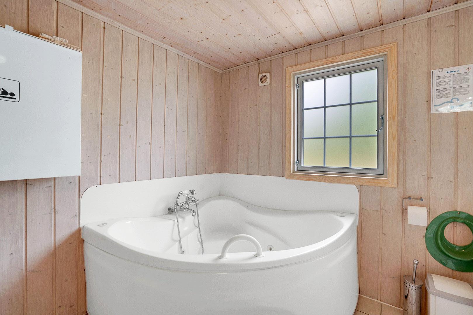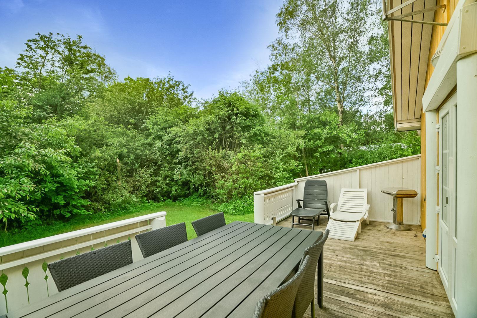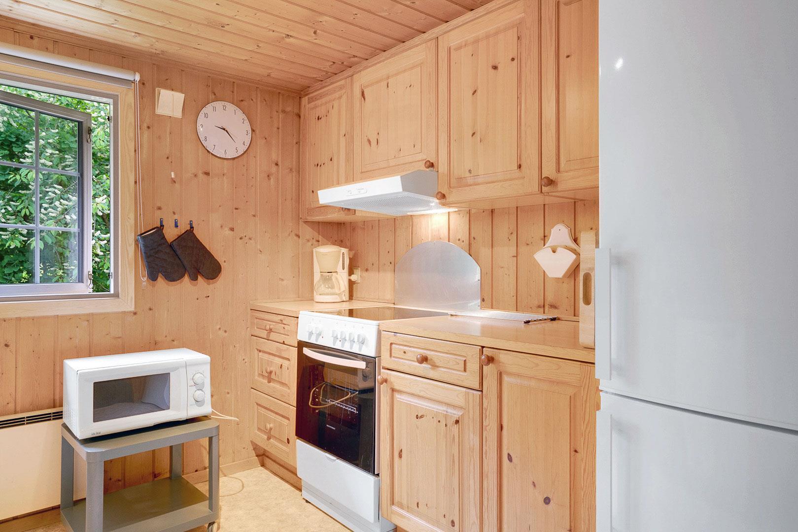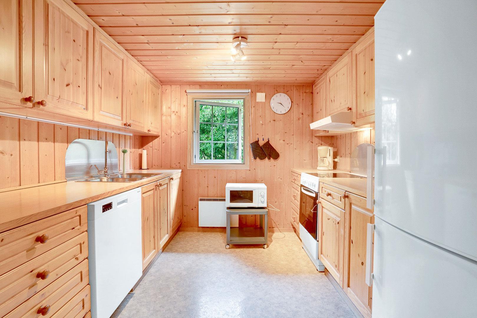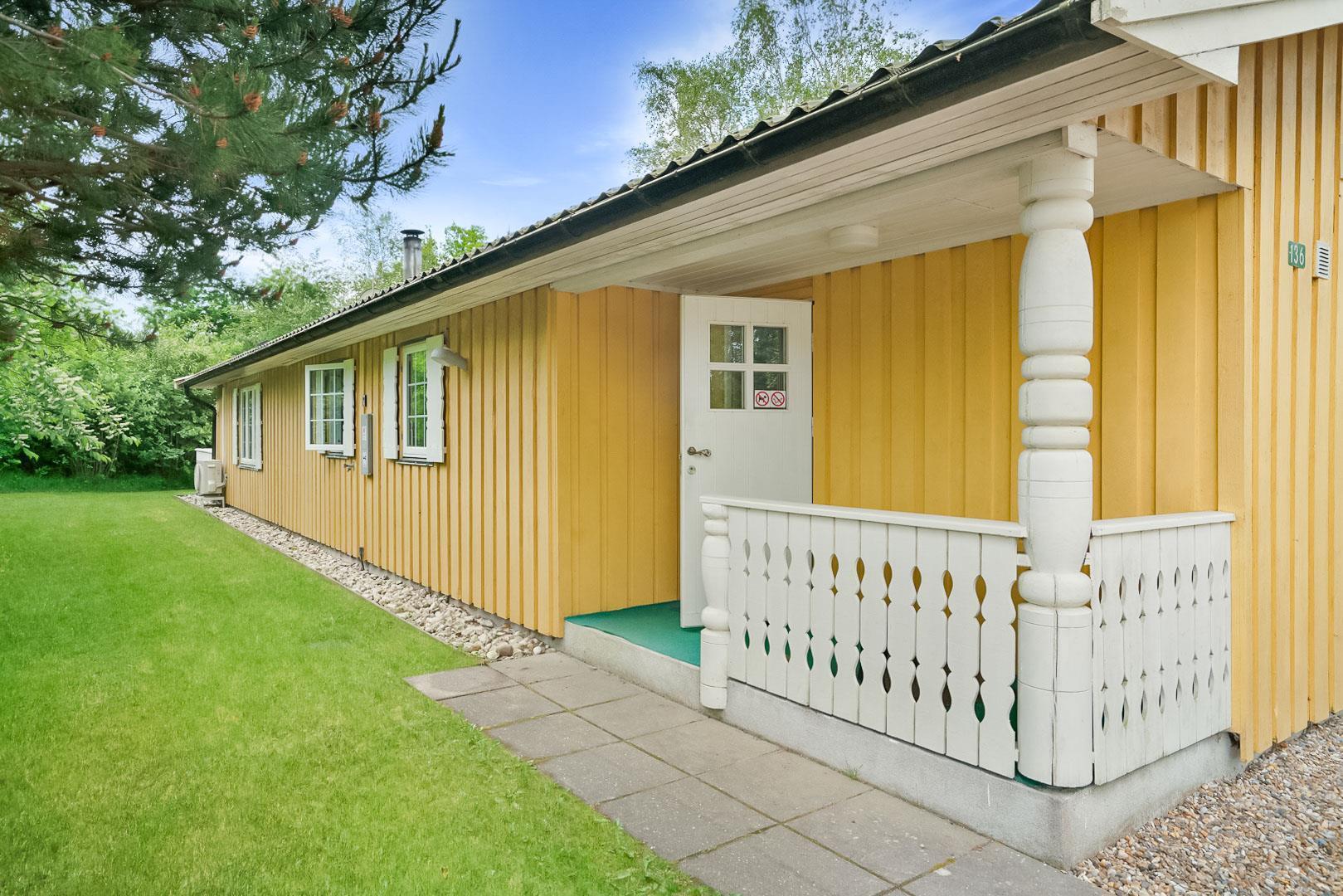 Hyggelig bjælkehytte beliggende på en lukket og ugenert naturgrund. Huset har synlige loftbjælker og er med sin specielle byggestil noget ganske særligt. Køkkenet er lukket af fra den store og rummelige stue med brændeovn, der er desuden direkte udgang til en sydvendt terrasse. For de yngre familiemedlemmer findes der bl.a. legehus og gynge i haven. Ferielandets aktivitetscenter ligger i gåafstand fra huset, hvor I ligeledes finder et lille supermarked, hvor der kan købes det mest nødvendige, en restaurant og fælles grill-område.