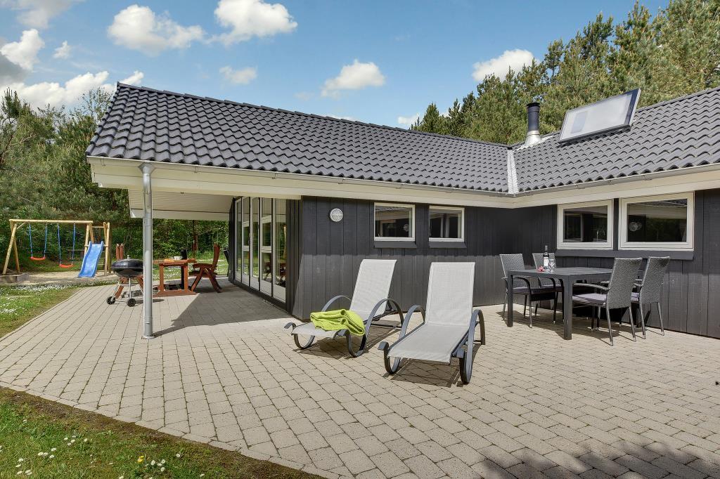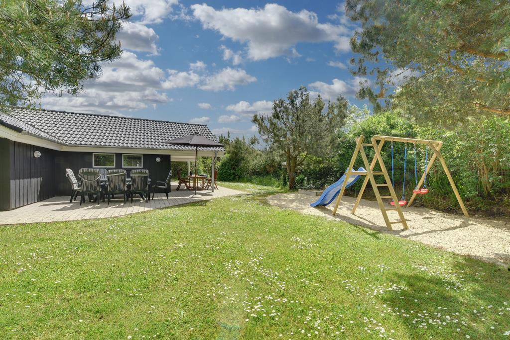 Udendørs er der stor overdækket med terassevarmer samt åben terrasse og dejlig græsplæne der indbyder til leg og boldspil. Børnevenligt hus med barneseng, høj stol, gynger og sandkasse. Carport til rådighed. Huset har en central beliggenhed tæt på centerområdet med cafeteria og legeplads samt minigolf. Her vil I føle jer velkommen på alle tider af året.