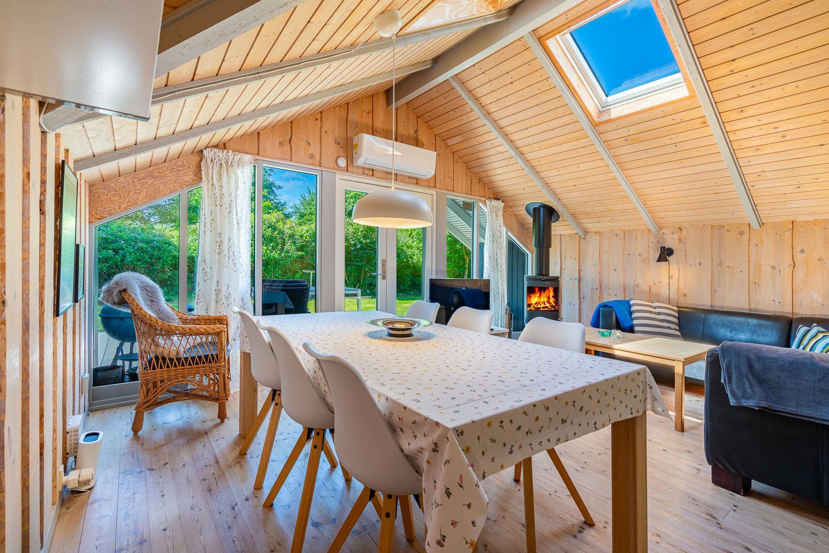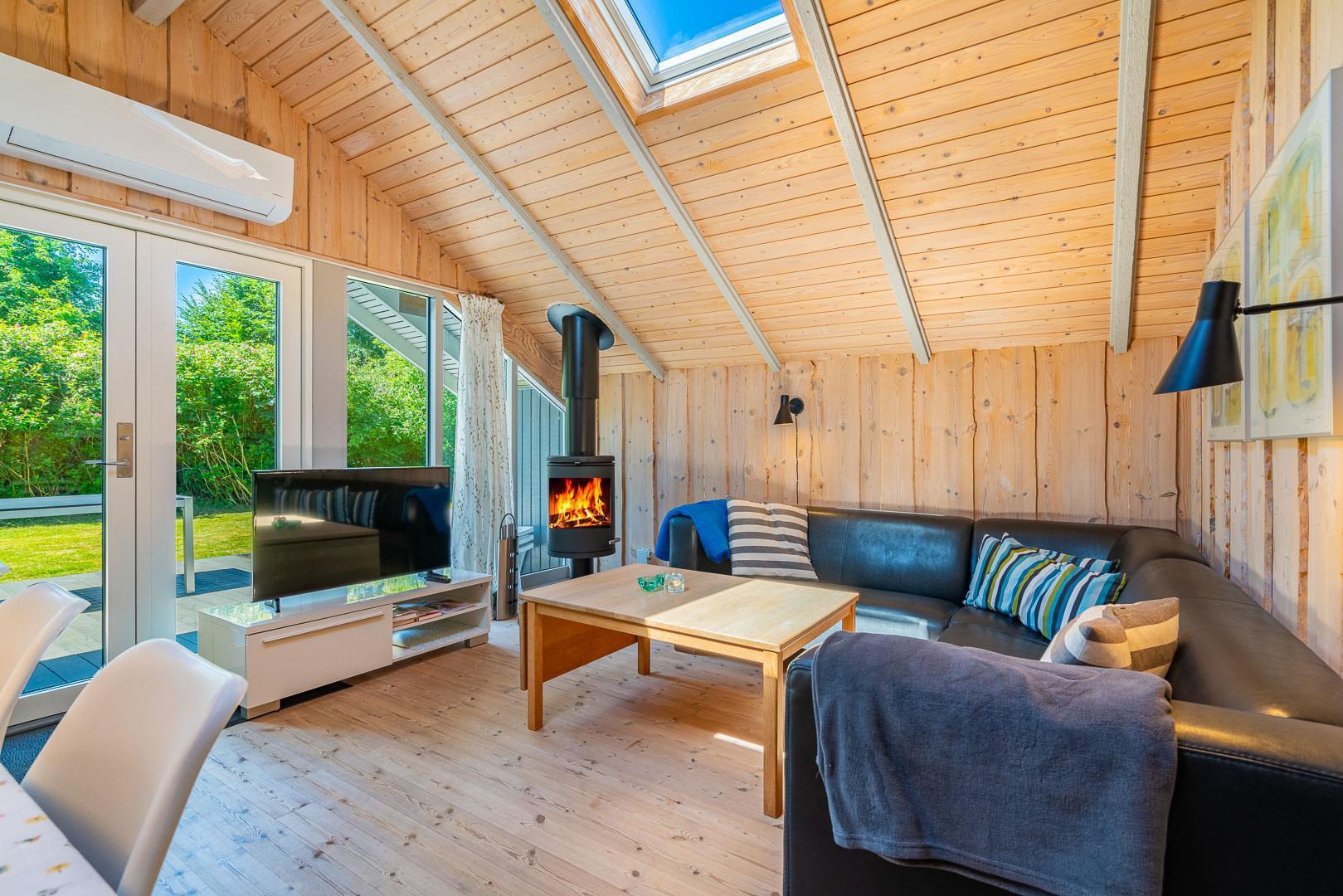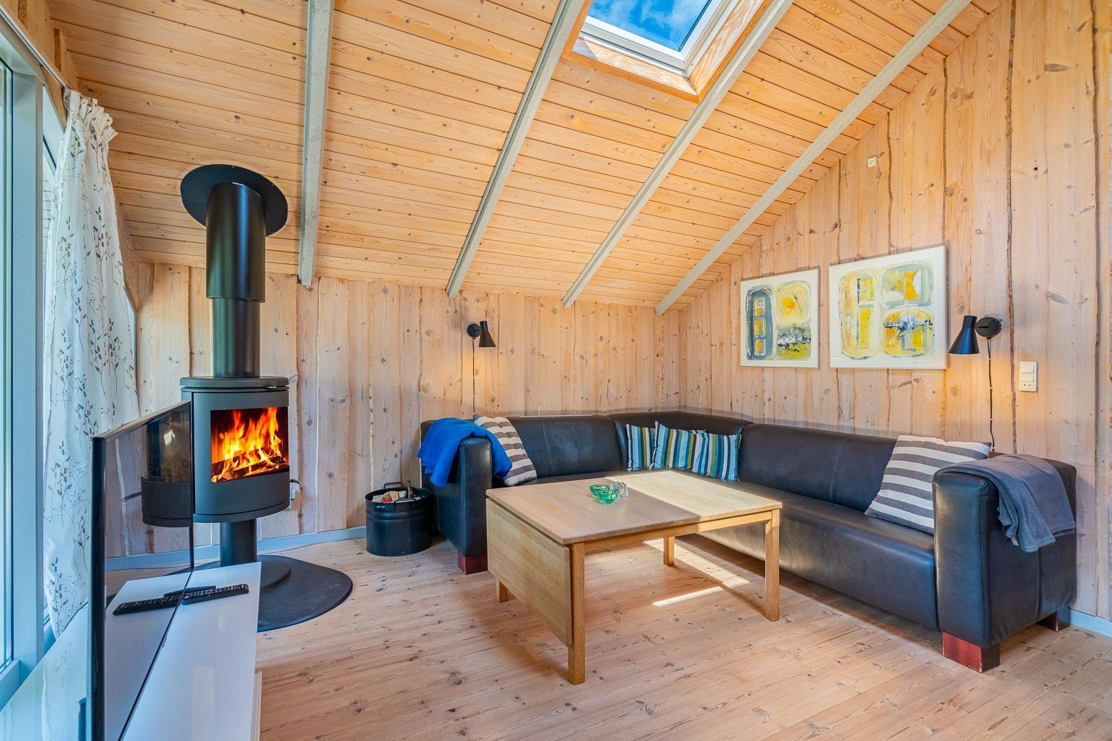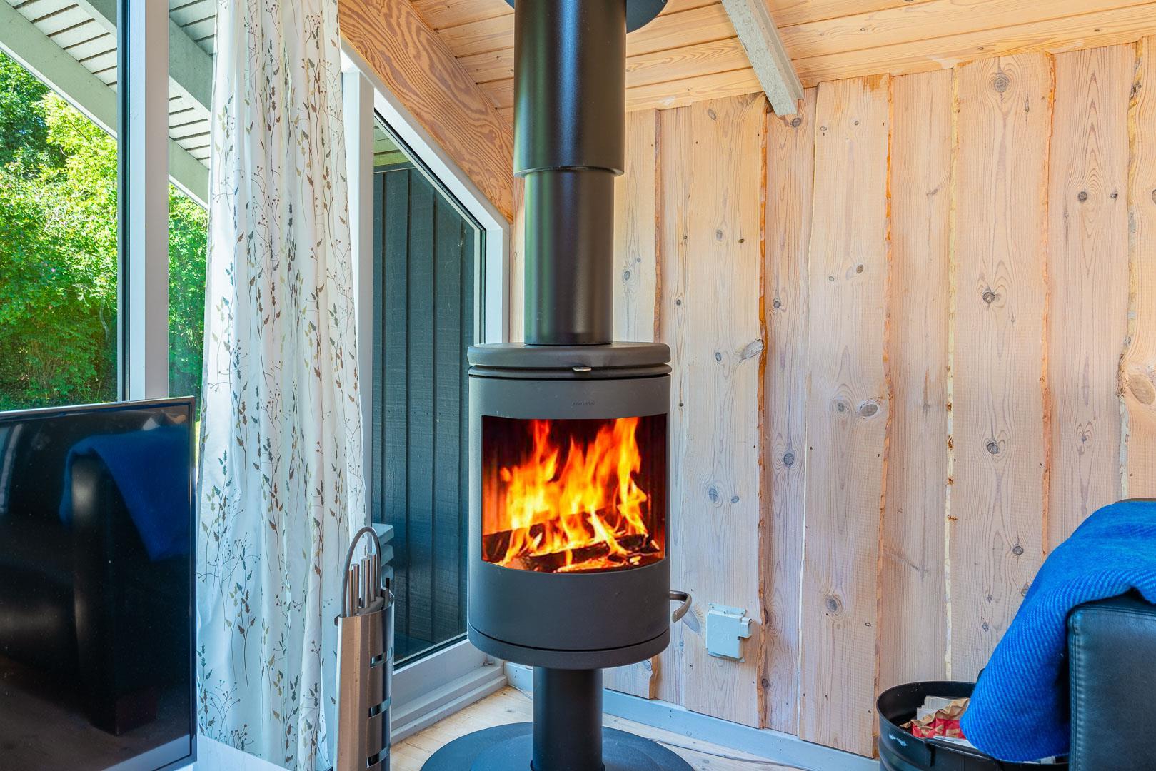 Brændeovnen sørger for ekstra hygge på kølige dage, mens den energivenlige varmepumpe sikrer et komfortabelt indeklima året rundt. Køkkenet er udstyret med opvaskemaskine og alt det nødvendige, så hverdagen i ferien bliver nem og ukompliceret.