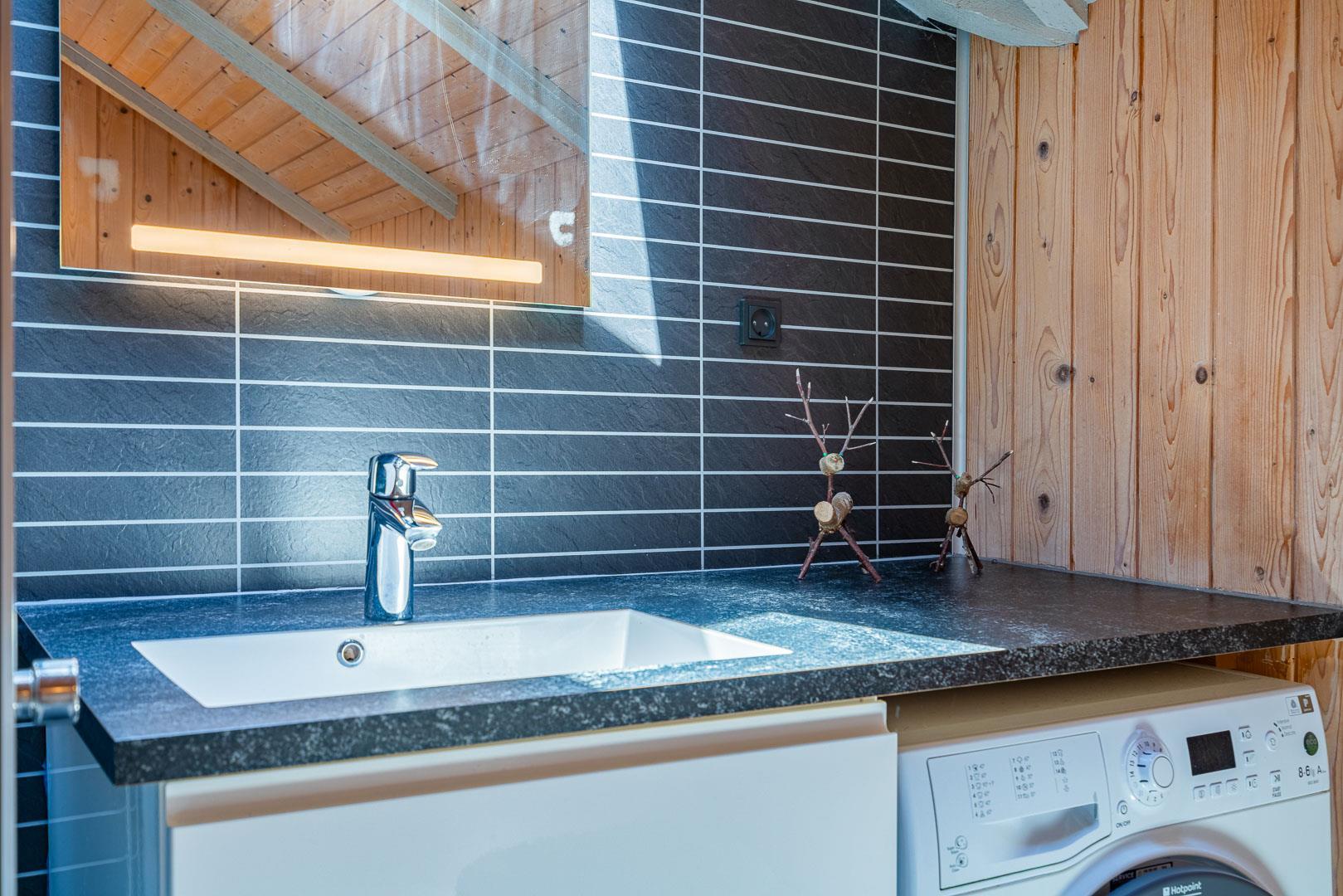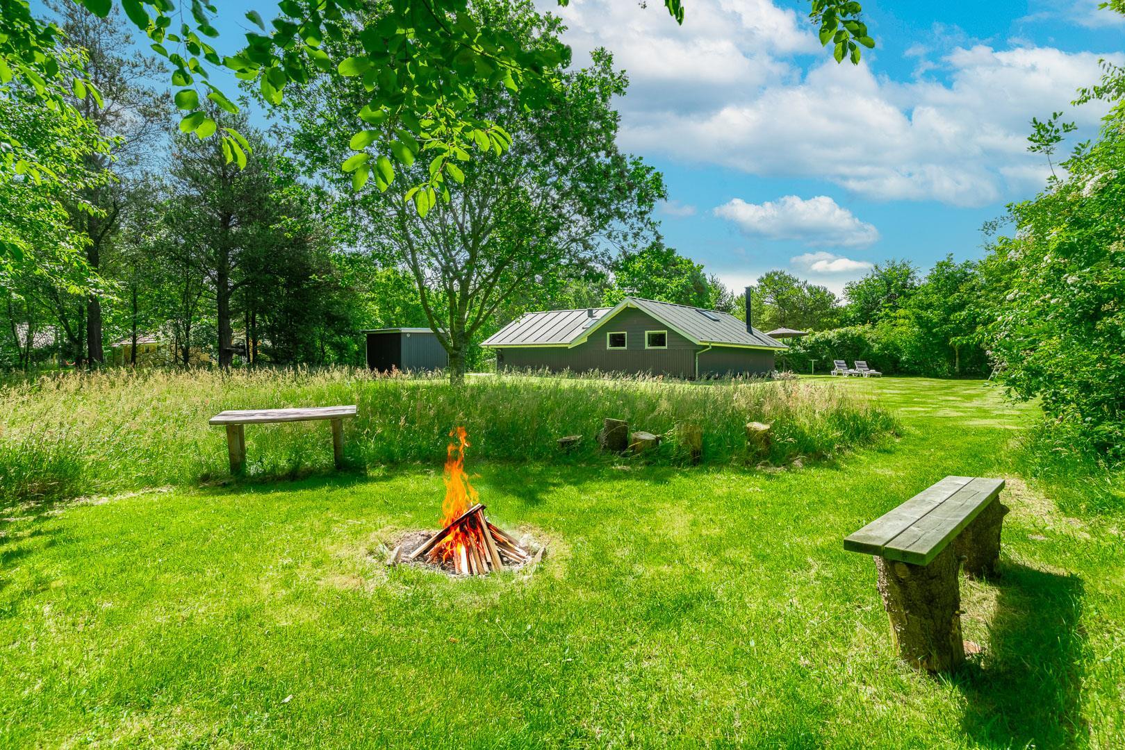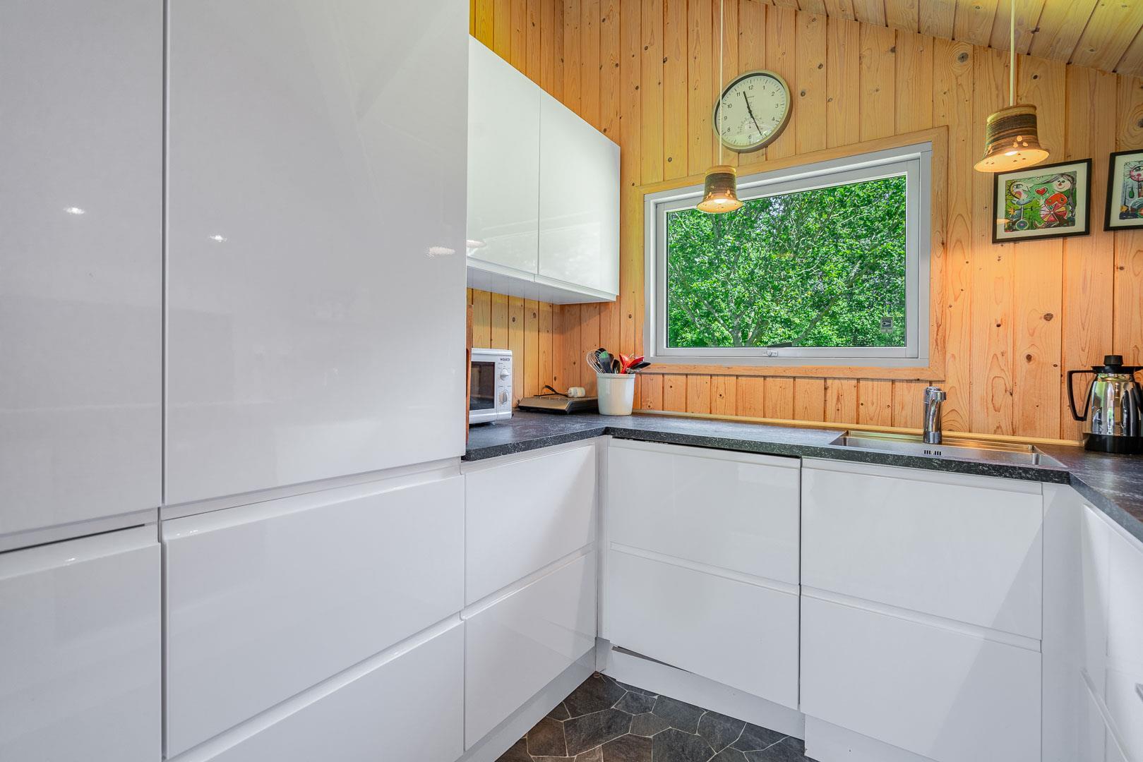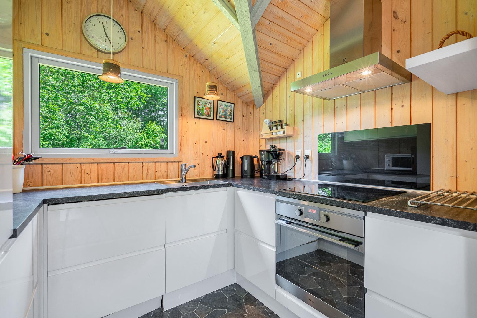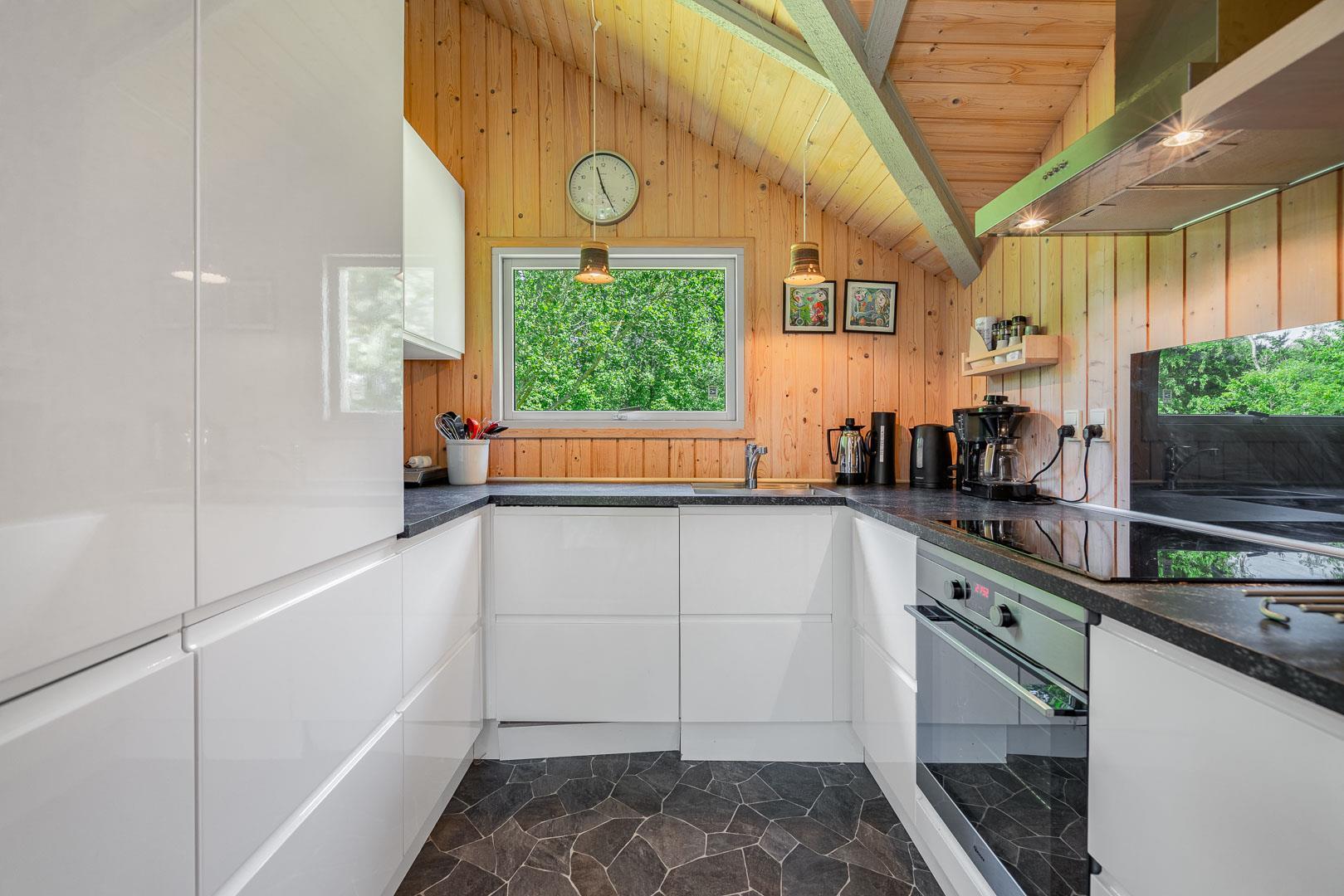 Brændeovnen sørger for ekstra hygge på kølige dage, mens den energivenlige varmepumpe sikrer et komfortabelt indeklima året rundt. Køkkenet er udstyret med opvaskemaskine og alt det nødvendige, så hverdagen i ferien bliver nem og ukompliceret.
