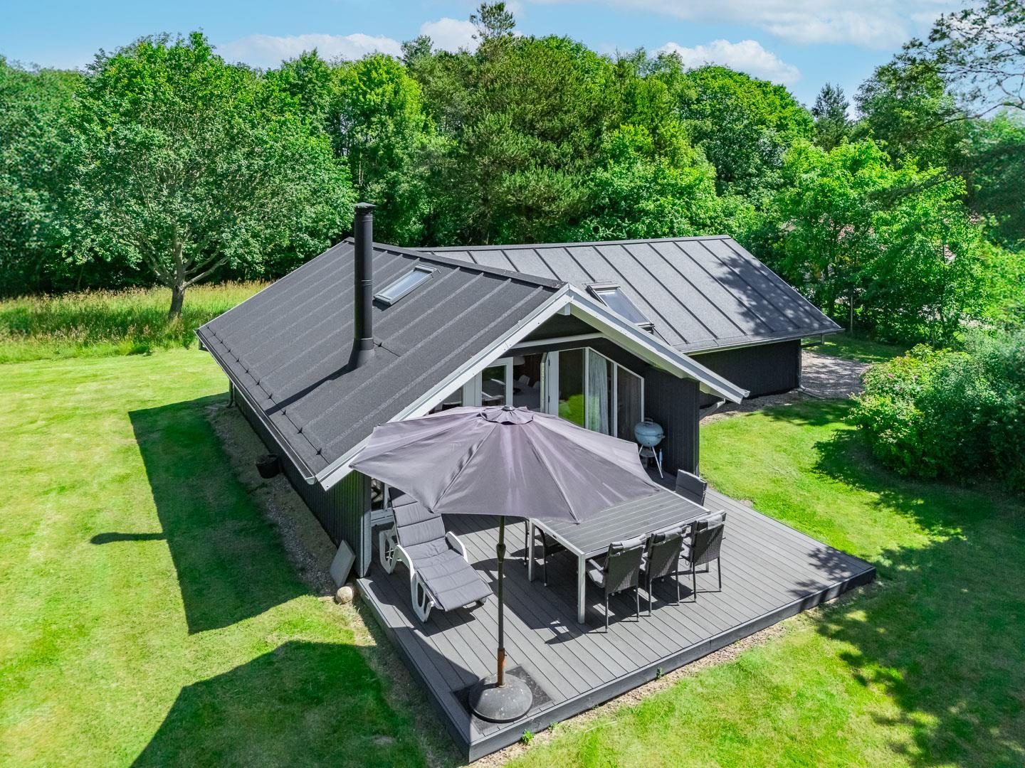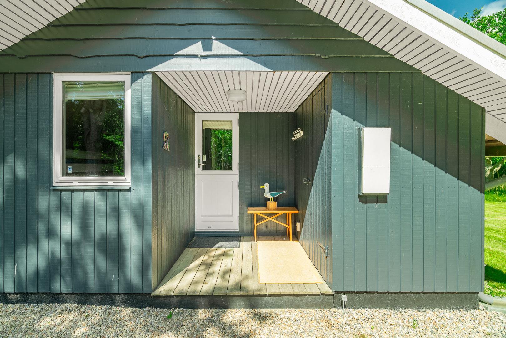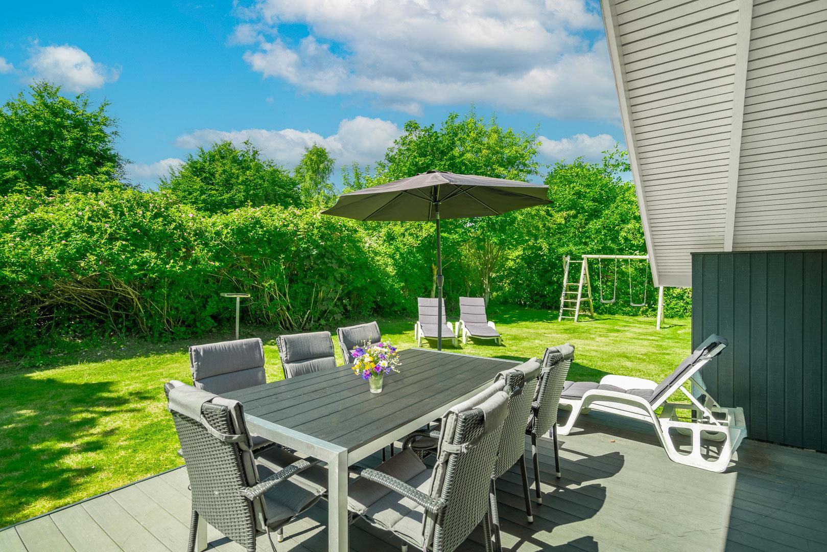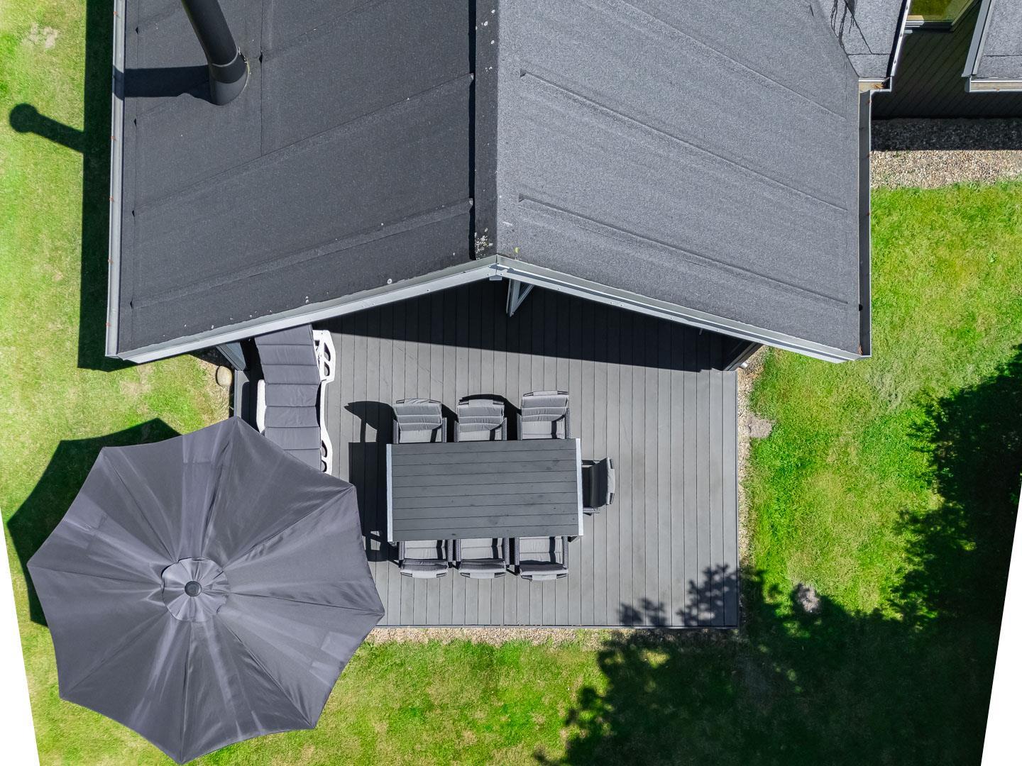 Udendørs venter en dejlig, overdækket terrasse, som kan bruges i al slags vejr. Her kan I starte dagen med morgenmad i den friske luft eller nyde lange sommeraftener – uanset om solen skinner, eller der falder en let regn.