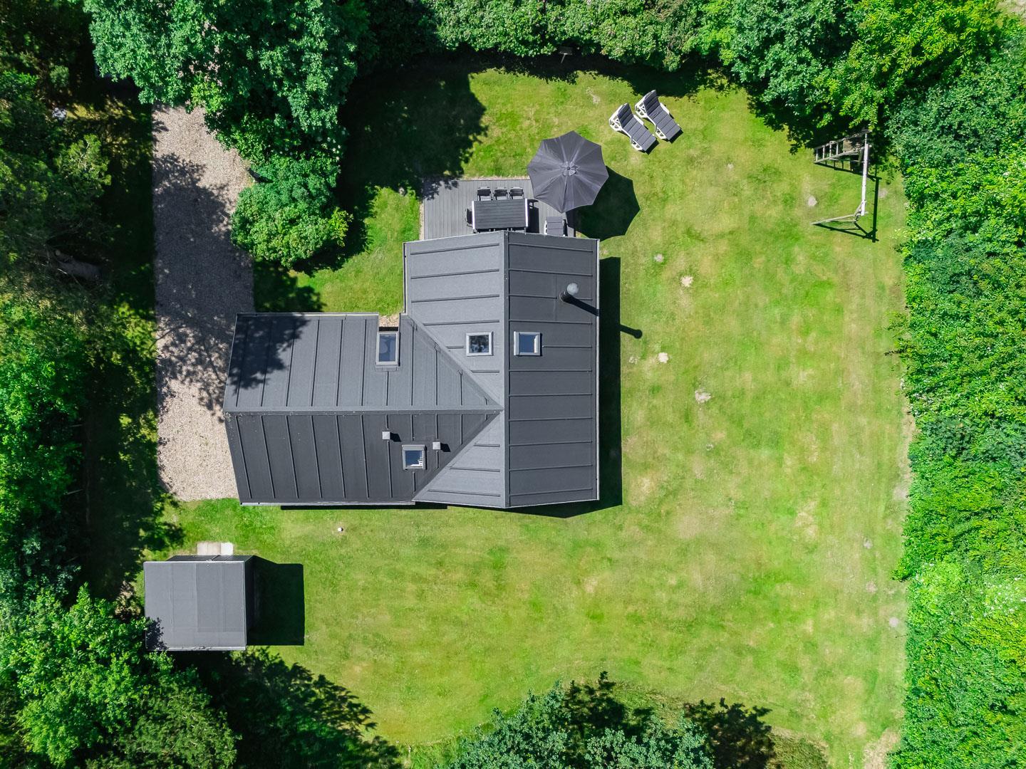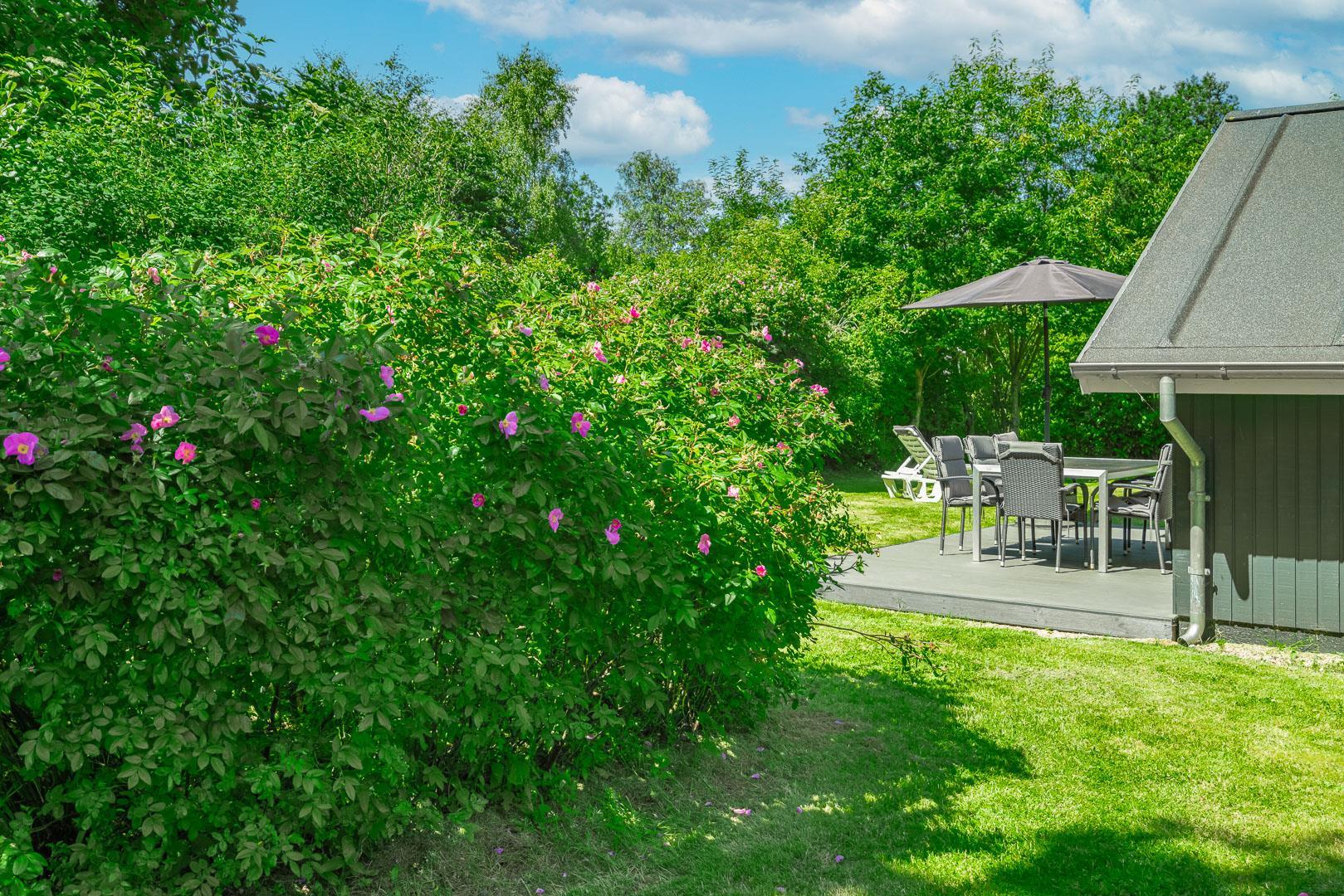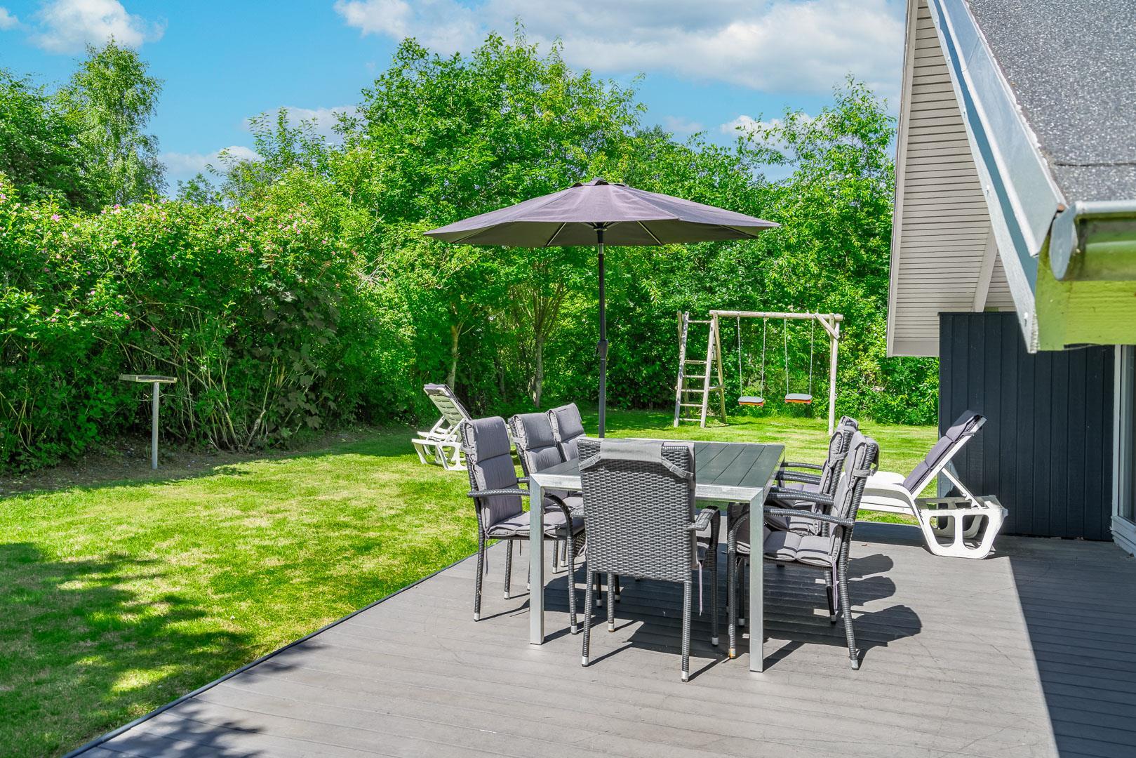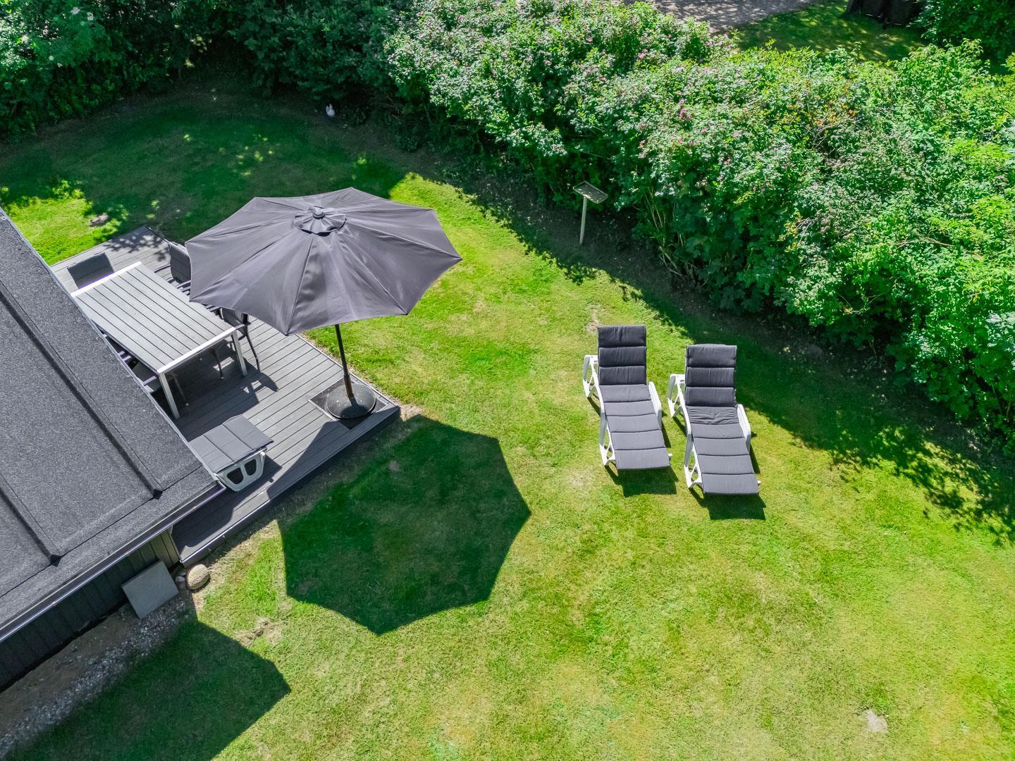 Udendørs venter en dejlig, overdækket terrasse, som kan bruges i al slags vejr. Her kan I starte dagen med morgenmad i den friske luft eller nyde lange sommeraftener – uanset om solen skinner, eller der falder en let regn.
