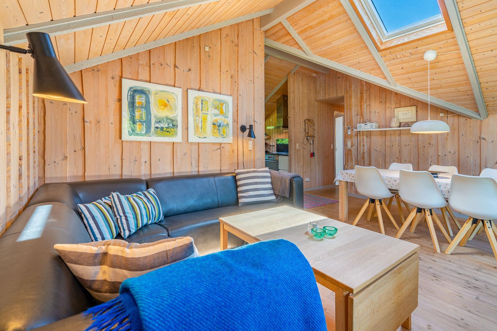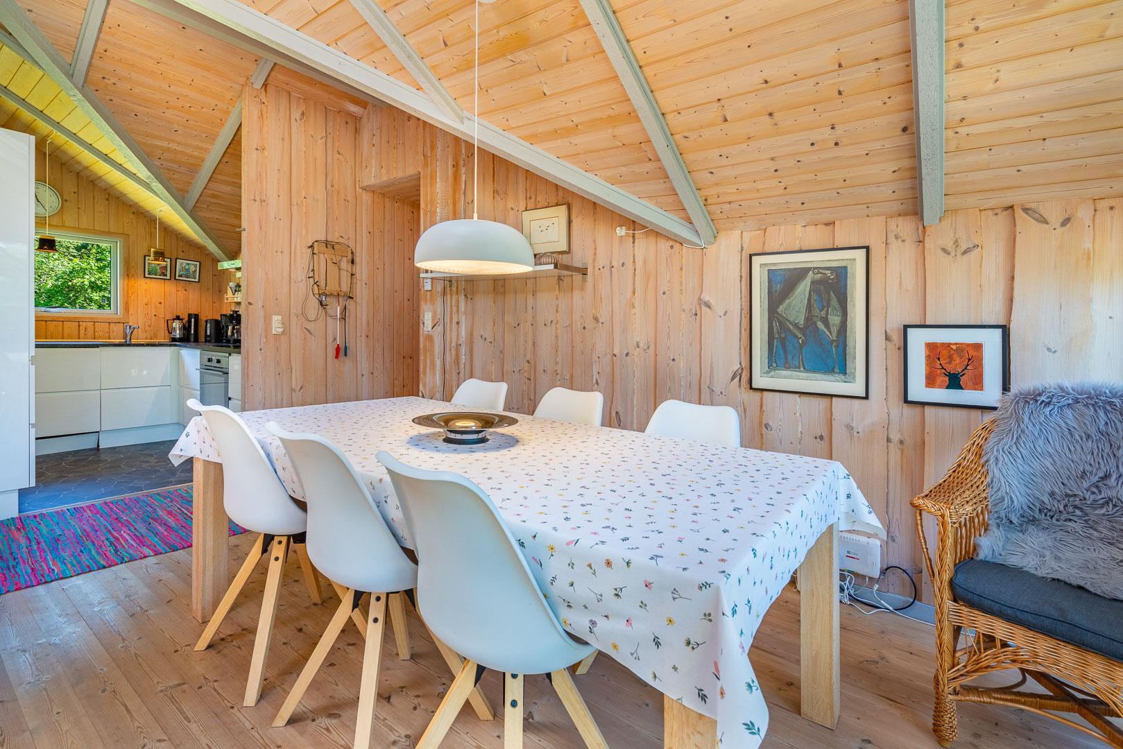 Sommerhuset er indrettet i en lys og indbydende stil med en praktisk planløsning, der skaber en behagelig atmosfære. Det åbne opholdsrum samler køkken, spiseplads og stue i ét, så I nemt kan være sammen – uanset om der laves mad, spilles spil eller slappes af i sofaen.