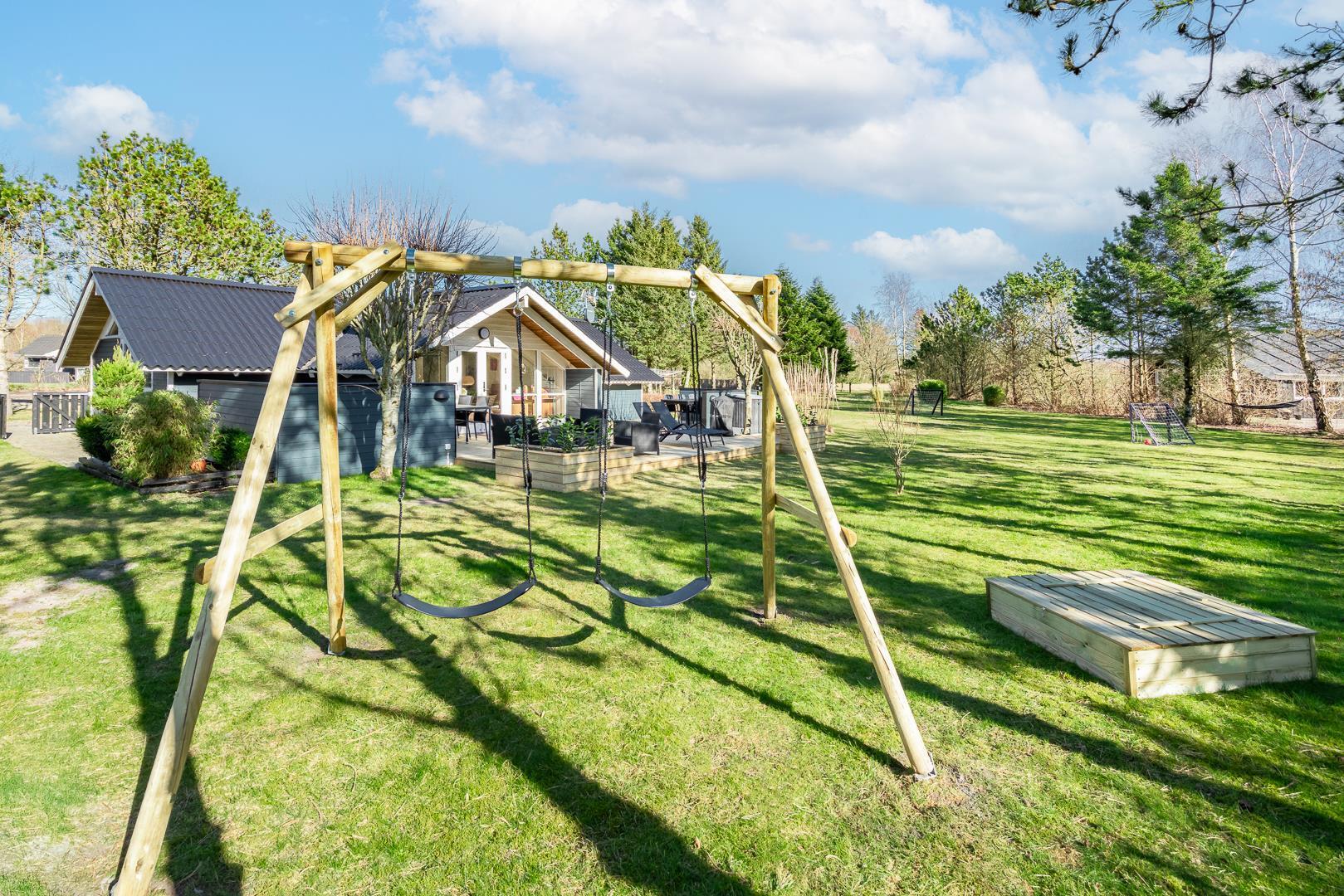 Udendørs finder du en stor, indhegnet have med nye terrasser, havemøbler, gynger, sandkasse og fodboldmål, perfekt for både børn og hund. Nærheden til indkøb gør det praktisk for feriegæster.