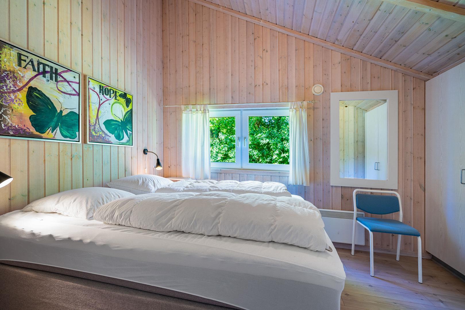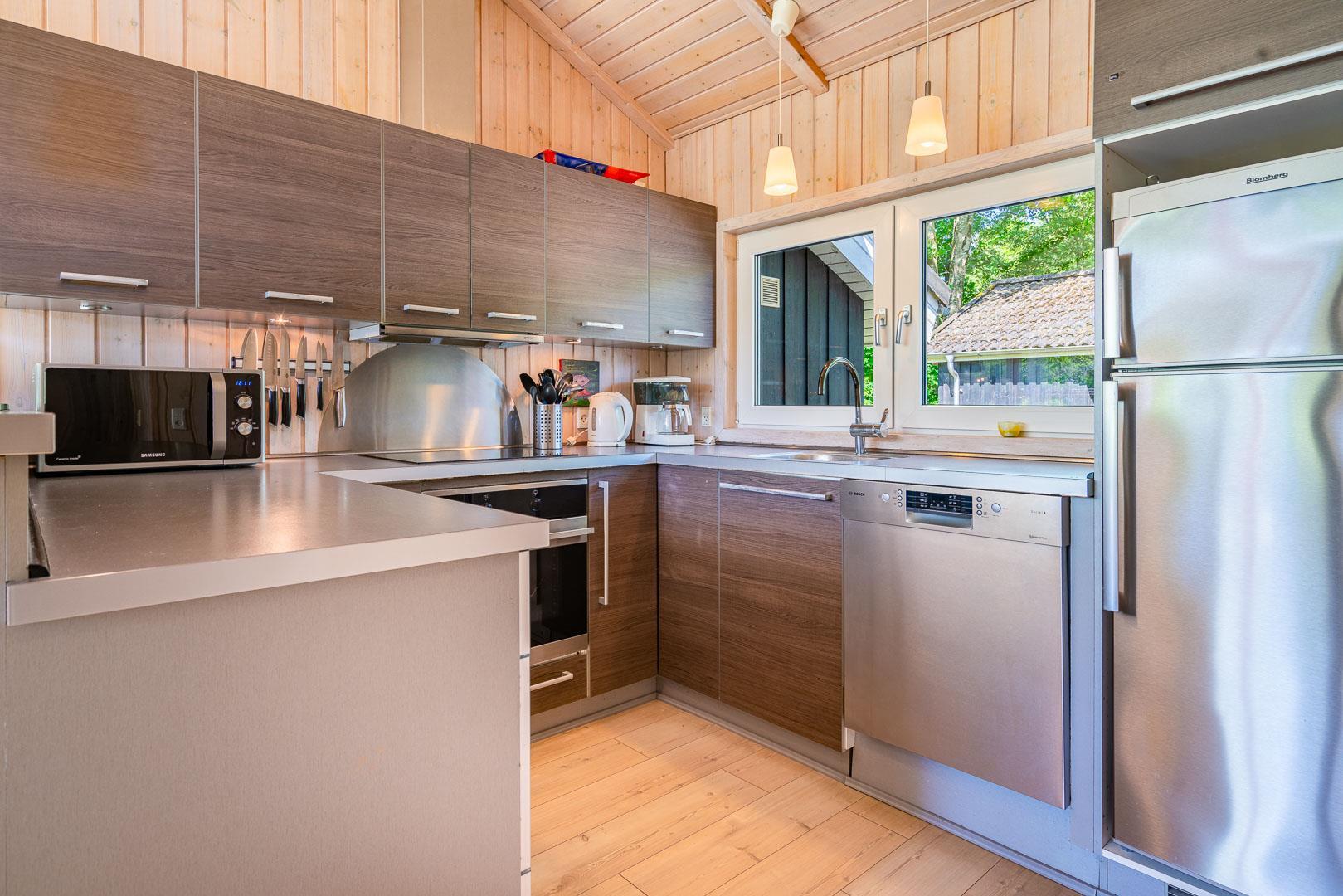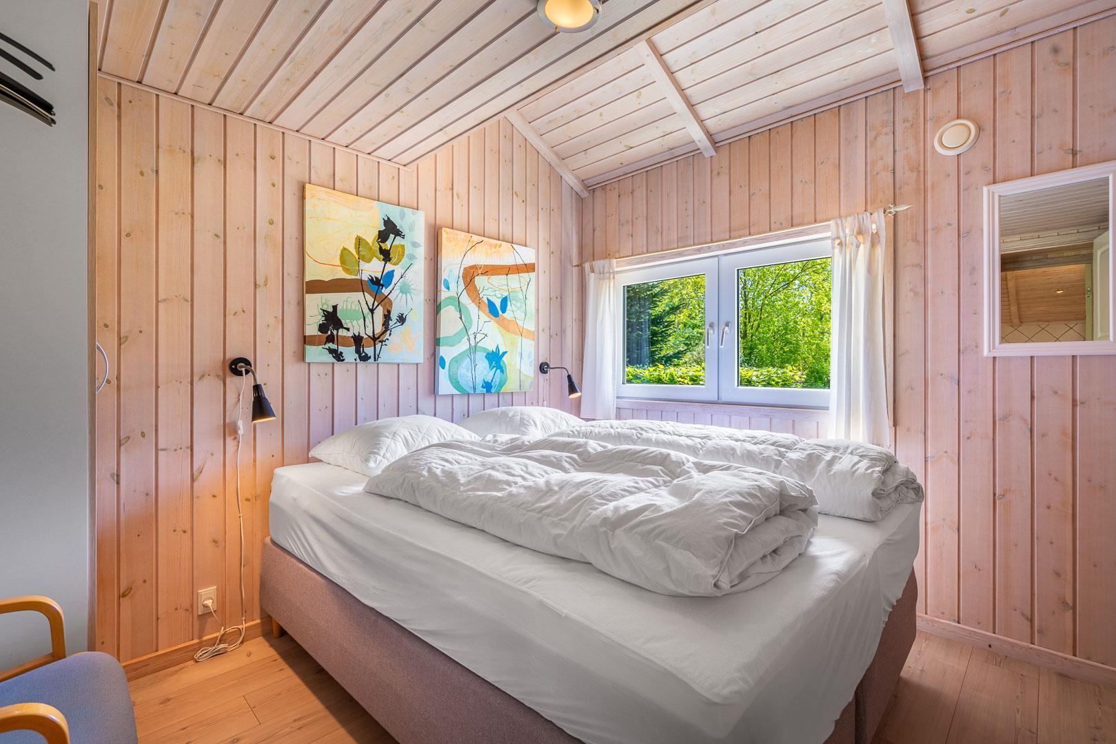 Det moderne køkken er veludstyret med blandt andet opvaskemaskine, ovn og god plads til fælles madlavning. Sommerhuset råder over fire soveværelser og kan rumme op til 8 personer. Derudover findes et ekstra gæstetoilet samt et stort badeværelse med sauna, badekar og gulvvarme, som indbyder til ren wellness.