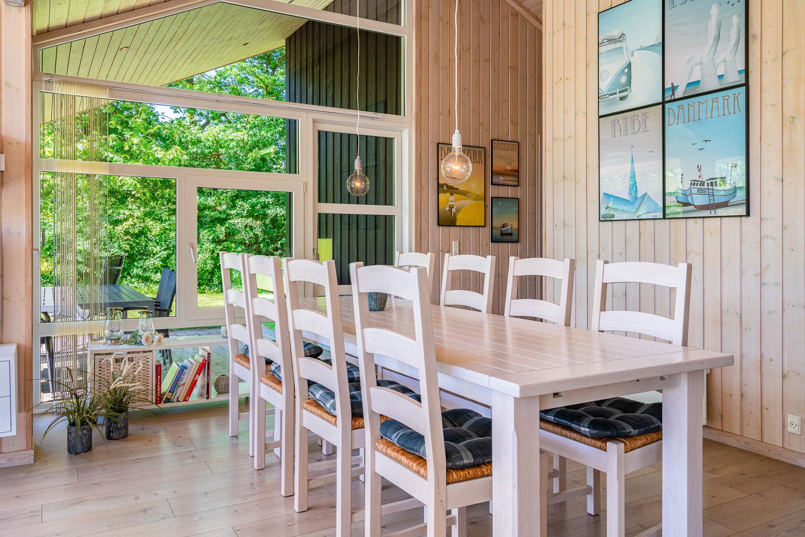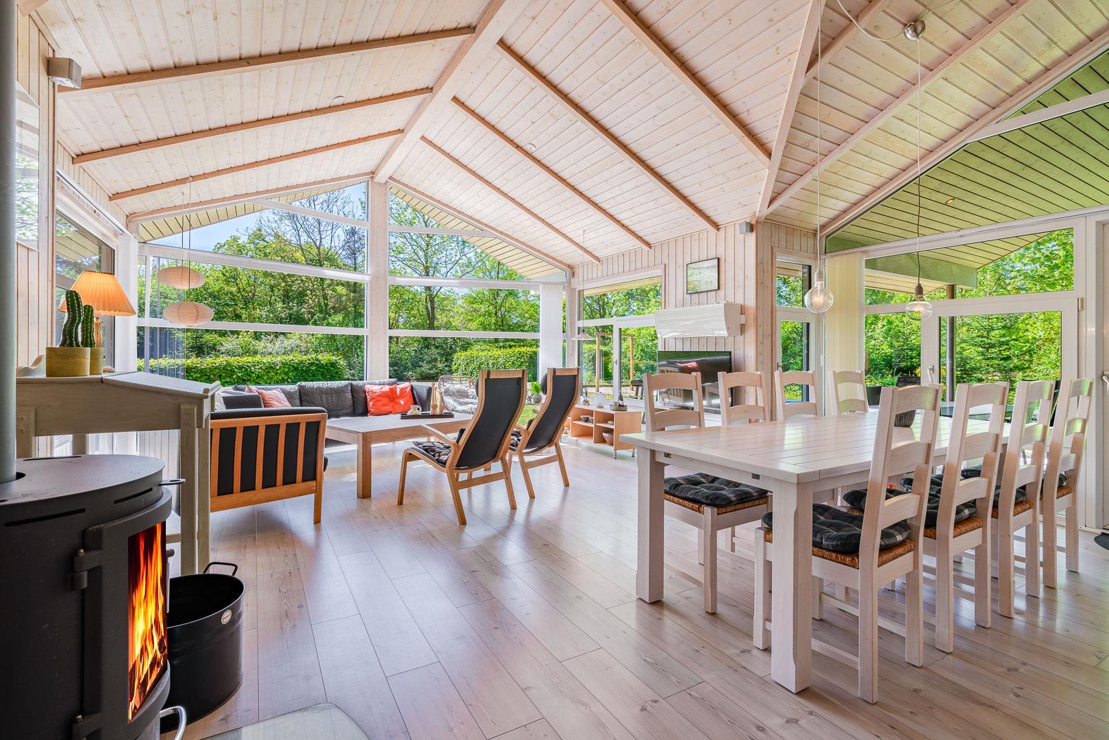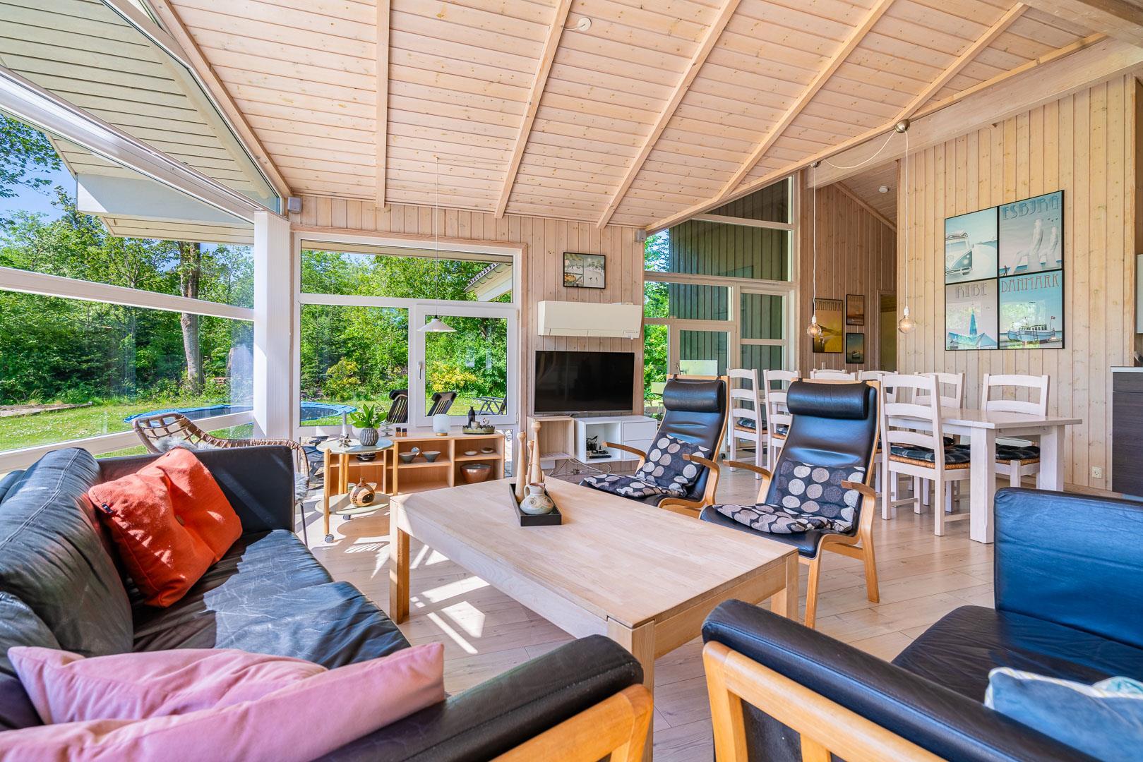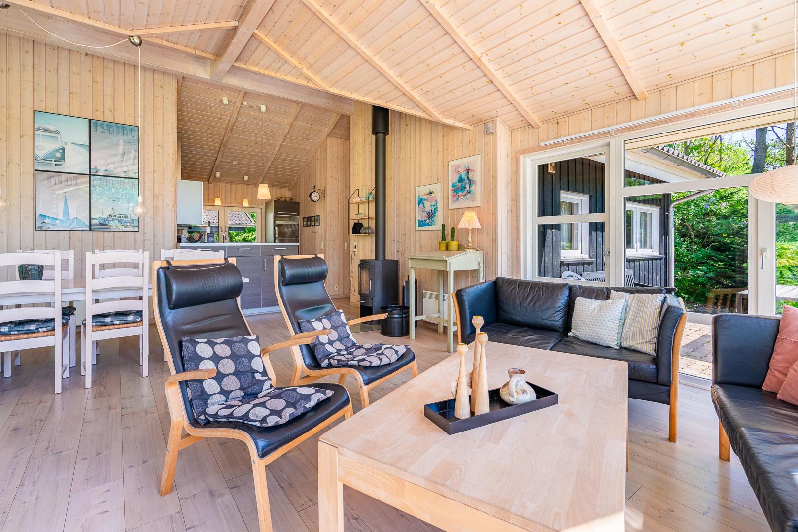 Den lyse stue danner rammen om afslappede feriestunder. Brændeovnen skaber varme og hygge efter en dag i den friske vestjyske luft, mens gulvvarme og varmepumpe sørger for behagelige temperaturer året rundt. De store vinduespartier giver et skønt lysindfald og udsigt til den grønne natur – ideelt til stille aftener med en bog eller et glas vin.