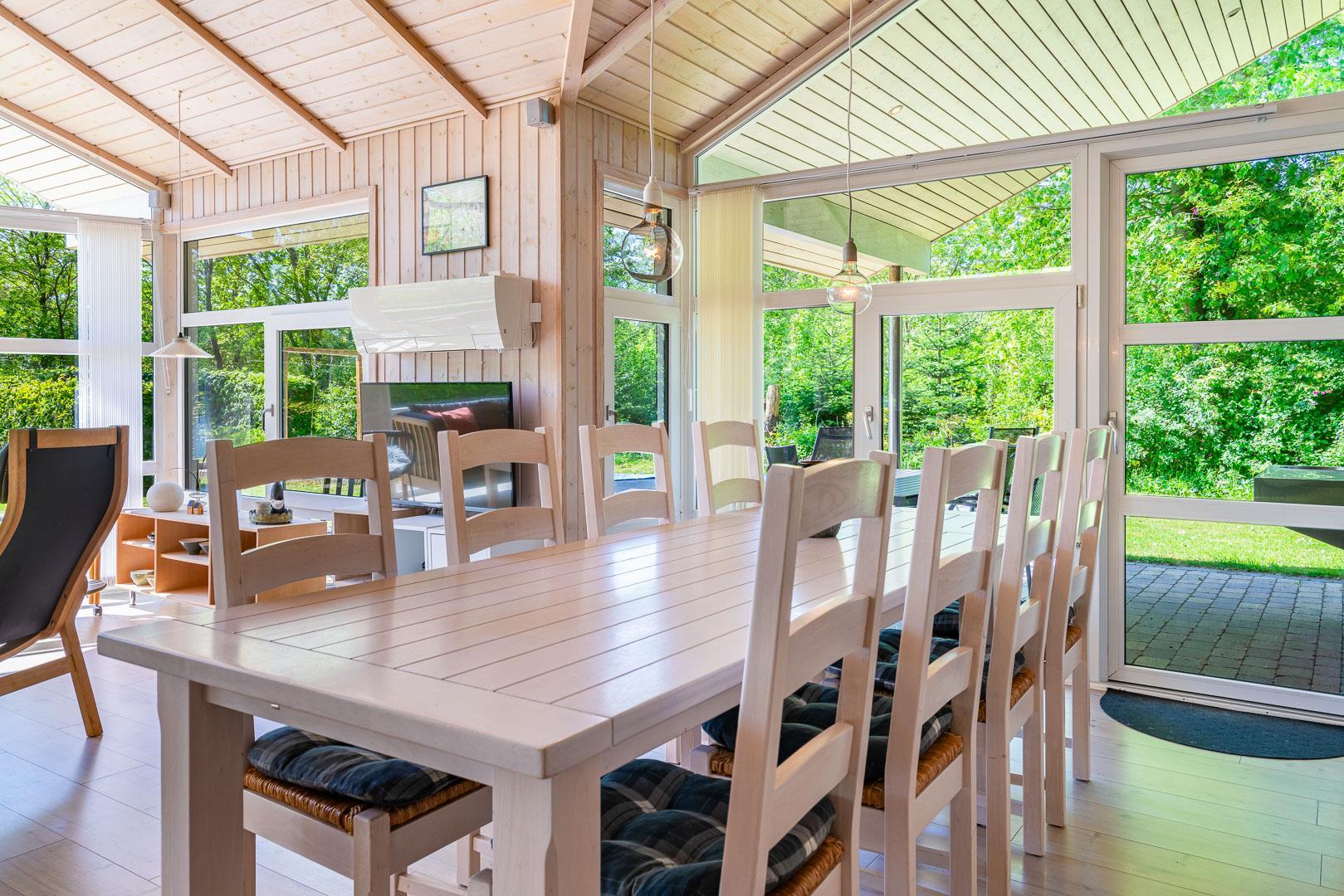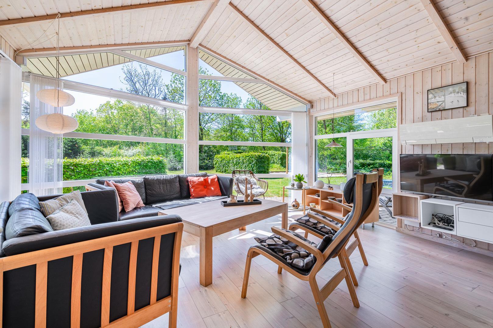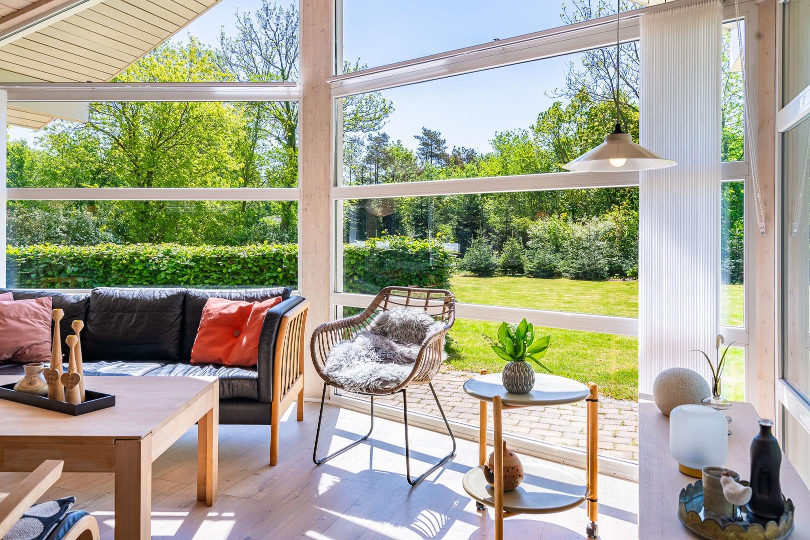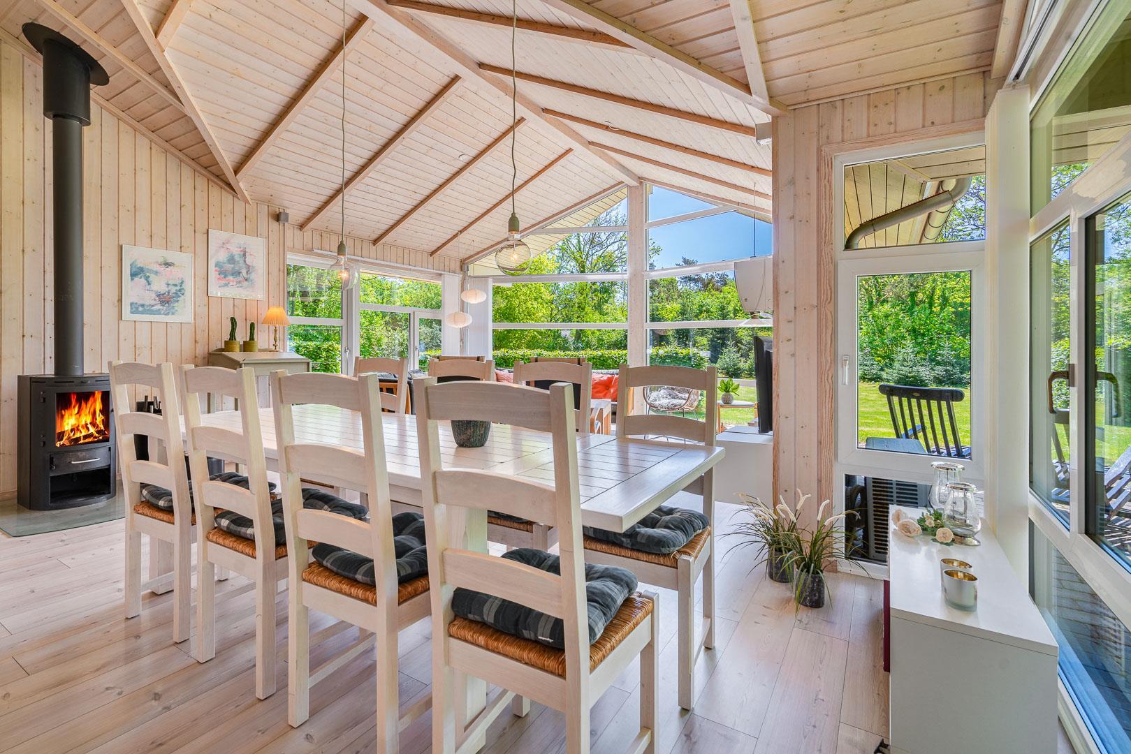Den lyse stue danner rammen om afslappede feriestunder. Brændeovnen skaber varme og hygge efter en dag i den friske vestjyske luft, mens gulvvarme og varmepumpe sørger for behagelige temperaturer året rundt. De store vinduespartier giver et skønt lysindfald og udsigt til den grønne natur – ideelt til stille aftener med en bog eller et glas vin.