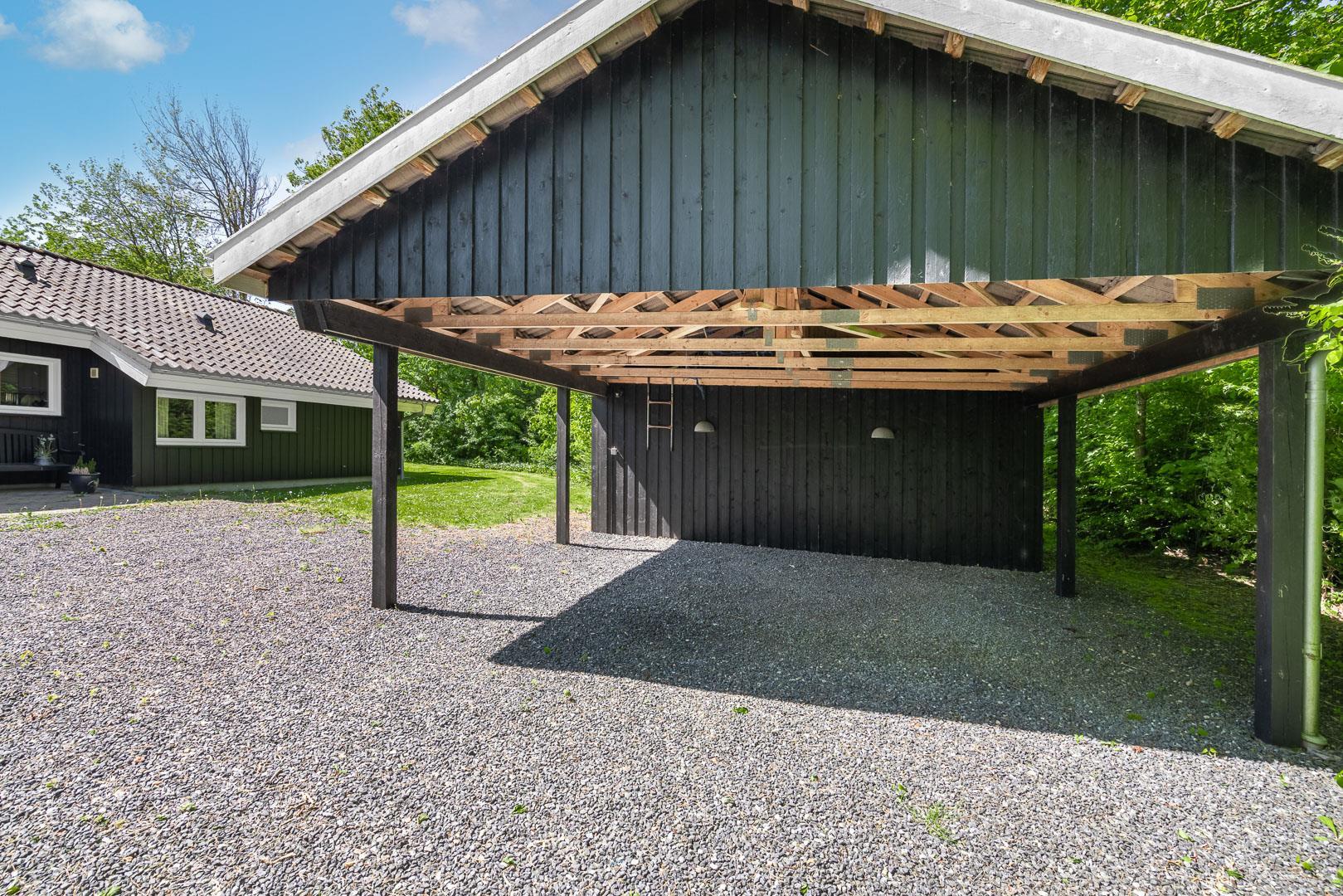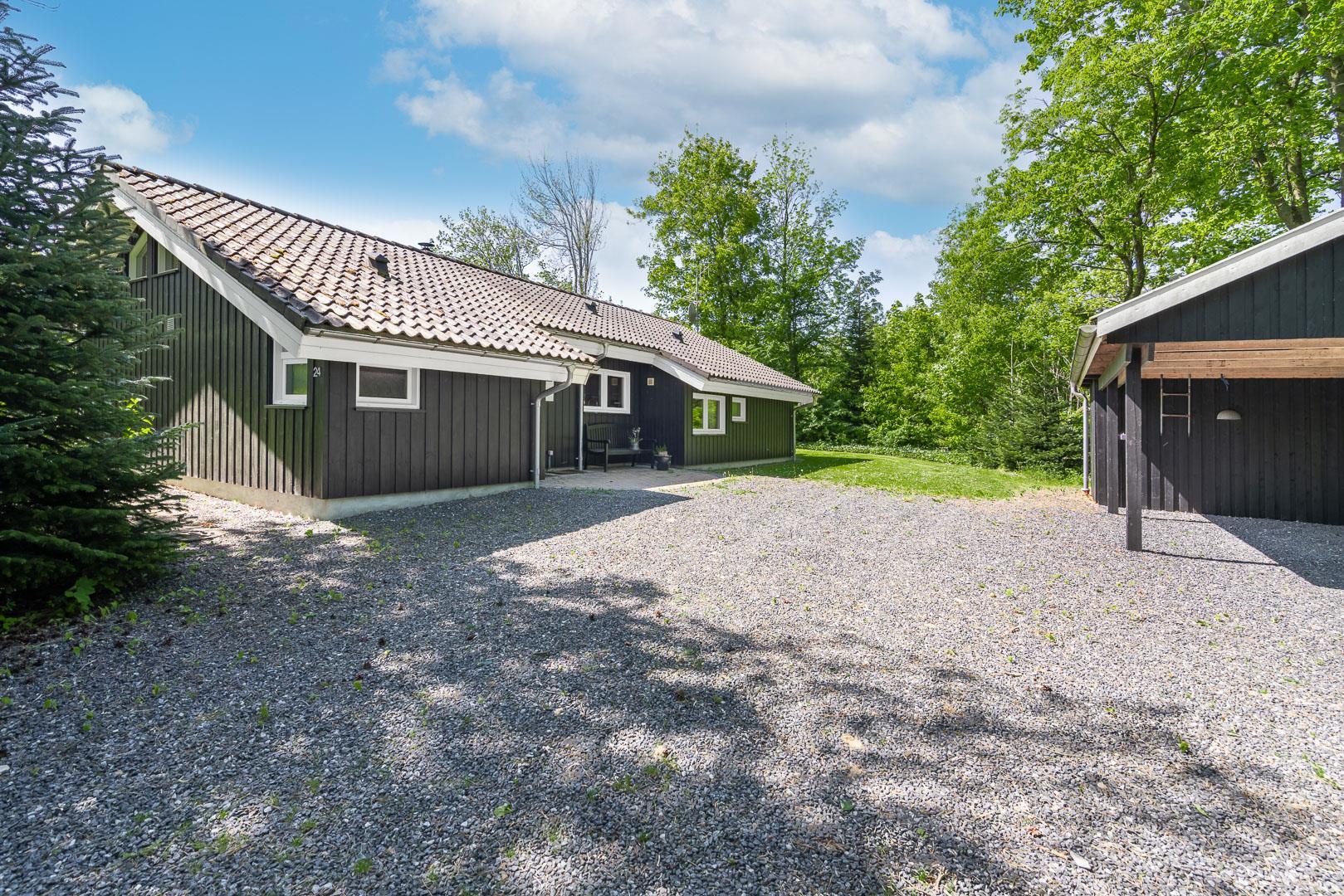 Sommerhuset ligger på en stille vej i populære Jegum Ferieland, kun 400 meter fra indkøb. Vesterhavet ligger ca. 10 km væk, og de brede sandstrande ved Henne Strand og Houstrup er oplagte udflugtsmål. Efter en dejlig stranddag kan bilen parkeres i carporten, og aftenen nydes på den overdækkede terrasse – måske med grill og en kold dansk øl.