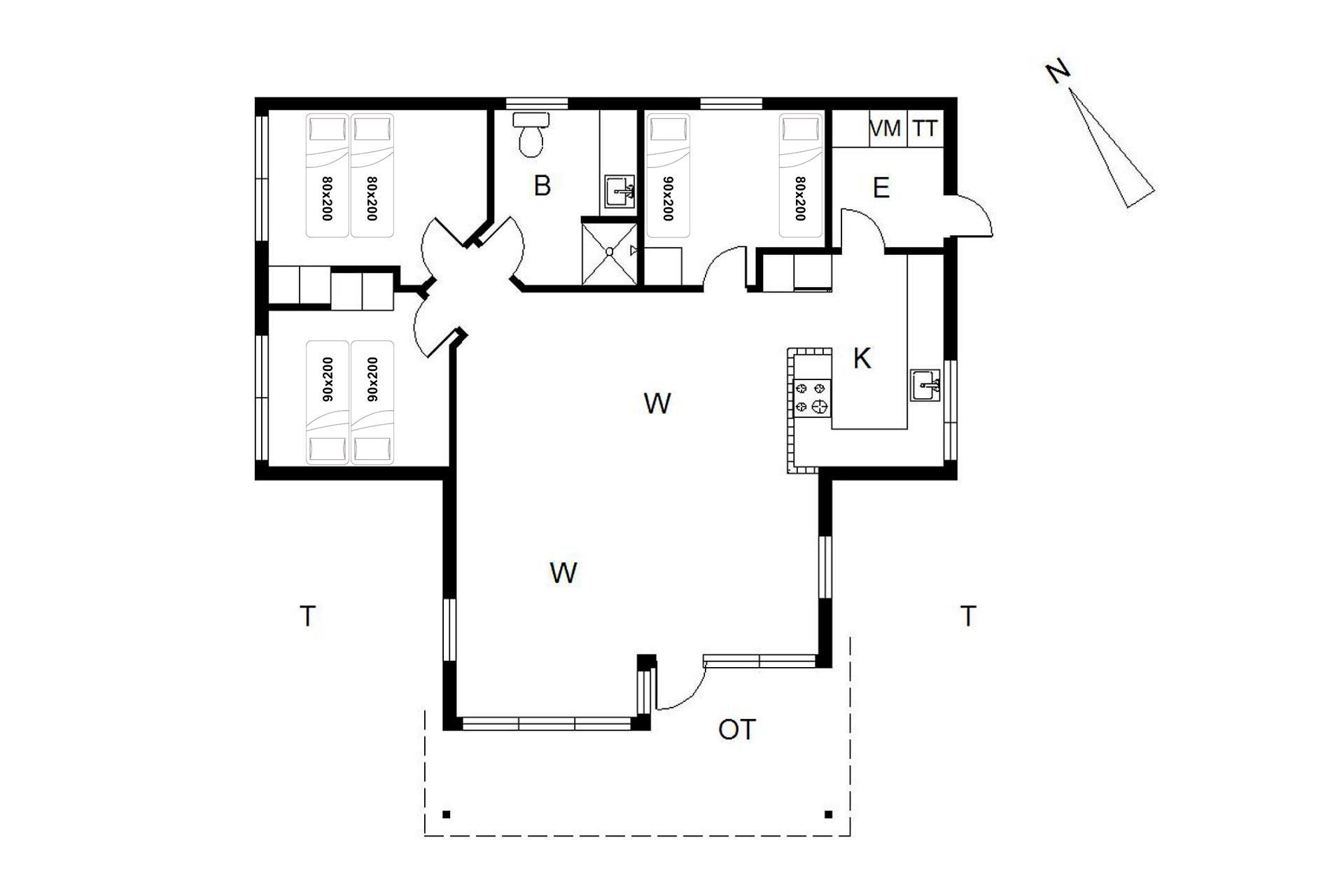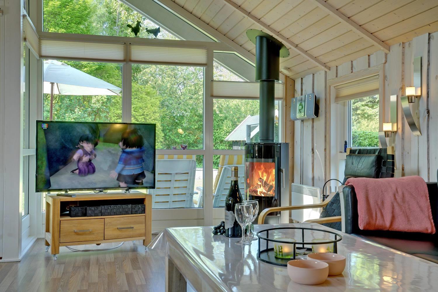 Hyggeligt feriehus i Jegum Ferieland med aktivitetsrum, brændeovn og stor terrasse med bålsted.