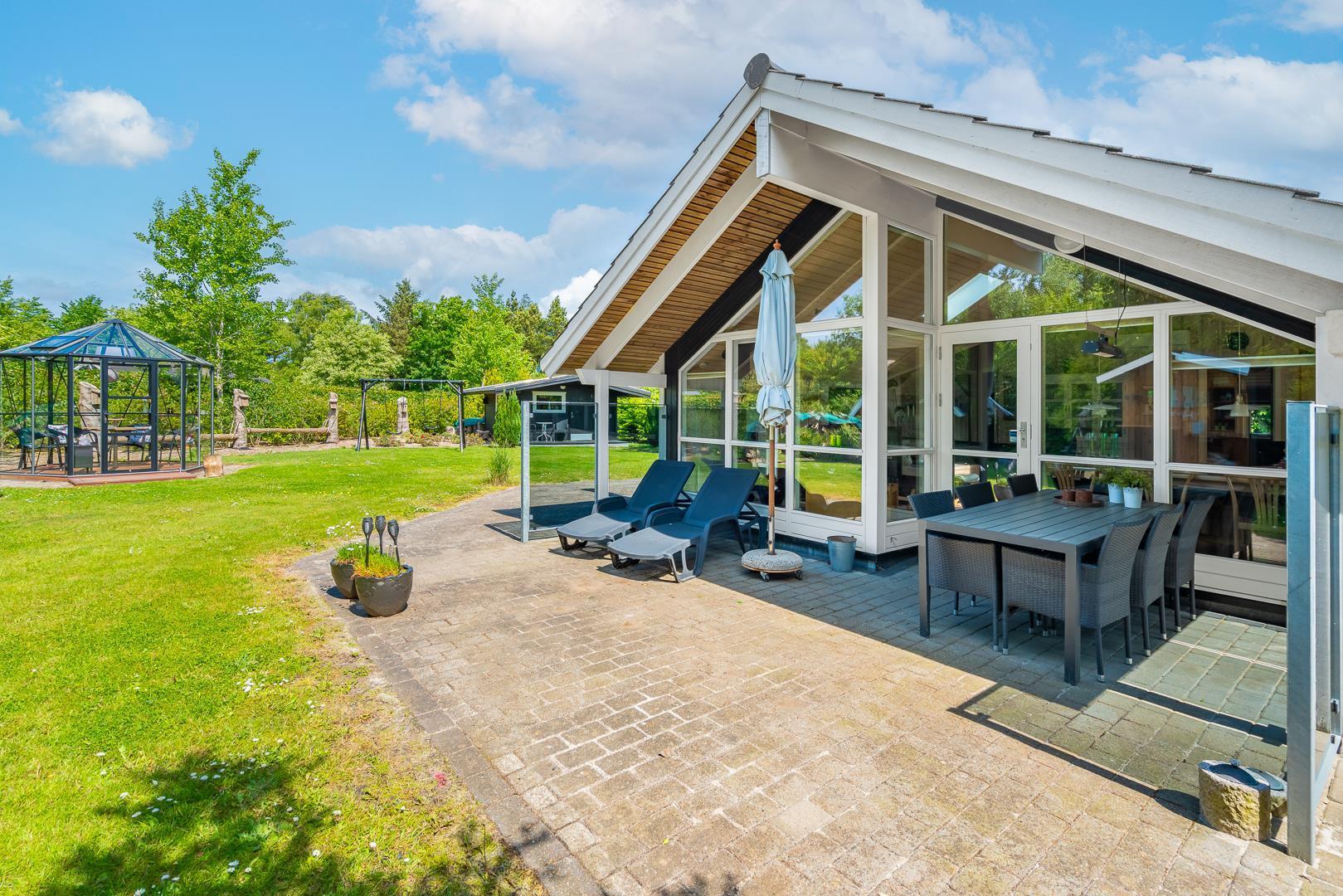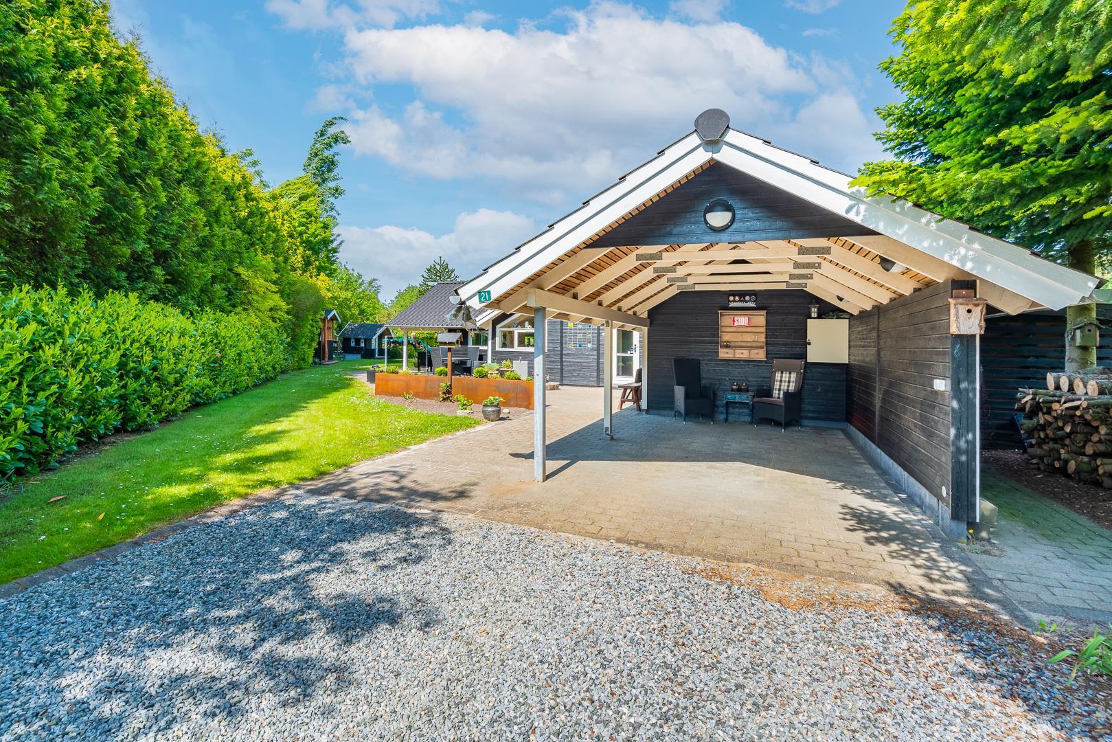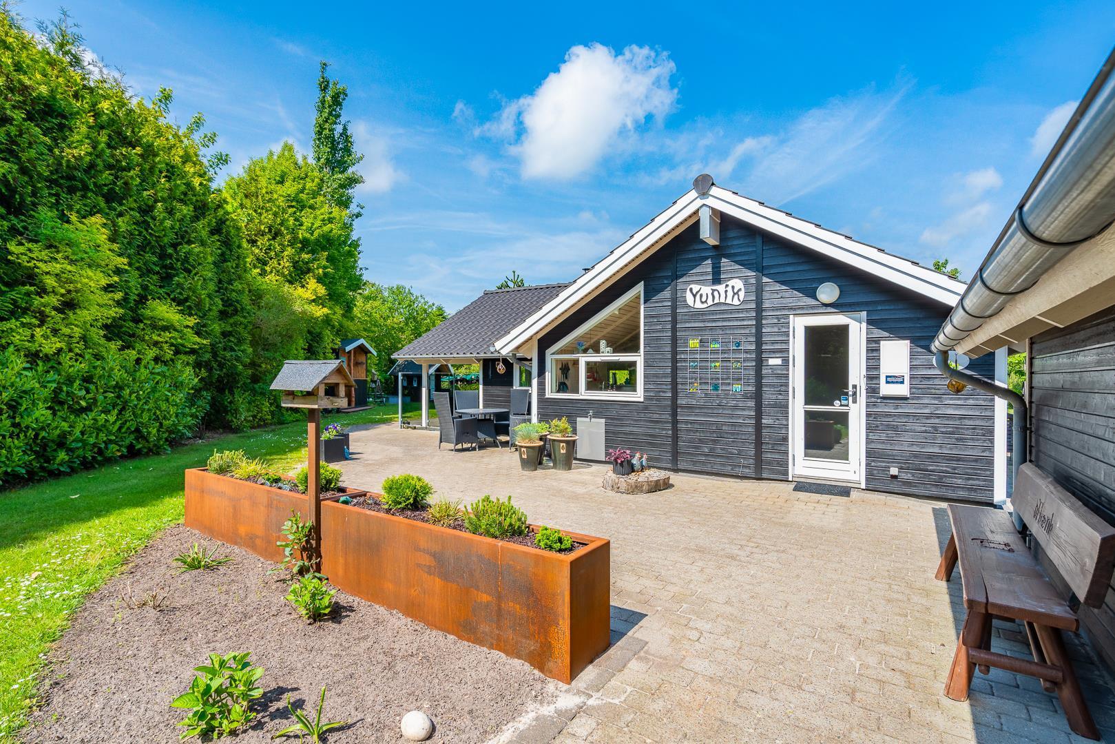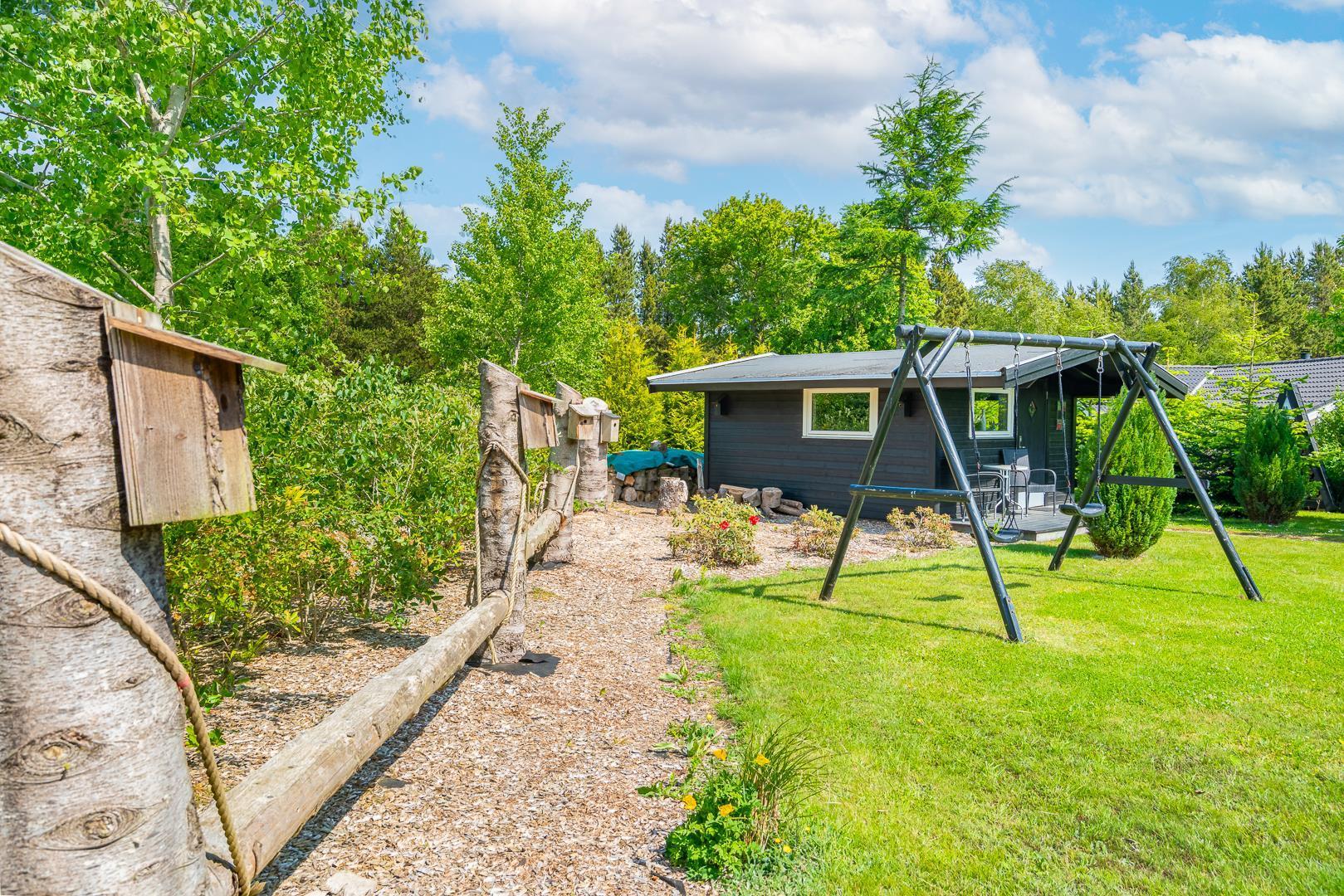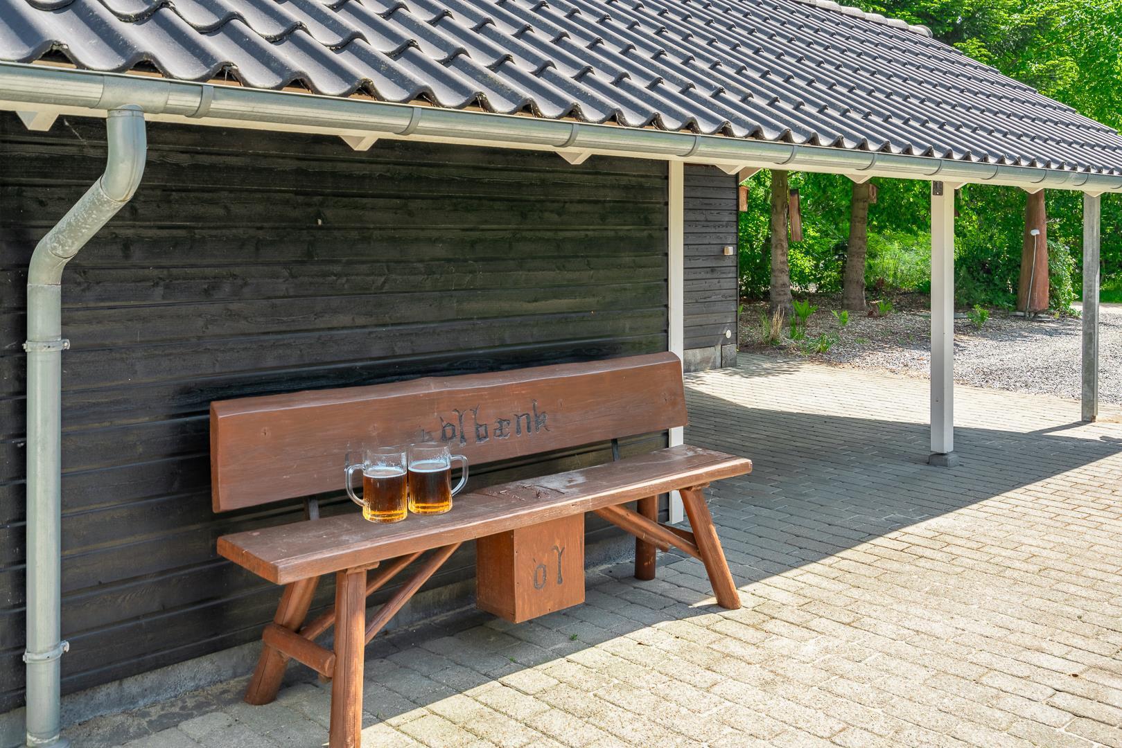 Udendørs kan gæsterne nyde den overdækkede terrasse med bålsted og elektrisk terrassevarmer, gynge og sandkasse til børnene samt gode lækroge, der indbyder til afslapning og hyggelige stunder sammen.